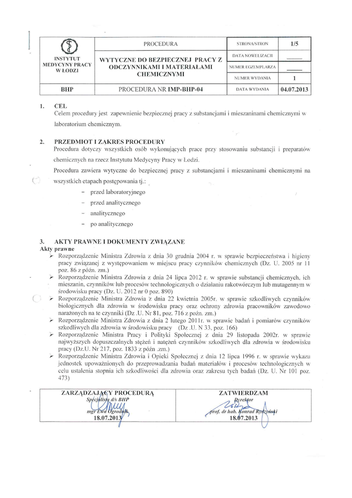 4. ODPOWIEDZIALNOŚĆ Za nadzór nad stosowaniem niniejszej procedury odpowiedzialni są kierownicy komórek organizacyjnych Instytutu Medycyny Pracy, w których występuje narażenie na czynniki chemiczne. 5. DEFINICJA Czynnik chemiczny – każdy pierwiastek chemiczny lub związek chemiczny, w postaci własnej lub w mieszaninie, w stanie, w jakim występuje w przyrodzie, lub w stanie, w jakim jest wytwarzany, stosowany lub uwalniany w środowisku pracy, w tym podczas usuwania go w postaci odpadów, w trakcie każdej pracy, niezależnie od faktu, czy jest albo nie jest wytwarzany celowo lub jest albo nie jest wprowadzany do obrotu; Czynnik chemiczny stwarzający zagrożenie – to czynnik chemiczny, który jest klasyfikowany jako substancja niebezpieczna lub preparat niebezpieczny lub czynnik chemiczny, który nie jest niebezpieczny, ale który z uwagi na swoje właściwości fizykochemiczne lub oddziaływanie na człowieka oraz w sposób, w jaki jest stosowany lub obecny w miejscu pracy, może stwarzać ryzyko dla bezpieczeństwa i zdrowia pracowników. Po tym pojęciem należy rozumieć każdy czynnik chemiczny oraz pył, dla którego zgodnie z odrębnymi przepisami ustalono wartości najwyższych dopuszczalnych stężeń. Zagrożenie czynnikiem chemicznym – swoista właściwość czynnika chemicznego mogącą potencjalnie spowodować szkodę; Ryzyko zawodowe stwarzane przez czynnik chemiczny – prawdopodobieństwo ( możliwość) wystąpienia potencjalnej szkody zdrowotnej w warunkach stosowania czynnika chemicznego lub narażenia na czynnik chemiczny w miejscu pracy; Praca z udziałem czynnika chemicznego – każdą pracę, w której stosuje się lub zamierza się stosować czynnik chemiczny, w jakimkolwiek procesie, łącznie z jego wytwarzaniem, wszelkimi manipulacjami, przechowywaniem, transportem oraz usuwaniem w postacie odpadów i procesami przeróbki odpadów, a także wszelką działalność, która wynika z tej pracy. Wskaźnik narażenia ( ekspozycja) – to wskaźnik liczbowy charakteryzujący ekspozycję pracownika na substancję szkodliwą, obliczony na podstawie wyników oznaczeń w powietrzu, w celu porównania z wartością odpowiedniego normatywu higienicznego. 6. TRYB POSTĘPOWANIA 1. Zasady bezpiecznej pracy z użyciem szkła laboratoryjnego Używanie szkła laboratoryjnego wiąże się z ryzykiem rozbicia, pęknięcia lub zgniecenia. Zdarzeniom takim może towarzyszyć okaleczenie, zwłaszcza nieosłoniętych części ciała ( rąk i twarzy). W fazie przygotowania przedmiotów szklanych i ich używania do prób należy: - sprawdzić całość poszczególnych przedmiotów; należy odrzucić szkło laboratoryjne z rysami, pęknięciami lub wyszczerbieniami brzegów - w razie stwierdzenia uszkodzeń w trakcie wykonywania prób należy wycofać je w dalszego postępowania, a jego zawartość przenieść do nieuszkodzonego naczynia o ile zezwala na to metodyka badania. 2. Zasady bezpiecznej pracy z używaniem odczynnika chemicznego Przy pracy z odczynnikiem chemicznym zabronione jest picie, jedzenie i palenie papierosów ( używek). Personel nie przeszkolony nie powinien mieć kontaktów z odczynnikami chemicznymi. Na ryzyko wypadku z odczynnikami chemicznymi narażone są osoby bez nawyków pracy w laboratorium, dlatego nie powinny one przebywać w pomieszczeniach laboratoryjnych bez nadzoru personelu przeszkolonego W laboratoriach stosowane są odczynniki i substancje chemiczne w postaci substancji stałych, cieczy i gazów. Należy pamiętać, że cechują się one określonym działaniem szkodliwym dla zdrowia i należy zachować bezwzględne warunki bezpieczeństwa przy ich stosowaniu do badań i analiz. 3. Transport odczynników i materiałów chemicznych w laboratorium Stężone kwasy, zasady, substancje żrące, rozpuszczalniki i inne substancje trujące należy przenosić w pojemnikach z kwasoodpornego tworzywa, wysłanych na dnie trocinami lub wiórami drewnianymi; Gazy sprężone w butlach powinny być przewożone na odpowiednich wózkach przez osoby uprawnione, które jednocześnie zobowiązane są do odłączania i podłączania butli; 4. Przechowywanie odczynników i materiałów chemicznych W pracowniach laboratoryjnych wolno trzymać odczynniki i inne substancje chemiczne w ilościach niezbędnych do bieżącej pracy; Pojedyncze opakowania odczynników i materiałów chemicznych po odmierzeniu ilości niezbędnych do prac bieżących należy trzymać w wydzielonych szafkach w odpowiedni sposób oznakowanych; Należy zachować ostrożność i umiejętność otwierania pojemników z odczynnikami i materiałami chemicznymi; Opakowania substancji trujących i odczynników chemicznych używane stale w laboratorium i przechowywane w pobliżu stanowisk pracy ( półki nad stołami laboratoryjnymi, szafki podręczne lub pod dygestorium) powinny być oznakowane w sposób trwały i widoczny, a napis powinien zawierać następujące informacje: - nazwę substancji trującej, a dla mieszaniny nazwy poszczególnych substancji i ich stężeń; - napis ostrzegawczy i znak ostrzegawczy; - napis informujący o szczególnych właściwościach substancji niebezpiecznych dla zdrowia i życia, jeśli substancja wykazuje takie właściwości, i o potrzebie zachowania szczególnych środków ostrożności. Etykiety na pojemnikach z odczynnikami przygotowanymi w laboratorium przeznaczonymi do dłuższego przechowywania, powinny ponadto zawierać: 7. datę przygotowania i /lub datę ważności – jeżeli jest wymagana; nazwisko osoby, która odczynniki przygotowała warunki przechowywania NAKAZY OGÓLNE W PRACY Z UŻYCIEM ODCZYNNIKÓW CHEMICZNYCH W laboratoriach należy bezwzględnie przestrzegać zasady, że prace (przelewanie, odmierzanie, rozcieńczanie) powodujące wydzielanie się par lub gazów szkodliwych dla zdrowia powinny być wykonywane pod dygestorium. Należy pamiętać, że podczas pracy powinny być włączone urządzenia wentylacyjne wywiewne w tym samym p