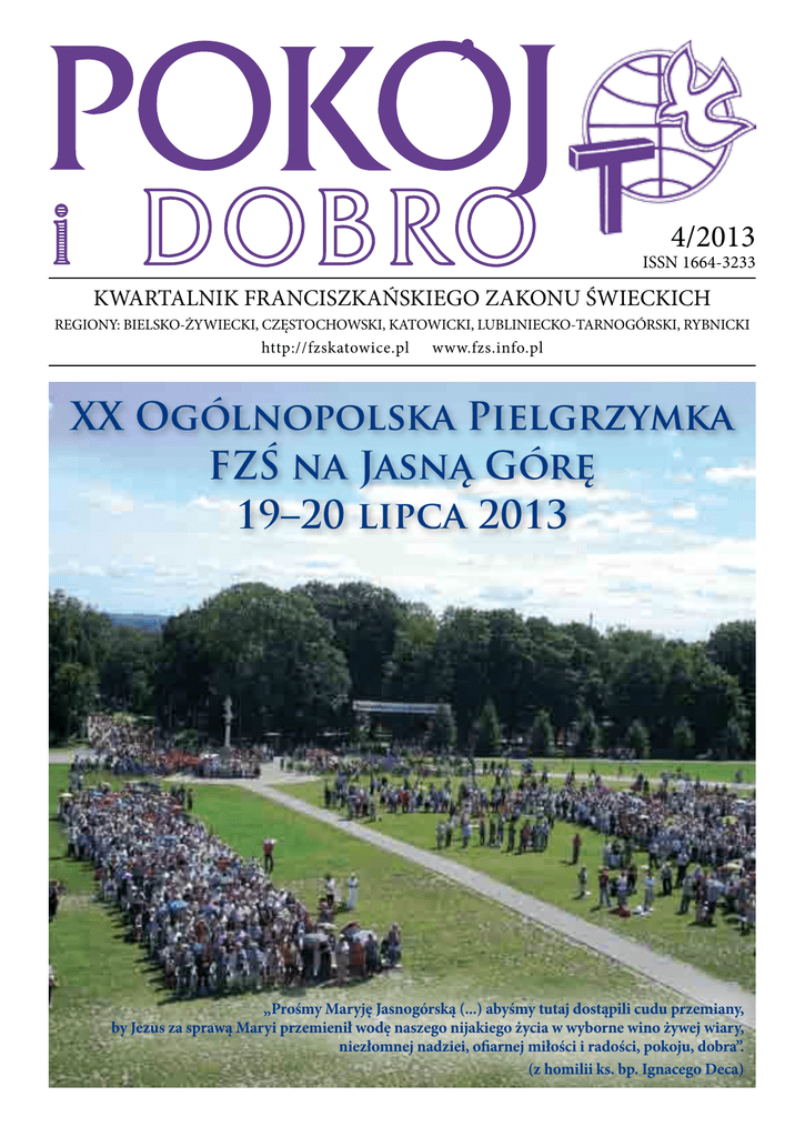 4/2013 1 4/2013 ISSN 1664-3233 KWARTALNIK FRANCISZKAŃSKIEGO ZAKONU ŚWIECKICH REGIONY: BIELSKO-ŻYWIECKI, CZĘSTOCHOWSKI, KATOWICKI, LUBLINIECKO-TARNOGÓRSKI, RYBNICKI http://fzskatowice.pl www.fzs.info.pl XX Ogólnopolska Pielgrzymka FZŚ na Jasną Górę 19–20 lipca 2013 „Prośmy Maryję Jasnogórską (...) abyśmy tutaj dostąpili cudu przemiany, by Jezus za sprawą Maryi przemienił wodę naszego nijakiego życia w wyborne wino żywej wiary, niezłomnej nadziei, ofiarnej miłości i radości, pokoju, dobra”. (z homilii ks. bp. Ignacego Deca) 2 4/2013 Pielgrzymowanie do Pani Jasnogórskiej – 19 i 20 lipca Rekolekcje Rady Regionu Katowickiego w czerwcu w Górkach Wielkich 4/2013 OD REDAKC JI 3 Nie sądził, [Franciszek] że już osiągnął cel, ale niestrudzenie trwał w świętym nastawieniu na nowe, i zawsze chciał zaczynać od początku. Słowo wstępne Na spotkaniu Rady Regionu Katowickiego 10 sierpnia br. – na którym obecny był także prowincjał panewnicki o. Antonin Brząkalik – jeden z punktów obrad dotyczył kwartalnika „Pokój i Dobro”. Planowane były pewne zmiany w jego edytowaniu, niemniej nie powzięto jeszcze ostatecznych decyzji. Pierwsza zmiana dotyczyć będzie niewielkiej korekty cyklu jego ukazywania się. Obecny numer jest ostatni w tym roku, jak dotychczas, a kolejny, pierwszy na 2014 rok, ukaże się dopiero w marcu. W przyszłości poszczególne numery ukazywać się będą pod koniec danego kwartału, tj. 1. w marcu, 2. czerwcu, 3. we wrześniu i 4. w grudniu, ale ten ostatni wyjątkowo z racji świąt na początku miesiąca. W związku z tym osoby, które chcą nadesłać materiały do edycji, powinny to uczynić najpóźniej miesiąc wcześniej od daty ukazania się numeru, czyli do końca lutego, maja, sierpnia i października. W rozmowie z ojcem prowincjałem zaakcentowano rolę asystentów duchowych, a także pewien „głód” wiedzy o tematyce franciszkańskiej, którą z racji limitów czasowych nie zawsze asystenci mogą w większym stopniu przedstawić. Toteż taką rolę pośrednią, by ten „głód” słowa i wiedzy zaspokoić, mógłby pełnić nasz kwartalnik. Zatem jego treść byłaby bardziej ukierunkowana na formację niż na informację. Wydarzenia w poszczególnych wspólnotach są ważne, jednak nie wszystkie w równym stopniu. Dlatego już w tym numerze proponujemy więcej artykułów treściwych pod względem duchowym, a dział „Z życia regionów” zawiera bardziej istotne wydarzenia – odbyte kapituły czy rekolekcje, jubileusze czy peregrynacje... W gazetce byłyby też zamieszczane ważne komunikaty, np. Rady Narodowej, Rady Regionu itp. Kwartalnik nie jest własnością redakcji, tylko nas wszystkich. Zespół redakcyjny odpowiada za jego tworzenie – edycję, by trafił do rąk czytelników i by był wartościowy pod względem treści, no i czytelny. Natomiast co w nim mogłoby się jeszcze znaleźć, jakie zagadnienia artykuły mają poruszać, możecie Siostry i Bracia zaproponować. Na te propozycje i pomysły redakcja czeka do końca listopada, a można je nadsyłać na nowo utworzony adres: [email protected]. Na ten adres można również posyłać teksty do kwartalnika, ale także do brata Janusza jak dotychczas. redakcja Redakcja: Rada Regionalna FZŚ Region Katowicki Przełożona s. Julia Niemiec [email protected] Skład redakcyjny: o. Tobiasz Kołodziejczyk, s. Julia Niemiec, s. Lidia Balcerek, s. Maria Pietyra, br. Janusz Włodarczyk Redakcja zastrzega sobie prawo skracania i adiustacji tekstów oraz zmiany tytułów. Materiały do kwartalnika prosimy przesyłać: br. Janusz Włodarczyk ul. Rolnicza 19 42-500 Będzin lub na e-mail: [email protected] Konto FZŚ Regionu Katowice: ODDZIAŁ I W BYTOMIU ING Bank Śląski Julia Niemiec 26 1050 1634 1000 0090 9534 4082 Za zgodą Ministra Prowincjalnego Prowincji Wniebowzięcia NMP w Katowicach-Panewnikach DTP i druk: FPR „MACGRAF” 40-761 Katowice ul. Panewnicka 91 tel. 32 2046155 e-mail: [email protected] www.macgraf.pl 4 4/2013 R O Z WA Ż A N I A S ŁO WA B O Ż E G O Życie w pokucie franciszkanina świeckiego Potrzeba czujności Uważajcie na siebie, aby wasze serca nie były ociężałe wskutek obżarstwa, pijaństwa i trosk doczesnych, żeby ten dzień nie przyszedł na was znienacka, jak potrzask. Przyjdzie on bowiem na wszystkich, którzy mieszkają na całej ziemi. Czuwajcie więc i módlcie się w każdym czasie, abyście mogli uniknąć tego wszystkiego, co ma nastąpić, i stanąć przed Synem Człowieczym. Łk 21,34-36 Aby zachować czujność, należy stale się doskonalić, stale pracować nad własnymi słabościami. Ćwiczenie karności pozwala nam otworzyć drzwi Chrystusowi krótko po tym, jak do nich zapuka. A karność zdobywamy dzięki wytrwałym wyrzeczeniom oraz pokucie. Z takim ćwiczeniem duchowym, cielesnym wiąże się najstarsza nazwa naszego zakonu: „bracia i siostry od pokuty”. Jest to jeden z naszych charyzmatów. To wcale nie znaczy, że mamy „oblec się w wory i siąść na popiele” – czynności pokutne używane na Bliskim Wschodzie (Jon 3,6). Jezus nam polecił, jak mamy pościć, w Kazaniu na Górze: namaścić głowę, umyć twarz i nie pokazywać tego ludziom (por. Mt 6,17). Pokuta wiąże się z postem. A ten nie zawsze jest mile widziany. Papież Mikołaj IV w naszej regule z 1289 roku poświęcił postom rozdziały V i XVIII. Reguła Leona XIII nie nakazywała, ale zalecała zachowywanie postu dwa dni w tygodniu, środy i piątki, tradycję zachowywaną przez niektórych z naszych braci i sióstr w XIX wieku. Postu, który obecnie widziany jest jako bardzo surowy. Uczniowie Jezusa otrzymali władzę wypędzania złych duchów. I wypędzali je. Lecz kiedyś zdarzyło się, że zły duch nie odszedł. Potrzebna była interwencja samego Jezusa. Uczniowie mieli zbyt mało wiary. Kiedy pytali się o przyczynę swego niepowodzenia, Jezus odpowiedział im: Ten zaś rodzaj złych duchów wypędza się ty