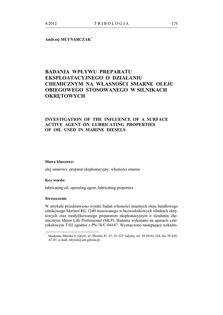 4-2012 TRIBOLOGIA 175 Andrzej MŁYNARCZAK * BADANIA WPŁYWU PREPARATU EKSPLOATACYJNEGO O DZIAŁANIU CHEMICZNYM NA WŁASNOŚCI SMARNE OLEJU OBIEGOWEGO STOSOWANEGO W SILNIKACH OKRĘTOWYCH INVESTIGATION OF THE INFLUENCE OF A SURFACE ACTIVE AGENT ON LUBRICATING PROPERTIES OF OIL USED IN MARINE DIESELS Słowa kluczowe: olej smarowy, preparat eksploatacyjny, własności smarne Key words: lubricating oil, operating agent, lubricating properties Streszczenie W artykule przedstawiono wyniki badań własności smarnych oleju handlowego silnikowego Marinol RG 1240 stosowanego w bezwodzikowych silnikach okrętowych oraz modyfikowanego preparatem eksploatacyjnym o działaniu chemicznym Motor Life Professional (MLP). Badania wykonano na aparacie czterokulowym T-02 zgodnie z PN-76/C-04147. Wyznaczono następujące wskaźni* Akademia Morska w Gdyni, ul. Morska 81–87, 81-225 Gdynia, tel. 58 69-01-324, fax 58 620-67-01. e-mail: [email protected]. 176 TRIBOLOGIA 4-2012 ki własności smarnych: obciążenie zespawania Pz, obciążenie zacierające Pt, obciążenie niezacierające Pn, wskaźnik zużycia pod obciążeniem Ih oraz graniczne obciążenie zużycia Goz. Modyfikowanie oleju preparatem eksploatacyjnym Motor Life Professional w zdecydowany sposób wpłynęło na zwiększenie odporności na zużycie i poprawę własności przeciwzatarciowych środka smarowego (wzrost Goz oraz Ih). Pozostałe wskaźniki (Pz, Pt) pozostały na tym samym lub nieco niższym poziomie (Pn). WPROWADZENIE Oleje smarowe charakteryzują się coraz lepszą jakością. Poprawę jakości uzyskuje się dzięki dodatkom uszlachetniającym będącym ich integralną częścią. Mimo to, w ekstremalnych warunkach pracy systemów tribologicznych (wysokie naciski, prędkości względne, temperatury, chwilowy brak smarowania np. podczas rozruchu) elementy tych systemów nie są dostatecznie chronione. W związku z tym w ostatnich latach pojawiła się idea wprowadzenia do węzła tarcia wraz z olejem dodatkowej substancji – preparatu eksploatacyjnego. W literaturze przedmiotowej oraz informacjach producentów prezentowane są skrajne opinie dotyczące działania preparatów eksploatacyjnych – od szkodliwości, poprzez znikomą skuteczność do efektywności i dużego znaczenia techniczno-ekonomicznego oraz ekologicznego [L. 1, 5, 7]. Tak odmienne opinie wynikają z dużej różnorodności preparatów eksploatacyjnych i różnych mechanizmów ich działania. Obecnie najszersze zastosowanie znajdują preparaty o działaniu chemicznym. Preparaty te łączą się trwale z olejem, zatem nie osadzają się na filtrach i nie tworzą warstw termoizolacyjnych, czego nie można powiedzieć o preparatach zawierających w swym składzie cząstki środków smarnych stałych. Wyniki badań prezentowane w pracach [L. 2–4] (nie uzyskano zdecydowanej poprawy wskaźników własności smarnych, oprócz Pz i Goz, które świadczą o pozytywnym wpływie preparatu eksploatacyjnego w ekstremalnych warunkach pracy) mogą sugerować, iż w przypadku olejów silnikowych wyposażonych przez producenta w pakiety dodatków przeciwzużyciowych (AW) i przeciwzatarciowych (EP) zasadność stosowania preparatów eksploatacyjnych może budzić wątpliwości. W niniejszej pracy podjęto próbę oceny wpływu preparatu eksploatacyjnego o działaniu chemicznym na własności smarne oleju obiegowego Marinol RG 1240 stosowanego w bezwodzikowych silnikach okrętowych. STANOWISKO BADAWCZE I METODYKA BADAŃ Do przeprowadzenia badań tribologicznych użyto aparat czterokulowy T-02, wyposażony we wspomagane komputerowo systemy sterowania i pomiarów. Węzeł tarcia (Rys. 1) składał się z czterech kulek ze stali 100 Cr6 o średnicy 12,7 mm, chropowatości powierzchni Ra = 0,032 µm i twardości według 4-2012 TRIBOLOGIA 177 Rockwella 60 HRC. Badania przeprowadzono dla oleju silnikowego Marinol RG1240 (lepkość kinematyczna w temp. 100°C – 15 mm2/s, wskaźnik lepkości – min. 90) stosowanego do smarowania łożysk oraz tulei cylindrowych bezwodzikowych silników okrętowych. Olej ten modyfikowano 5% (w stosunku objętościowym) preparatem eksploatacyjnym o działaniu chemicznym – Motor Life Professional (MLP). MLP składa się ze związków grupy ditiofosforanów cynku, alkilowych, pierwszo- i drugorzędowych, siarczków organicznych, nadzasadowych sulfonianów magnezu, kwasów alkenobursztynowych, siarkowanych kwasów tłuszczowych, polimetylosiloksanów, alkilometakrylanów, kopolimerów etylenowo-propylenowych, mieszaniny syntetycznych estrów poliolowych wywodzących się z alkoholi wielowodorotlenowych, inhibitorów korozji, inhibitorów utlenienia. Charakteryzuje się dużym ciężarem cząsteczkowym oraz wysoką stabilnością chemiczną i termiczną [L. 6]. 3 1 2 4 Rys. 1. Schemat węzła tarcia: 1 – kulka górna, 2 – kulki dolne, 3 – uchwyt kulki, 4 – gniazdo kulek [L. 9] Fig. 1. Scheme of the friction pair: 1 – top ball, 2 – lower balls, 3 – top ball holder, 4 – lower balls seat [L. 9] Według [L. 8] wyznaczono następujące wskaźniki własności smarnych: obciążenie zespawania Pz, wskaźnik zużycia pod obciążeniem Ih, obciążenie niezacierające Pn, obciążenie zacierające Pt oraz graniczne obciążenie zużycia Goz. Wyznaczenie wskaźników Pn, Ih, Pz odbywało się przy narastającym skokowo obciążeniu aż do momentu zespawania kulek. Wyznaczenie wskaźnika Pt odbywało się pod wzrastającym w sposób ciągły obciążeniem (zaczynającym się od obciążenia równego zero) aż do uzyskania gwałtownego wzrostu oporów ruchu definiowanego jako początek zacierania. 178 TRIBOLOGIA 4-2012 WYNIKI BADAŃ I ICH ANALIZA Wyniki badań własności smarnych oleju silnikowego Marinol RG1240 oraz modyfikowanego preparatem eksploatacyjnym Motor Life Professional przedstawiono na Rys. 2–4. Obciążenie zespawania Pz i obciążenie zacierające P\t nie zmieniły się, obciążenie niezacierające P\n nieznacznie spadło, natomiast wzr