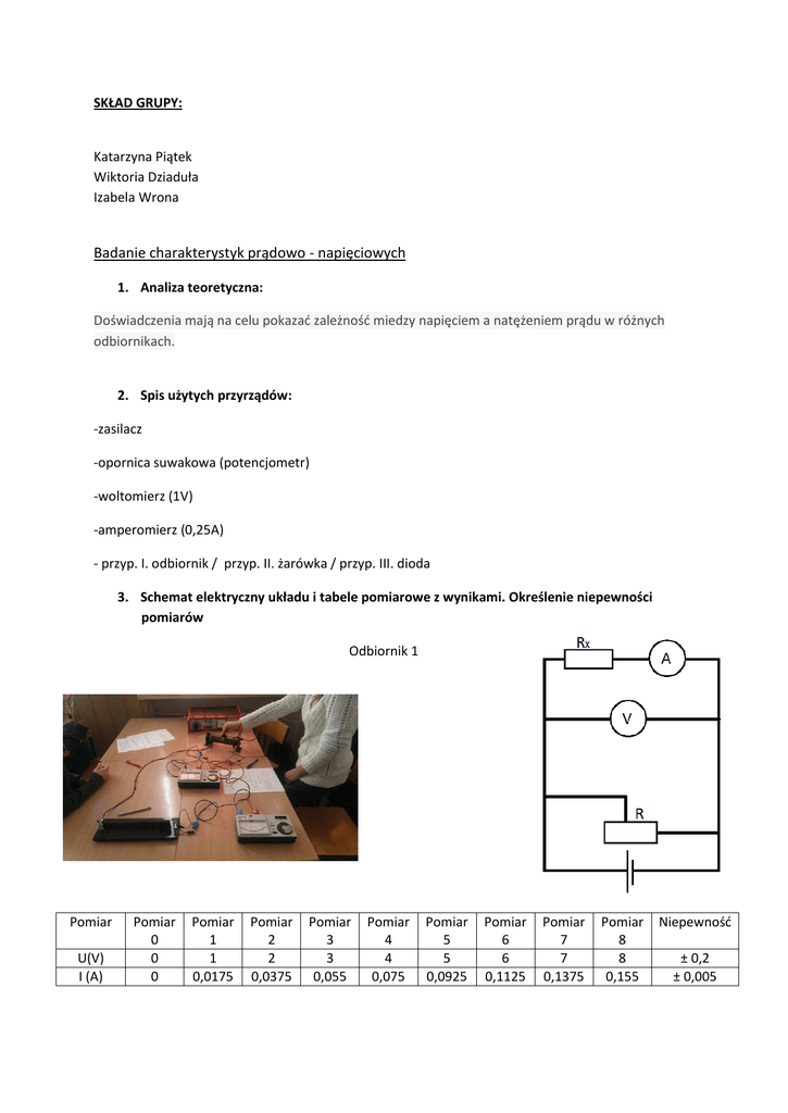 SKŁAD GRUPY: Katarzyna Piątek Wiktoria Dziaduła Izabela Wrona Badanie charakterystyk prądowo - napięciowych 1. Analiza teoretyczna: Doświadczenia mają na celu pokazać zależność miedzy napięciem a natężeniem prądu w różnych odbiornikach. 2. Spis użytych przyrządów: -zasilacz -opornica suwakowa (potencjometr) -woltomierz (1V) -amperomierz (0,25A) - przyp. I. odbiornik / przyp. II. żarówka / przyp. III. dioda 3. Schemat elektryczny układu i tabele pomiarowe z wynikami. Określenie niepewności pomiarów Odbiornik 1 Pomiar U(V) I (A) Pomiar 0 0 0 Pomiar 1 1 0,0175 Pomiar 2 2 0,0375 Pomiar 3 3 0,055 Pomiar 4 4 0,075 Pomiar 5 5 0,0925 Pomiar 6 6 0,1125 Pomiar 7 7 0,1375 Pomiar 8 8 0,155 Niepewność ± 0,2 ± 0,005 Żarówka Pomiar U(V) I (A) Pomiar 0 0 0 Pomiar 1 1 0,19 Pomiar 2 2 0,25 Pomiar 3 3 0,3 Pomiar 4 4 0,35 Pomiar 5 5 0,39 Pomiar 6 6 0,44 Pomiar 7 7 0,48 Pomiar 8 8 0,51 Niepewność ± 0,2 ± 0,02 Dioda Pomiar U(V) I (A) Pomiar 0 0 0 Pomiar 1 0,5 0,01 Pomiar 2 1 0,28 Pomiar 3 1,5 0,74 Pomiar 4 1,75 1 Niepewność ±0,05 ±0,02 4. Sporządzenie wykresów dla każdego odbiornika I(U) z zaznaczeniem niepewności 5. Wnioski W przypadku I. (odbiornik), przy uwzględnieniu niepewności, wyniki pomiarów jednoznacznie wskazują, że zachodzi prawo Ohma, tzn. że napięcie prądu płynącego przez przewodnik jest proporcjonalne do przyłożonego napięcia. Natomiast w przypadku II. (żarówka) zależność między napięciem a natężeniem nie jest liniowa.(Ponieważ w wyniku przepływu prądu elektrycznego włókno żarówki się nagrzewa, a tym samym rośnie jej opór elektryczny). W przypadku III. (dioda) zależność między napięciem a natężeniem nie jest liniowa. (Przy małym wzroście napięcia gwałtownie rośnie natężenie). Prawo Kirchoffa 1. Analiza teoretyczna Doświadczenie ma na celu pokazać że, suma natężeń prądów wpływających do rozgałęzienia, równa jest sumie natężeń prądów wypływających z tego rozgałęzienia. Σ I wpływające = Σ I wypływające 2. Spis użytych przyrządów: -zasilacz -opornik -amperomierz (1A) -3x amperomierz (500mA) -3x żarówki 3. Schemat elektryczny układu i tabele pomiarowe z wynikami. Określenie niepewności pomiarów natężenia prądu na podstawie dokładności mierników Pomiar I(A) (A) (A) (A) Pomiar 1 0,73 0,35 0,19 0,19 Pomiar 2 0,62 0,29 0,16 0,16 Pomiar 3 0,50 0,23 0,12 0,13 Pomiar 4 0,36 0,16 0,09 0,09 Pomiar 5 0,28 0,13 0,06 0,07 Niepewność ±0,02 ±0,01 ±0,01 ±0,01 4. Obliczenia Pomiar 1 Pomiar 2 Pomiar 3 0,52 Pomiar 4 0,38 Pomiar 5 5. Wnioski Dla każdego z pomiarów nakładają się na siebie dwa przedziały: ( i Otrzymane wyniki, uwzględniające niepewności pomiarowe, pokazują że suma natężeń prądów wpływających (do rozgałęzienia) jest równa sumie natężeń prądów wypływających (I prawo Kirchoffa).