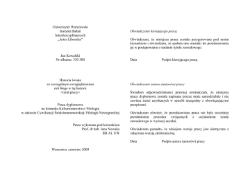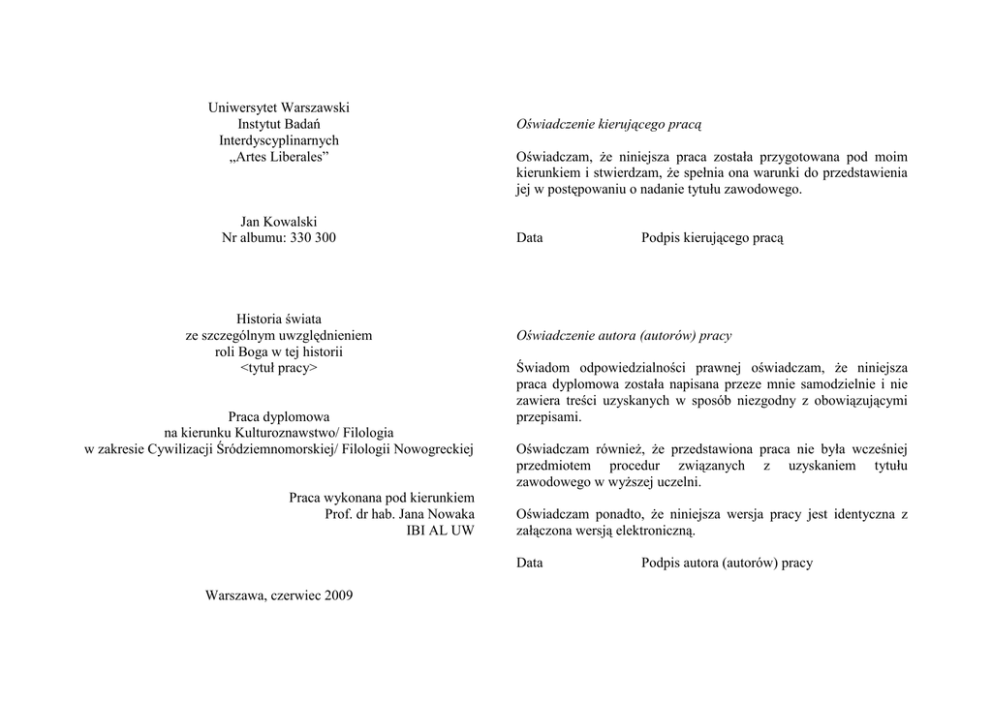 Uniwersytet Warszawski Instytut Badań Interdyscyplinarnych „Artes Liberales” Jan Kowalski Nr albumu: 330 300 Historia świata ze szczególnym uwzględnieniem roli Boga w tej historii <tytuł pracy> Praca dyplomowa na kierunku Kulturoznawstwo/ Filologia w zakresie Cywilizacji Śródziemnomorskiej/ Filologii Nowogreckiej Praca wykonana pod kierunkiem Prof. dr hab. Jana Nowaka IBI AL UW Oświadczenie kierującego pracą Oświadczam, Ŝe niniejsza praca została przygotowana pod moim kierunkiem i stwierdzam, Ŝe spełnia ona warunki do przedstawienia jej w postępowaniu o nadanie tytułu zawodowego. Data Oświadczenie autora (autorów) pracy Świadom odpowiedzialności prawnej oświadczam, Ŝe niniejsza praca dyplomowa została napisana przeze mnie samodzielnie i nie zawiera treści uzyskanych w sposób niezgodny z obowiązującymi przepisami. Oświadczam równieŜ, Ŝe przedstawiona praca nie była wcześniej przedmiotem procedur związanych z uzyskaniem tytułu zawodowego w wyŜszej uczelni. Oświadczam ponadto, Ŝe niniejsza wersja pracy jest identyczna z załączona wersją elektroniczną. Data Warszawa, czerwiec 2009 Podpis kierującego pracą Podpis autora (autorów) pracy Streszczenie <krótkie (maksymalnie 800 znaków) streszczenie pracy> Słowa kluczowe <wykaz maksymalnie 10 słów swobodnie wybranych> Dziedzina pracy (kody wg programu Sokrates-Erasmus) <numer kodowy i nazwa > 09 100 NowoŜytne języki europejskie –dla filologii nowogreckiej 14 700 Antropologia dla kulturoznawstwa Tytuł pracy w języku angielskim <tytuł pracy w tłumaczeniu na język angielski>