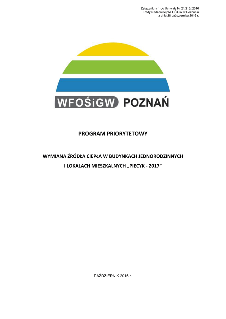 Załącznik nr 1 do Uchwały Nr 21/213/.2016 Rady Nadzorczej WFOŚiGW w Poznaniu z dnia 28 października 2016 r. PROGRAM PRIORYTETOWY WYMIANA ŹRÓDŁA CIEPŁA W BUDYNKACH JEDNORODZINNYCH I LOKALACH MIESZKALNYCH „PIECYK - 2017” PAŹDZIERNIK 2016 r. Program Priorytetowy Wymiana źródła ciepła w budynkach jednorodzinnych i lokalach mieszkalnych „PIECYK – 2017” 1. Cel Programu Celem Programu jest poprawa efektywności energetycznej w sektorze mieszkaniowym poprzez modernizację/ wymianę źródła ciepła w budynkach jednorodzinnych lub lokalach mieszkalnych na obszarze województwa wielkopolskiego, a w konsekwencji ograniczenie lub uniknięcie emisji dwutlenku węgla (CO2). 2. Wskaźniki osiągnięcia celu Ograniczenie lub uniknięcie emisji CO2 co najmniej o 300 Mg/rok, przy założeniu pełnego wykorzystania budżetu Programu. 3. Budżet Na realizację celu Programu przeznacza się kwotę w wysokości do 5 000 000,00 zł. 4. Okres wdrażania 1. Program realizowany będzie w latach 2017-2019, przy czym: 1) umowy pożyczki będą zawierane do końca 2017 r., 2) wypłata środków będzie następować do końca 2019 r. 2. Termin zakończenia realizacji przedsięwzięcia objętego maksymalnie 12 miesięcy od daty zawarcia umowy pożyczki. pomocą finansową wynosi 5. Beneficjenci Osoby fizyczne. 6. Rodzaje przedsięwzięć Modernizacja/ wymiana źródła ciepła wraz z ewentualną modernizacją/ wymianą instalacji c.o. i c.w.u., w tym zakup i montaż: kotłów olejowych, kotłów gazowych, kotłów gazowo-olejowych, ogrzewania elektrycznego, wymiennika ciepła / węzła cieplnego, kotłów na paliwa stałe, przy czym, w przypadku kotłów opalanych paliwami stałymi - muszą one spełniać następujące warunki: posiadać certyfikat zgodności z normą PN-EN 303-5:2012 „Kotły grzewcze - Część 5: Kotły grzewcze na paliwa stałe z ręcznym i automatycznym zasypem paliwa o mocy nominalnej do 500 kW - Terminologia, wymagania, badania i oznakowanie” lub równoważną, wydany przez właściwą jednostkę certyfikującą, 2/5 Program Priorytetowy Wymiana źródła ciepła w budynkach jednorodzinnych i lokalach mieszkalnych „PIECYK – 2017” spełniać wymagania klasy 5. 7. Koszty kwalifikowane 1. Za kwalifikowane mogą być uznane koszty poniesione od momentu złożenia wniosku o udzielenie pomocy finansowej do dnia 31.12.2018 r. 2. Kosztami kwalifikowanymi przedsięwzięcia mogą być jedynie koszty w bezpośrednim związku z celami przedsięwzięcia objętego pomocą finansową. pozostające 3. Koszty kwalifikowane przedsięwzięcia mogą obejmować: 1) zakup, montaż i uruchomienie fabrycznie nowych materiałów i urządzeń związanych z modernizacją źródła emisji, w tym: kotłów wraz z osprzętem, wkładów kominowych, materiałów do wykonania węzła cieplnego, materiałów do wykonania ogrzewania elektrycznego, 2) roboty budowlano-montażowe związane z oprzyrządowaniem, w tym montaż: urządzeń wraz z osprzętem, wkładów kominowych, z modernizacją źródła emisji wraz 3) wykonanie przyłącza gazu do kotłowni wraz z wewnętrzną instalacją gazową, 4) wewnętrzną instalację centralnego ogrzewania i c.w.u., 5) wykonanie instalacji elektrycznej związanej z montażem ogrzewania elektrycznego, 6) rozruch mechaniczny i technologiczny, 7) podatek od towarów i usług (VAT), jeżeli Wnioskodawca nie ma prawnej możliwości jego odliczenia lub odzyskania, 8) koszt wykonania dokumentacji projektowej (jeżeli jest wymagana). 4. Maksymalna łączna wysokość kosztów kwalifikowanych w ramach kosztów wskazanych w punkcie 7.3 pp. 8) nie może przewyższać 10% łącznych kosztów kwalifikowanych przedsięwzięcia. 5. Pomoc finansowa może zostać udzielona na przedsięwzięcie, które nie zostało zakończone przed dniem złożenia wniosku o udzielenie pomocy finansowej. 8. Terminy i sposób składania wniosków Termin, sposób składania i rozpatrywania wniosków, określony zostanie odpowiednio w ogłoszeniu o naborze lub w regulaminie naboru, który zamieszczony będzie na stronie internetowej Funduszu. 9. Szczegółowe zasady udzielania pomocy finansowej 3/5 Program Priorytetowy Wymiana źródła ciepła w budynkach jednorodzinnych i lokalach mieszkalnych „PIECYK – 2017” Poniższe szczegółowe zasady wynikają z „Zasad udzielania i umarzania pożyczek oraz trybu i zasad udzielania i rozliczania dotacji ze środków WFOŚiGW w Poznaniu w roku 2017”: 1. Formy pomocy finansowej Pożyczka z możliwością umorzenia do 40%. 2. Intensywność pomocy finansowej Do 100% kosztów kwalifikowanych. 3. Warunki pomocy finansowej 1) Oprocentowanie w wysokości 0,5 s.r.w. w stosunku rocznym, lecz nie mniej niż 2,8 % w stosunku rocznym. Odsetki z tytułu oprocentowania spłacane są na bieżąco w okresach miesięcznych. 2) Minimalny okres spłaty pożyczki wraz z należnymi odsetkami wynosi 2 lata od wypłaty ostatniej transzy pożyczki. W przypadku wcześniejszej całkowitej spłaty pożyczki wraz z należnymi odsetkami, nie będzie ona podlegać umorzeniu. 3) Maksymalny okres trwania umowy pożyczki wynosi 15 lat od daty jej zawarcia. 4) Karencja w spłacie rat kapitałowych pożyczki nie może być dłuższa niż 3 miesiące od daty zakończenia przedsięwzięcia określonej w umowie pożyczki. 5) Pożyczka może podlegać częściowemu umorzeniu po spłacie 60% wypłaconej kwoty pożyczki na warunkach wskazanych w ogłoszeniu o naborze lub w regulaminie naboru, który zamieszczony będzie na stronie internetowej Funduszu. 6) Wypłata pierwszej transzy pożyczki nastąpi nie wcześniej, niż po przedłożeniu faktury wystawionej przez wykonawcę przedsięwzięcia. 7) W przypadkach, gdy pomoc finansowa stanowi pomoc publiczną, udzielana będzie zgodnie z zasadami udzielania pomocy publicznej. 10. Kryteria oceny wniosków Kryteria oceny wniosków wynikają z Kryteriów wyboru przedsięwzięć finansowanych ze środków Wojewódzkiego Funduszu Ochrony Śro