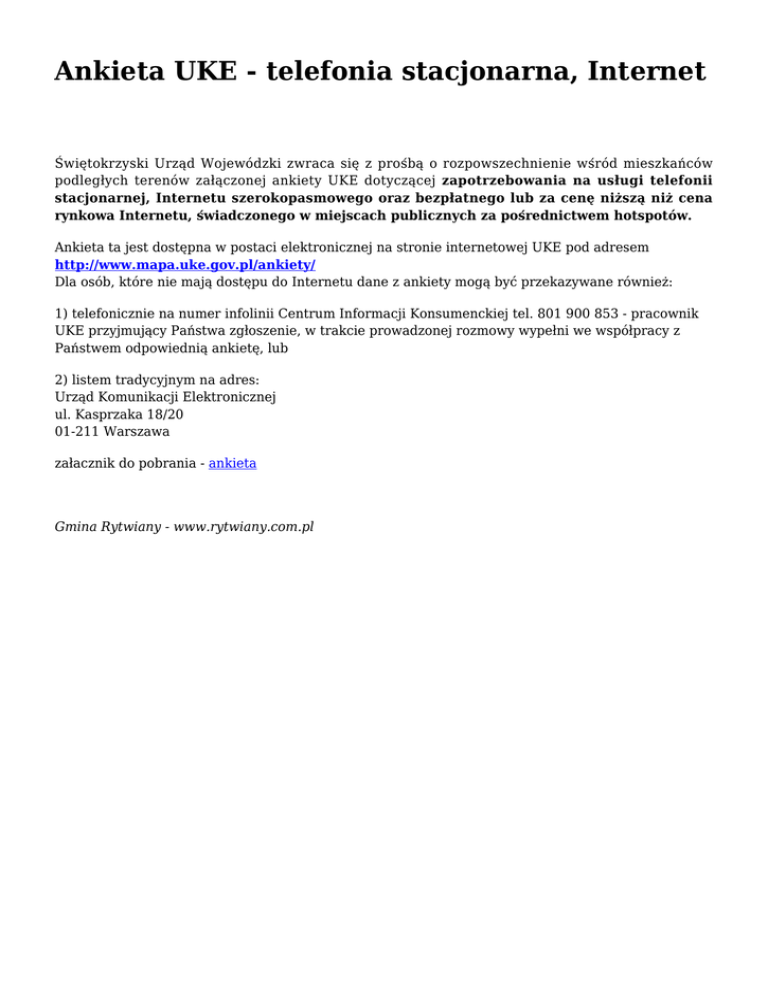 Ankieta UKE - telefonia stacjonarna, Internet Świętokrzyski Urząd Wojewódzki zwraca się z prośbą o rozpowszechnienie wśród mieszkańców podległych terenów załączonej ankiety UKE dotyczącej zapotrzebowania na usługi telefonii stacjonarnej, Internetu szerokopasmowego oraz bezpłatnego lub za cenę niższą niż cena rynkowa Internetu, świadczonego w miejscach publicznych za pośrednictwem hotspotów. Ankieta ta jest dostępna w postaci elektronicznej na stronie internetowej UKE pod adresem http://www.mapa.uke.gov.pl/ankiety/ Dla osób, które nie mają dostępu do Internetu dane z ankiety mogą być przekazywane również: 1) telefonicznie na numer infolinii Centrum Informacji Konsumenckiej tel. 801 900 853 - pracownik UKE przyjmujący Państwa zgłoszenie, w trakcie prowadzonej rozmowy wypełni we współpracy z Państwem odpowiednią ankietę, lub 2) listem tradycyjnym na adres: Urząd Komunikacji Elektronicznej ul. Kasprzaka 18/20 01-211 Warszawa załacznik do pobrania - ankieta Gmina Rytwiany - www.rytwiany.com.pl