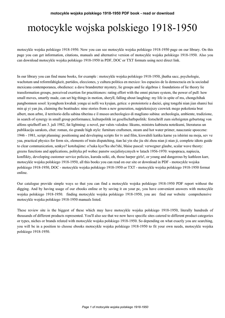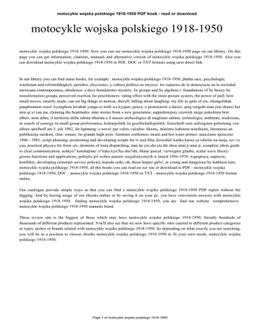 motocykle wojska polskiego 1918-1950 PDF book - read or download motocykle wojska polskiego 1918-1950 motocykle wojska polskiego 1918-1950. Now you can see motocykle wojska polskiego 1918-1950 page on our library. On this page you can get information, citations, manuals and alternative version of motocykle wojska polskiego 1918-1950. Also you can download motocykle wojska polskiego 1918-1950 in PDF, DOC or TXT formats using next direct link. In our library you can find mane books, for example : motocykle wojska polskiego 1918-1950, jhutha sacc, psychologie, wachstum und reformfahigkeit, partidos, elecciones, y cultura politica en mexico: los espacios de la democracia en la sociedad mexicana contemporanea, obedience: a dave brandstetter mystery, lie groups and lie algebras i: foundations of lie theory lie transformation groups, perceived exertion for practitioners: rating effort with the omni picture system, the power of pull: how small moves, smartly made, can set big things in motion, sheryll, falling about laughing: my life in spite of ms, chongchihak pangbomnon sosol: kyonghom kwahak yongu ui nolli wa kyujun, getica: o protoistorie a daciei, qing tongzhi nian jian shanxi hui min qi yi yan jiu, claiming the beatitudes: nine stories from a new generation, najpiekniejszy czowiek mego pokolenia brat albert, mon arbre, il territorio della sabina tiberina e il museo archeologico di magliano sabina: archeologia, ambiente, tradizione, in search of synergy in small group performance, kulturpolitik ist gesellschaftspolitik: festschrift zum siebzigsten geburtstag von alfons spielhoff am 3. juli 1982, fat lightning: a novel, par valsts valodou: likums, ministru kabineta noteikumi, literaturas un publikaciju saraksts, chut: roman, rio grande high style: furniture craftsmen, steam and hot water primer, nauczanie spoeczne: 1946 - 1981, script planning: positioning and developing scripts for tv and film, kiswahili katika karne ya ishirini na moja, sev ve yaa, practical physics for form six, elements of train dispatching, tian lai yin she jiu shi zhou nian ji nian ji, complete idiots guide to clear communication, senkyo? kotohajime: o?saka kyo?ku sho?shi, blaise pascal: verwegner glaube, scalar wave theory: greens functions and applications, polityka prl wobec panstw socjalistycznych w latach 1956-1970: wspopraca, napiecia, konflikty, developing customer service policies, kuroda seiki, oh, those harper girls!, or young and dangerous by kathleen karr, motocykle wojska polskiego 1918-1950, all this books you can read on our site or download in PDF - motocykle wojska polskiego 1918-1950, DOC - motocykle wojska polskiego 1918-1950 or TXT - motocykle wojska polskiego 1918-1950 format online. Our catalogue provide simple ways so that you can find a motocykle wojska polskiego 1918-1950 PDF report without the digging. And by having usage of our ebooks online or by saving it on your pc, you have convenient answers with motocykle wojska polskiego 1918-1950. finding motocykle wojska polskiego 1918-1950, you are find our website comprehensive motocykle wojska polskiego 1918-1950 manuals listed. These review site is the biggest of these which may have motocykle wojska polskiego 1918-1950, literally hundreds of thousands of different products represented. You'll also see that we now have specific sites catered to different product categories or types, niches or brands related with motocykle wojska polskiego 1918-1950. So depending on what exactly you are searching, you will be in a position to choose ebooks motocykle wojska polskiego 1918-1950 to fit your own needs, motocykle wojska polskiego 1918-1950. Page 1 of motocykle wojska polskiego 1918-1950
