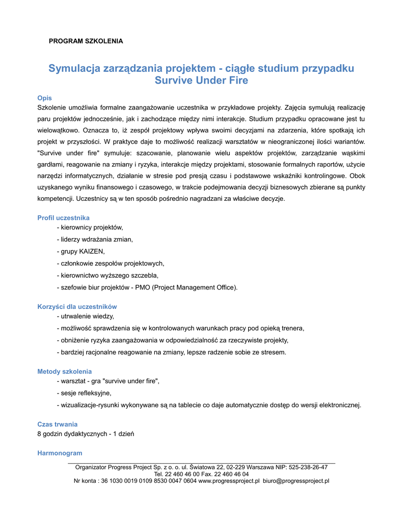 PROGRAM SZKOLENIA Symulacja zarządzania projektem - ciągłe studium przypadku Survive Under Fire Opis Szkolenie umożliwia formalne zaangażowanie uczestnika w przykładowe projekty. Zajęcia symulują realizację paru projektów jednocześnie, jak i zachodzące między nimi interakcje. Studium przypadku opracowane jest tu wielowątkowo. Oznacza to, iż zespół projektowy wpływa swoimi decyzjami na zdarzenia, które spotkają ich projekt w przyszłości. W praktyce daje to możliwość realizacji warsztatów w nieograniczonej ilości wariantów. "Survive under fire" symuluje: szacowanie, planowanie wielu aspektów projektów, zarządzanie wąskimi gardłami, reagowanie na zmiany i ryzyka, interakcje między projektami, stosowanie formalnych raportów, użycie narzędzi informatycznych, działanie w stresie pod presją czasu i podstawowe wskaźniki kontrolingowe. Obok uzyskanego wyniku finansowego i czasowego, w trakcie podejmowania decyzji biznesowych zbierane są punkty kompetencji. Uczestnicy są w ten sposób pośrednio nagradzani za właściwe decyzje. Profil uczestnika - kierownicy projektów, - liderzy wdrażania zmian, - grupy KAIZEN, - członkowie zespołów projektowych, - kierownictwo wyższego szczebla, - szefowie biur projektów - PMO (Project Management Office). Korzyści dla uczestników - utrwalenie wiedzy, - możliwość sprawdzenia się w kontrolowanych warunkach pracy pod opieką trenera, - obniżenie ryzyka zaangażowania w odpowiedzialność za rzeczywiste projekty, - bardziej racjonalne reagowanie na zmiany, lepsze radzenie sobie ze stresem. Metody szkolenia - warsztat - gra "survive under fire", - sesje refleksyjne, - wizualizacje-rysunki wykonywane są na tablecie co daje automatycznie dostęp do wersji elektronicznej. Czas trwania 8 godzin dydaktycznych - 1 dzień Harmonogram _________________________________________________________________________________ Organizator Progress Project Sp. z o. o. ul. Światowa 22, 02-229 Warszawa NIP: 525-238-26-47 Tel. 22 460 46 00 Fax. 22 460 46 04 Nr konta : 36 1030 0019 0109 8530 0047 0604 www.progressproject.pl [email protected] PROGRAM SZKOLENIA Harmonogram Rejestracja uczestników Zajęcia Przerwa Zajęcia Obiad Zajęcia Przerwa Zajęcia Dzień 1 9:45 - 10:00 10:00 - 11:00 11:00 - 11:15 11:15 - 13:00 13:00 - 13:45 13:45 - 15:00 15:00 - 15:10 15:10 - 17:00 Koszt inwestycji W celu poznania szczegółów, zapraszamy do kontaktu. Informacje dodatkowe W przypadku zainteresowania jednym szkoleniem większej liczby osób (powyżej 3-4) z jednej firmy jesteśmy w stanie zorganizować dodatkowe terminy w dogodnej lokalizacji przy założeniu, że szkolenie będzie zaplanowane z co najmniej półtora miesięcznym wyprzedzeniem. Każdy temat możemy również przygotować według Państwa wymagań oraz potrzeb firmy w formie szkolenia dedykowanego, wyjazdu integracyjnego lub doradztwa. Zapraszamy do kontaktu, Progress Project sp. z o.o. ul. Światowa 22 02-229 Warszawa Tel. 22 460 46 00 Fax. 22 460 46 04 e-mail: [email protected] www.progressproject.pl _________________________________________________________________________________ Organizator Progress Project Sp. z o. o. ul. Światowa 22, 02-229 Warszawa NIP: 525-238-26-47 Tel. 22 460 46 00 Fax. 22 460 46 04 Nr konta : 36 1030 0019 0109 8530 0047 0604 www.progressproject.pl [email protected]
