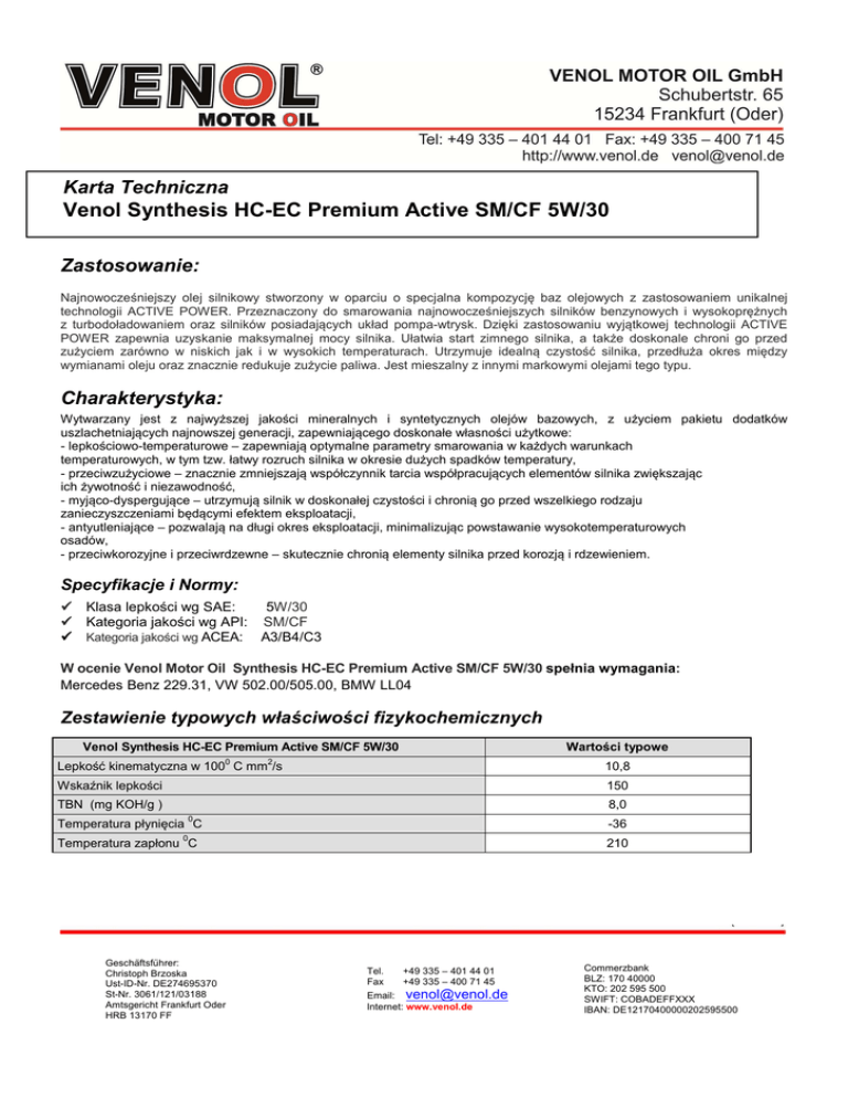 Karta Techniczna Venol Synthesis HC-EC Premium Active SM/CF 5W/30 Zastosowanie: Najnowocześniejszy olej silnikowy stworzony w oparciu o specjalna kompozycję baz olejowych z zastosowaniem unikalnej technologii ACTIVE POWER. Przeznaczony do smarowania najnowocześniejszych silników benzynowych i wysokoprężnych z turbodoładowaniem oraz silników posiadających układ pompa-wtrysk. Dzięki zastosowaniu wyjątkowej technologii ACTIVE POWER zapewnia uzyskanie maksymalnej mocy silnika. Ułatwia start zimnego silnika, a także doskonale chroni go przed zużyciem zarówno w niskich jak i w wysokich temperaturach. Utrzymuje idealną czystość silnika, przedłuża okres między wymianami oleju oraz znacznie redukuje zużycie paliwa. Jest mieszalny z innymi markowymi olejami tego typu. Charakterystyka: Wytwarzany jest z najwyższej jakości mineralnych i syntetycznych olejów bazowych, z użyciem pakietu dodatków uszlachetniających najnowszej generacji, zapewniającego doskonałe własności użytkowe: - lepkościowo-temperaturowe – zapewniają optymalne parametry smarowania w każdych warunkach temperaturowych, w tym tzw. łatwy rozruch silnika w okresie dużych spadków temperatury, - przeciwzużyciowe – znacznie zmniejszają współczynnik tarcia współpracujących elementów silnika zwiększając ich żywotność i niezawodność, - myjąco-dyspergujące – utrzymują silnik w doskonałej czystości i chronią go przed wszelkiego rodzaju zanieczyszczeniami będącymi efektem eksploatacji, - antyutleniające – pozwalają na długi okres eksploatacji, minimalizując powstawanie wysokotemperaturowych osadów, - przeciwkorozyjne i przeciwrdzewne – skutecznie chronią elementy silnika przed korozją i rdzewieniem. Specyfikacje i Normy: Klasa lepkości wg SAE: 5W/30 Kategoria jakości wg API: SM/CF Kategoria jakości wg ACEA: A3/B4/C3 W ocenie Venol Motor Oil Synthesis HC-EC Premium Active SM/CF 5W/30 spełnia wymagania: Mercedes Benz 229.31, VW 502.00/505.00, BMW LL04 Zestawienie typowych właściwości fizykochemicznych Venol Synthesis HC-EC Premium Active SM/CF 5W/30 0 Wartości typowe 2 Lepkość kinematyczna w 100 C mm /s 10,8 Wskaźnik lepkości 150 TBN (mg KOH/g ) 8,0 0 Temperatura płynięcia C -36 0 Temperatura zapłonu C Geschäftsführer: Christoph Brzoska Ust-ID-Nr. DE274695370 St-Nr. 3061/121/03188 Amtsgericht Frankfurt Oder HRB 13170 FF 210 Tel. Fax +49 335 – 401 44 01 +49 335 – 400 71 45 Email: [email protected] Internet: www.venol.de Commerzbank BLZ: 170 40000 KTO: 202 595 500 SWIFT: COBADEFFXXX IBAN: DE12170400000202595500