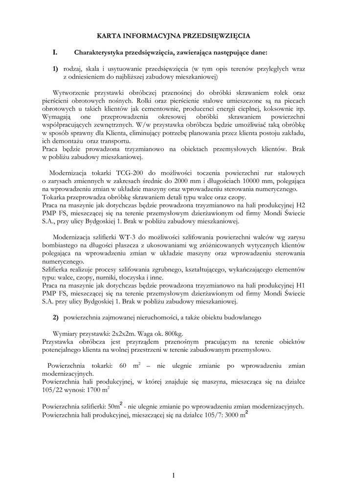 KARTA INFORMACYJNA PRZEDSIĘWZIĘCIA I. Charakterystyka przedsięwzięcia, zawierająca następujące dane: 1) rodzaj, skala i usytuowanie przedsięwzięcia (w tym opis terenów przyległych wraz z odniesieniem do najbliższej zabudowy mieszkaniowej) Wytworzenie przystawki obróbczej przenośnej do obróbki skrawaniem rolek oraz pierścieni obrotowych nośnych. Rolki oraz pierścienie stalowe umieszczone są na piecach obrotowych u takich klientów jak cementownie, producenci energii cieplnej, koksownie itp. Wymagają one przeprowadzenia okresowej obróbki skrawaniem powierzchni współpracujących zewnętrznych. W/w przystawka obróbcza będzie umożliwiać taką obróbkę w sposób sprawny dla Klienta, eliminujący potrzebę planowania przez klienta postoju zakładu, ich demontażu oraz transportu. Praca będzie prowadzona trzyzmianowo na obiektach przemysłowych klientów. Brak w pobliżu zabudowy mieszkaniowej. Modernizacja tokarki TCG-200 do możliwości toczenia powierzchni rur stalowych o zarysach zmiennych w zakresach średnic do 2000 mm i długościach 10000 mm, polegająca na wprowadzeniu zmian w układzie maszyny oraz wprowadzeniu sterowania numerycznego. Tokarka przeprowadza obróbkę skrawaniem detali typu walce oraz czopy. Praca na maszynie jak dotychczas będzie prowadzona trzyzmianowo na hali produkcyjnej H2 PMP FS, mieszczącej się na terenie przemysłowym dzierżawionym od firmy Mondi Świecie S.A., przy ulicy Bydgoskiej 1. Brak w pobliżu zabudowy mieszkaniowej. Modernizacja szlifierki WT-3 do możliwości szlifowania powierzchni walców wg zarysu bombiastego na długości płaszcza z ukosowaniami wg zróżnicowanych wytycznych klientów polegająca na wprowadzeniu zmian w układzie maszyny oraz wprowadzeniu sterowania numerycznego. Szlifierka realizuje procesy szlifowania zgrubnego, kształtującego, wykańczającego elementów typu: walce, czopy, nurniki, tłoczyska i inne. Praca na maszynie jak dotychczas będzie prowadzona trzyzmianowo na hali produkcyjnej H1 PMP FS, mieszczącej się na terenie przemysłowym dzierżawionym od firmy Mondi Świecie S.A. przy ulicy Bydgoskiej 1. Brak w pobliżu zabudowy mieszkaniowej. 2) powierzchnia zajmowanej nieruchomości, a także obiektu budowlanego Wymiary przystawki: 2x2x2m. Waga ok. 800kg. Przystawka obróbcza jest przyrządem przenośnym pracującym na terenie obiektów potencjalnego klienta na wolnej przestrzeni w terenie zabudowanym przemysłowo. Powierzchnia tokarki: 60 m2 – nie ulegnie zmianie po wprowadzeniu zmian modernizacyjnych. Powierzchnia hali produkcyjnej, w której znajduje się maszyna, mieszcząca się na działce 105/22 wynosi: 1700 m2 Powierzchnia szlifierki: 50m2 - nie ulegnie zmianie po wprowadzeniu zmian modernizacyjnych. Powierzchnia hali produkcyjnej, mieszczącej się na działce 105/7: 3000 m2 1 a) dotychczasowy sposób wykorzystywania terenu i obiektów budowlanych (przed realizacją inwestycji) Bez zmian. Przystawka obróbcza będzie używana na terenie zakładu klienta, w obrębie pieca obrotowego, na terenie utwardzonym. Bez zmian. Na hali produkcyjnej H2 mieszczą się inne gabarytowo podobne obrabiarki skrawające oraz są składowane odpady oraz detale klientów. Bez zmian. Na hali produkcyjnej H1 mieszczą się inne podobne gabarytowo obrabiarki skrawające oraz są składowane odpady oraz detale klienta. b) pokrycie szatą roślinną (istniejącą i planowaną) Dotyczy obiektu przemysłowego klienta. Brak szaty roślinnej. Teren otwarty, utwardzony, w pobliżu pieca obrotowego. Dotyczy powierzchni hali produkcyjnej. Brak szaty roślinnej. Dotyczy powierzchni hali produkcyjnej. Brak szaty roślinnej. 3) określenie ewentualnych kolizji planowanej inwestycji z istniejącą zielenią Brak 4) rodzaj technologii (szczegółowy opis, odniesienie do istniejącej i planowanej działalności, uwzględnienie fazy realizacji i eksploatacji przedsięwzięcia) Obróbka skrawaniem powierzchni rolek oraz pierścieni obrotowych nośnych pieców obrotowych. Wprowadzenie nowej usługi dla klienta z branży cementowej, producentów energii cieplnej lub koksowni. Przedsięwzięcie będzie polegać na zaprojektowaniu przystawki, wytworzeniu jej we własnym zakresie oraz weryfikacji i walidacji. Wprowadzenie obróbki skrawaniem powierzchni walców o zarysach zmiennych w zakresach średnic do 2000 mmm i długościach 10000 mm poprzez modernizację istniejącej tokarki oraz zamianę jej sterowania z manualnego na numeryczny. Wprowadzenie nowej usługi dla klienta z branży przemysłu galwanotechnicznego, gumowego oraz cementowego. Przedsięwzięcie będzie polegać na zaprojektowaniu przeróbek modernizacyjnych, zakupie modułu sterowania numerycznego, przeróbce maszyny oraz zainstalowaniu nowego sterowania. Wprowadzenie obróbki skrawaniem wykańczania powierzchni walców o zarysach bombiastych na długości płaszcza z ukosowaniem wg zróżnicowanych wytycznych klientów poprzez modernizację istniejącej szlifierki oraz zamianę jej sterowania z manualnego na numeryczny. 2 Wprowadzenie nowej usługi dla klienta z branży papierniczego, jak również przemysłu galwanotechnicznego, gumowego oraz cementowego. Przedsięwzięcie będzie polegać na zaprojektowaniu przeróbek modernizacyjnych, zakupie modułu sterowania numerycznego, przeróbce maszyny, polegającą na zmianie układów napędowych oraz zainstalowaniu nowego sterowania. 5) ewentualne warianty przedsięwzięcia (z uwzględnieniem wariantu „zero” polegającego na niepodejmowaniu przedsięwzięcia) 0 – nie podejmowanie przedsięwzięcia 1 – projekt i wytworzenie przystawki 0 – nie podejmowanie przedsięwzięcia 1 – projekt i wytworzenie przeróbek modernizacyjnych 2 – zakup sterowania numerycznego 0 – nie podejmowanie przedsięwzięcia 1 – projekt i wytworzenie przeróbek modernizacyjnych oraz zakup sterowania numerycznego oraz jego instalacja 6) przewidywana ilość wykorzystywanej wody, surowców, materiałów, paliw oraz energii