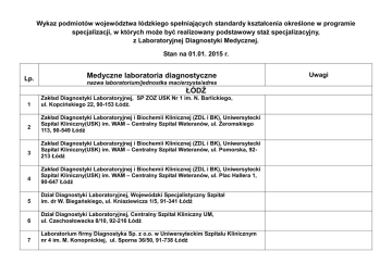 Wykaz podmiotów województwa łódzkiego spełniających standardy kształcenia określone w programie specjalizacji, w których może być realizowany podstawowy staż specjalizacyjny, z Laboratoryjnej Diagnostyki Medycznej. Stan na 01.01. 2015 r. Lp. Medyczne laboratoria diagnostyczne nazwa laboratorium/jednostka macierzysta/adres ŁÓDŹ 1 2 3 4 Zakład Diagnostyki Laboratoryjnej, SP ZOZ USK Nr 1 im. N. Barlickiego, ul. Kopcińskiego 22, 90-153 Łódź. Zakład Diagnostyki Laboratoryjnej i Biochemii Klinicznej (ZDL i BK), Uniwersytecki Szpital Kliniczny(USK) im. WAM – Centralny Szpital Weteranów, ul. Żeromskiego 113, 90-549 Łódź Zakład Diagnostyki Laboratoryjnej i Biochemii Klinicznej (ZDL i BK), Uniwersytecki Szpital Kliniczny(USK) im. WAM – Centralny Szpital Weteranów, ul. Pomorska, 92213 Łódź Zakład Diagnostyki Laboratoryjnej i Biochemii Klinicznej (ZDL i BK), Uniwersytecki Szpital Kliniczny(USK) im. WAM – Centralny Szpital Weteranów, ul. Plac Hallera 1, 90-647 Łódź 5 Dział Diagnostyki Laboratoryjnej, Wojewódzki Specjalistyczny Szpital im. dr W. Biegańskiego, ul. Kniaziewicza 1/5, 91-341 Łódź 6 Dział Diagnostyki Laboratoryjnej, Centralny Szpital Kliniczny UM, ul. Czechosłowacka 8/10, 92-216 Łódź 7 Laboratorium firmy Diagnostyka Sp. z o.o. w Uniwersyteckim Szpitalu Klinicznym nr 4 im. M. Konopnickiej, ul. Sporna 36/50, 91-738 Łódź Uwagi 8 Centrum Medycznej Diagnostyki Laboratoryjnej Instytutu „Centrum Zdrowia Matki Polki”, 93-338 Łódź, ul. Rzgowska 281/289 9 Laboratorium Analityczne, Wojewódzki Specjalistyczny Szpital im. dr M. Pirogowa, ul. Wólczańska 191/195, 90-531 Łódź 10 11 12. 13 14 15 Laboratorium Medyczne Synevo Łódź Kopernik, ul. Pabianicka 62, 93-513 Łódź Pracownia Diagnostyki Laboratoryjnej, Wojewódzki Specjalistyczny Szpital im. dr M. Pirogowa, ul. Wileńska 37, 94-029 Łódź Laboratorium Medyczne Synevo Łódź Jonsher, ul. Milionowa 14, 93-113 Łódź Laboratorium Analityczne, Boni Fratres Lodziensis Sp. z o.o., Szpital Zakonu Bonifratrów im. Św. Jana Bożego, ul. Kosynierów Gdyńskich 61, 93-357 Łódź Zakład Diagnostyki Laboratoryjnej, ZOZ MSWiA, ul. Północna 42, 91-425 Łódź Zakład Diagnostyki Laboratoryjnej, Wojewódzki Ośrodek Medycyny Pracy – Centrum Profilaktyczno- Lecznicze, 91-205 Łódź, ul. Aleksandrowska 61/63 BEŁCHATÓW 19. Zakład Diagnostyki Laboratoryjnej, Szpital Wojewódzki im. Jana Pawła II, ul. Czapliniecka 123, 97-400 Bełchatów 20. Laboratorium Oddziału w Brzezinach, Diagnostyka Sp. z o.o. O/Łódź, ul. Marii Curie Skłodowskiej 6, 95-060 Brzeziny BRZEZINY KUTNO 21. Zakład Diagnostyki Laboratoryjnej, NZOZ Kutnowski Szpital Samorządowy, ul. Kościuszki 52, 99-300 Kutno 22. Laboratorium „Centrum Dializa” Sp. z o.o. Szpital w Łasku, ul. Warszawska 62a, 98-100 Łask ŁASK ŁĘCZYCA 23. Zespół Pracowni Diagnostyki Laboratoryjnej, SP ZOZ, ul. Zachodnia 6, 99-100 Łęczyca ŁOWICZ 24. Laboratorium Centralne, SP ZOZ, ul. Ułańska 28, 99-400 Łowicz OPOCZNO 25. Dział Diagnostyki Laboratoryjnej, SP ZOZ Szpital Powiatowy im. E. Biernackiego, ul. Partyzantów 30, 26-300 Opoczno PABIANICE 26. Zakład Diagnostyki Laboratoryjnej Laboratorium Centralne, NZOZ Pabianickie Centrum Medyczne, ul. Jana Pawła II 68, 95-200 Pabianice PIOTRKÓW TRYBUNALSKI 27. 28. Zakład Diagnostyki Laboratoryjnej, Samodzielny Szpital Wojewódzki im. M. Kopernika, ul. Rakowska 15, 97-300 Piotrków Trybunalski Ośrodek Diagnostyki Laboratoryjnej, Powiatowy Zespół Opieki Zdrowotnej w Piotrkowie Trybunalskim, ul. Roosevelta 3, 97-300 Piotrków Trybunalski PODDĘBICE 29. Laboratorium Analiz Lekarskich ALAB Poddębice, firma ALAB Laboratoria Sp. z o.o., ul. Mickiewicza 16, 99-200 Poddębice RADOMSKO 30. Zakład Diagnostyki Laboratoryjnej – Centralne Laboratorium Miejskie, SP ZOZ Szpital Powiatowy, ul. Jagiellońska 36, 97-500 Radomsko SIERADZ 31. Medyczne Laboratorium Diagnostyczne, SP ZOZ Szpital im. Prymasa Kardynała S. Wyszyńskiego, ul. Armii Krajowej 7, 98-200 Sieradz SKIERNIEWICE 32. Dział Diagnostyki Laboratoryjnej, SP ZOZ Wojewódzki Szpital Zespolony, ul. Sobieskiego 4, 96-100 Skierniewice TOMASZÓW MAZOWIECKI 33. Zakład Diagnostyki Laboratoryjnej, NZOZ Tomaszowskie Centrum Zdrowia, ul. Jana Pawła II 35, 97-200 Tomaszów Mazowiecki WARTA 34. Laboratorium i Pracownie Diagnostyczne, Wojewódzki Szpital Psychiatryczny, ul. Sieradzka 3, 98-290 Warta WIELUŃ 35. 36. Zakład Diagnostyki Laboratoryjnej, SP ZOZ, ul. Szpitalna 16, 98-300 Wieluń Laboratorium Analiz Lekarskich, Niepubliczny Zakład Diagnostyki Medycznej, ul. Nowy Rynek 3, 98-300 Wieluń ZDUŃSKA WOLA 37. Dział Diagnostyki Laboratoryjnej, Zduńskowolski Szpital Powiatowy Sp. z o.o., ul. Królewska 29, 98-220 Zduńska Wola ZGIERZ 38. Zakład Diagnostyki Laboratoryjnej, Wojewódzki Szpital Specjalistyczny im. M. Skłodowskiej-Curie, ul. Parzęczewska 35, 95-100 Zgierz