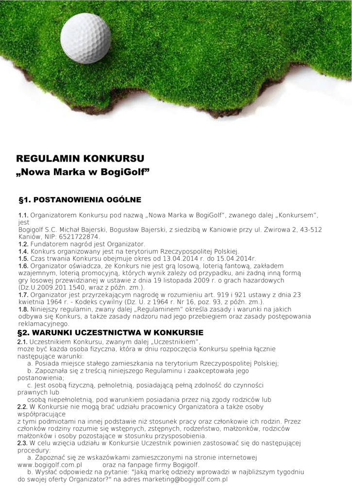 REGULAMIN KONKURSU „Nowa Marka w BogiGolf” §1. POSTANOWIENIA OGÓLNE 1.1. Organizatorem Konkursu pod nazwą „Nowa Marka w BogiGolf”, zwanego dalej „Konkursem”, jest Bogigolf S.C. Michał Bajerski, Bogusław Bajerski, z siedzibą w Kaniowie przy ul. Żwirowa 2, 43-512 Kaniów, NIP: 6521722874. 1.2. Fundatorem nagród jest Organizator. 1.4. Konkurs organizowany jest na terytorium Rzeczypospolitej Polskiej. 1.5. Czas trwania Konkursu obejmuje okres od 13.04.2014 r. do 15.04.2014r. 1.6. Organizator oświadcza, że Konkurs nie jest grą losową, loterią fantową, zakładem wzajemnym, loterią promocyjną, których wynik zależy od przypadku, ani żadną inną formą gry losowej przewidzianej w ustawie z dnia 19 listopada 2009 r. o grach hazardowych (Dz.U.2009.201.1540, wraz z późn. zm.). 1.7. Organizator jest przyrzekającym nagrodę w rozumieniu art. 919 i 921 ustawy z dnia 23 kwietnia 1964 r. - Kodeks cywilny (Dz. U. z 1964 r. Nr 16, poz. 93, z późn. zm.). 1.8. Niniejszy regulamin, zwany dalej „Regulaminem” określa zasady i warunki na jakich odbywa się Konkurs, a także zasady nadzoru nad jego przebiegiem oraz zasady postępowania reklamacyjnego. §2. WARUNKI UCZESTNICTWA W KONKURSIE 2.1. Uczestnikiem Konkursu, zwanym dalej „Uczestnikiem”, może być każda osoba fizyczna, która w dniu rozpoczęcia Konkursu spełnia łącznie następujące warunki: a. Posiada miejsce stałego zamieszkania na terytorium Rzeczypospolitej Polskiej; b. Zapoznała się z treścią niniejszego Regulaminu i zaakceptowała jego postanowienia; c. Jest osobą fizyczną, pełnoletnią, posiadającą pełną zdolność do czynności prawnych lub osobą niepełnoletnią, pod warunkiem posiadania przez nią zgody rodziców lub 2.2. W Konkursie nie mogą brać udziału pracownicy Organizatora a także osoby współpracujące z tymi podmiotami na innej podstawie niż stosunek pracy oraz członkowie ich rodzin. Przez członków rodziny rozumie się wstępnych, zstępnych, rodzeństwo, małżonków, rodziców małżonków i osoby pozostające w stosunku przysposobienia. 2.3. W celu wzięcia udziału w Konkursie Uczestnik powinien zastosować się do następującej procedury: a. Zapoznać się ze wskazówkami zamieszczonymi na stronie internetowej www.bogigolf.com.pl oraz na fanpage firmy Bogigolf. b. Wysłać odpowiedz na pytanie: "Jaką markę odzieży wprowadzi w najbliższym tygodniu do swojej oferty Organizator?" na adres [email protected] 2.4. Nagrody w Konkursie będą przyznawane przez komisję konkursową, składającą się z 3 (trzech) pracowników Organizatora, zwaną dalej „Komisją Konkursową” 2.5 Jednego dnia, jeden Uczestnik może przesłać tylko jedną odpowiedź na pytanie konkursowe. 2.6 W przypadku przesłania dwóch i więcej odpowiedzi, komisja konkursowa weźmie pod uwagę jedynie pierwszą z nich. §3. NAGRODY 3.1 Nagrodą w Konkursie są: markowe gadżety golfowe o łącznej wartości 200zł 3.2 Nagrodę otrzyma Uczestnik, który jako pierwszy prześle prawidłową odpowiedz na pytanie konkursowe (2.3b) w najkrótszym czasie od rozpoczęcia konkursu ("Zwycięzca"). §4. SPOSÓB OGŁASZANIA WYNIKÓW 4.1. Organizator Konkursu skontaktuje się ze Zwycięzcą najpózniej do 17.04.2015. 4.2. W przypadku braku kontaktu ze strony osoby, o której mowa w pkt 4.1., w ciągu 5 dni następujących po dniu poinformowania o wygranej, nagroda przepada i przypada Uczestnikowi, który jako drugi udzielił prawidłowej odpowiedzi. Procedura ta będzie ponawiana dwukrotnie. Jeżeli Organizatorowi nie uda się wytypować zwycięzcy nagroda przepada na rzecz Organizatora. §5. WYDANIE NAGRÓD 5.1. Nagrody w Konkursie zostaną wydane Zwycięzcy przez Organizatora w drodze przesyłki kurierskiej na podany przez laureata adres pocztowy, nie później niż do dnia 30.04.2015r. Nagrody zostaną wydane tylko temu Zwycięzcy, który spełnia warunki udziału w Konkursie, prawidłowo wykonał wszystkie obowiązki Uczestnika określone w niniejszym Regulaminie, §6. ZASADY POSTĘPOWANIA REKLAMACYJNEGO 6.1. Niezależnie i bez wpływu na przewidzianą przepisami powszechnie obowiązującego prawa odpowiedzialność Organizatora wobec konsumenta oraz uprawnienia przysługujące konsumentowi w zakresie zgłaszania i dochodzenia roszczeń, można zgłaszać do Organizatora wszelkie reklamacje dotyczące Konkursu. 6.2. Reklamacje powinny być zgłaszane do dnia 29.04.2015 roku. 6.3. W celu usprawnienia procesu zgłaszania i rozpatrywania, reklamacja może zostać złożona w formie pisemnej na adres [email protected]. Składający reklamację powinien uwidocznić w jej treści swoje dane, tak aby kontakt z nim w celu poinformowania o wyniku postępowania reklamacyjnego był możliwy. 6.4. Rozpatrywanie reklamacji trwa 14 dni liczonych od dnia jej otrzymania (włączając w to wysyłkę listu zawierającego zawiadomienie Uczestnika o wyniku reklamacji). §7. DANE OSOBOWE 7.1. Dane osobowe Uczestników Konkursu podlegają ochronie zgodnie z ustawą z dnia 29 sierpnia 1997 r. o ochronie danych osobowych (Dz.U.2002.101.926 j.t.), - dalej zwanej ustawą. 7.2. Administratorem danych osobowych uczestników Konkursu jest Bogigolf Spółka Cywilna Michał Bajerski, Bogusław Bajerski z siedzibą w Kaniowie przy ul. Żwirowa 2, NIP: 6521722874. 7.3. Dane osobowe Uczestników będą przetwarzane zgodnie z ustawą z dnia 29 sierpnia 1997 roku o ochronie danych osobowych (tekst jednolity Dz.U. z 2002 r., Nr 101, poz. 926 z późn. zm.) wyłącznie dla celów związanych z realizacją niniejszego Konkursu. 7.4. Każdy Uczestnik ma prawo wglądu w swoje dane i ich poprawiania oraz żądania ich usunięcia. 7.5. Podanie danych osobowych jest dobrowolne, ale ich niepodanie uniemożliwia wzięcie udziału w Konkursie. 7.6. Podanie nieprawdziwych danych osobowych może być przyczyną wykluczenia Uczestnika z Konkursu. §8. POSTANOWIENIA KOŃCOWE 8.1. Przez cały czas trwania Konkursu Regulamin będzie dostępny na stro