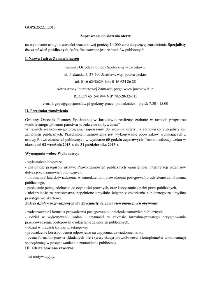 GOPS.2522.1.2013 Zaproszenie do złożenia oferty na wykonanie usługi o wartości szacunkowej poniżej 14 000 euro dotyczącej zatrudnienia Specjalisty ds. zamówień publicznych, które finansowane jest ze środków publicznych I. Nazwa i adres Zamawiającego Gminny Ośrodek Pomocy Społecznej w Jarosławiu ul. Piekarska 5, 37-500 Jarosław, woj. podkarpackie, tel. 0-16 6248629, faks 0-16 624 86 28 Adres strony internetowej Zamawiającego:www.jaroslaw.itl.pl REGON 651541944 NIP 792-20-32-615 e-mail: [email protected] godziny pracy: poniedziałek - piątek 7.30 - 15.00 II. Przedmiot zamówienia Gminny Ośrodek Pomocy Społecznej w Jarosławiu realizuje zadanie w ramach programu wieloletniego „Pomoc państwa w zakresie dożywiania” W ramach realizowanego programu zapraszamy do złożenia oferty na stanowisko Specjalisty ds. zamówień publicznych. Przedmiotem zamówienia jest wykonywanie obowiązków wynikających z ustawy Prawo zamówień publicznych w wymiarze 60 godzin zegarowych. Termin realizacji zadań w okresie od 02 września 2013 r. do 31 października 2013 r. Wymagania wobec Wykonawcy: - wykształcenie wyższe - znajomość przepisów ustawy: Prawo zamówień publicznych -umiejętność interpretacji przepisów dotyczących zamówień publicznych, - minimum 3 lata doświadczenia w samodzielnym prowadzeniu postępowań o udzielenie zamówienia publicznego, - posiadanie pełnej zdolności do czynności prawnych, oraz korzystanie z pełni praw publicznych, - niekaralność za przestępstwa popełnione umyślnie ścigane z oskarżenia publicznego za umyślne przestępstwo skarbowe, Zakres działań przewidzianych dla Specjalisty ds. zamówień publicznych obejmuje: - nadzorowanie i kontrola prowadzenia postępowań o udzielenie zamówień publicznych - udział w wykonywaniu zadań i czynności w zakresie formalno-prawnego przygotowania przeprowadzenia postępowań o udzielenie zamówień publicznych, - udział w pracach komisji przetargowej - prowadzenie korespondencji odpowiedzi na zapytania, zawiadomienia, itp. - ocena formalno-prawna składanych ofert (weryfikacja prawidłowości i kompletności dokumentacji sporządzonej w postępowaniach o zamówienie publiczne), III. Oferta powinna zawierać: - list motywacyjny, - CV z oświadczeniem o wyrażeniu zgody na przetwarzanie danych osobowych zawartych w przesyłanym CV dla potrzeb niezbędnych procesu rekrutacji zgodnie z ustawą z dnia 29 sierpnia 1997 r. o ochronie danych osobowych (Dz. U. z 2002 r. Nr. 101, poz. 926 ze zm.) - kopie potwierdzające wykształcenie i kwalifikacje zawodowe, - proponowaną stawkę brutto za wykonanie usługi. - oświadczenie o niekaralności następującej treści: ,,Oświadczam, że nie byłem/am karany/a za przestępstwo popełnione umyślnie i nie toczy się przeciwko mnie postępowanie karne. Oświadczam, że posiadam pełną zdolność do czynności prawnych, korzystam z pełni praw publicznych "(zgodnie z art.6ust.3pkt 2 ustawy o pracownikach samorządowych 2008 r. Nr 223 poz. 1458). IV. Oferujemy: Zatrudnienie na podstawie umowy zlecenia. V. Kryteria wyboru oferty: Kwalifikacje, doświadczenie i cena. VI. Ofertę należy: a) złożyć w formie pisemnej w terminie do dnia 30.08.2013 r. do godziny 14.00 (osobiście, pisemnie - listem, lub e-mail, lub faksem) na Formularzu Oferty( Zał.nr.l) Adres: Gminny Ośrodek Pomocy Społecznej w Jarosławiu, ul. Piekarska 5, 37-500 Jarosław lub składać osobiście (pokój nr.25) w siedzibie Ośrodka. b) w przypadku wybrania formy listowej, opakować w jednej kopercie zaadresowanej na Zamawiającego i opatrzonej napisem: Specjalista ds. zamówień publicznych - oferta Osoba upoważniona do kontaktu: Maria Kulczycka Tel.: 16 624 86 29