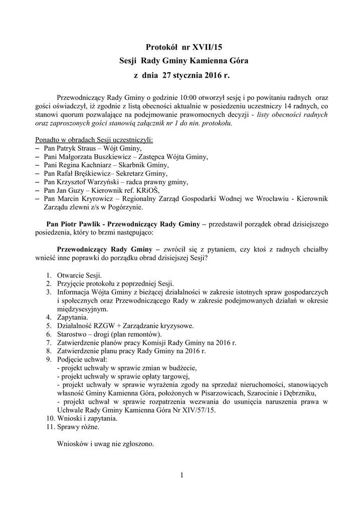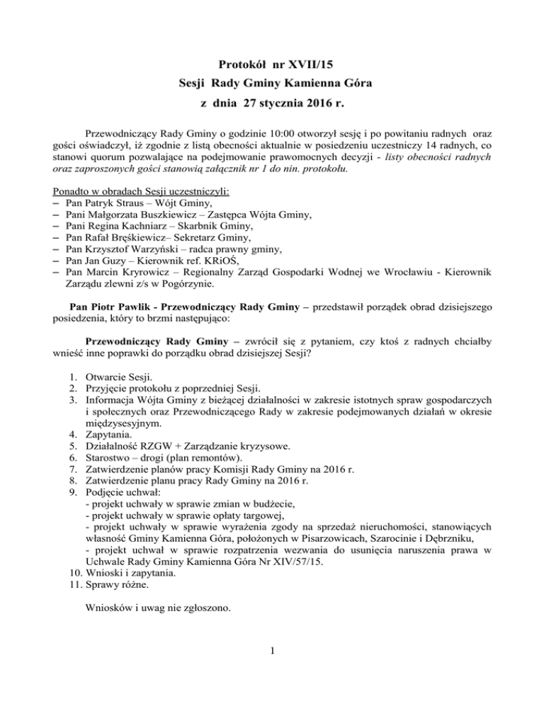 Protokół nr XVII/15 Sesji Rady Gminy Kamienna Góra z dnia 27 stycznia 2016 r. Przewodniczący Rady Gminy o godzinie 10:00 otworzył sesję i po powitaniu radnych oraz gości oświadczył, iż zgodnie z listą obecności aktualnie w posiedzeniu uczestniczy 14 radnych, co stanowi quorum pozwalające na podejmowanie prawomocnych decyzji - listy obecności radnych oraz zaproszonych gości stanowią załącznik nr 1 do nin. protokołu. Ponadto w obradach Sesji uczestniczyli: – Pan Patryk Straus – Wójt Gminy, – Pani Małgorzata Buszkiewicz – Zastępca Wójta Gminy, – Pani Regina Kachniarz – Skarbnik Gminy, – Pan Rafał Bręśkiewicz– Sekretarz Gminy, – Pan Krzysztof Warzyński – radca prawny gminy, – Pan Jan Guzy – Kierownik ref. KRiOŚ, – Pan Marcin Kryrowicz – Regionalny Zarząd Gospodarki Wodnej we Wrocławiu - Kierownik Zarządu zlewni z/s w Pogórzynie. Pan Piotr Pawlik - Przewodniczący Rady Gminy – przedstawił porządek obrad dzisiejszego posiedzenia, który to brzmi następująco: Przewodniczący Rady Gminy – zwrócił się z pytaniem, czy ktoś z radnych chciałby wnieść inne poprawki do porządku obrad dzisiejszej Sesji? 1. Otwarcie Sesji. 2. Przyjęcie protokołu z poprzedniej Sesji. 3. Informacja Wójta Gminy z bieżącej działalności w zakresie istotnych spraw gospodarczych i społecznych oraz Przewodniczącego Rady w zakresie podejmowanych działań w okresie międzysesyjnym. 4. Zapytania. 5. Działalność RZGW + Zarządzanie kryzysowe. 6. Starostwo – drogi (plan remontów). 7. Zatwierdzenie planów pracy Komisji Rady Gminy na 2016 r. 8. Zatwierdzenie planu pracy Rady Gminy na 2016 r. 9. Podjęcie uchwał: - projekt uchwały w sprawie zmian w budżecie, - projekt uchwały w sprawie opłaty targowej, - projekt uchwały w sprawie wyrażenia zgody na sprzedaż nieruchomości, stanowiących własność Gminy Kamienna Góra, położonych w Pisarzowicach, Szarocinie i Dębrzniku, - projekt uchwał w sprawie rozpatrzenia wezwania do usunięcia naruszenia prawa w Uchwale Rady Gminy Kamienna Góra Nr XIV/57/15. 10. Wnioski i zapytania. 11. Sprawy różne. Wniosków i uwag nie zgłoszono. 1 Porządek obrad XVI Sesji Rady Gminy został przez Radę Gminy przyjęty - głosowało 14 radnych: wystąpiło 14 głosów „za”, głosy „przeciw” oraz „wstrzymuję się” nie wystąpiły. Ad. 1 Otwarcie Sesji – opisano na wstępie. Ad. 2 Przyjęcie protokołu z poprzedniej Sesji. Przewodniczący Rady Gminy zapytał, czy ktoś z radnych chciałby wnieść poprawki do protokołu z poprzedniej Sesji? Wobec braku zgłoszonych uwag, Rada Gminy przyjęła protokół Sesji XVI/15 z dnia 30 grudnia 2015 r. (głosowało 14 radnych: wystąpiło 14 głosów „za”, głosy „przeciw” oraz „wstrzymuję się” nie wystąpiły). Ad. 3 Informacja Wójta Gminy z bieżącej działalności w zakresie istotnych spraw gospodarczych i społecznych oraz Przewodniczącego Rady w zakresie podejmowanych działań w okresie międzysesyjnym. Informacje o pracy Wójta Gminy w okresie od poprzedniej sesji do dnia dzisiejszego przedstawił Pan Patryk Straus – Wójt Gminy - załącznik nr 2. Pan Piotr Pawlik - Przewodniczący Rady Gminy – przedstawił informacje z działalności Przewodniczącego Rady Gminy w okresie międzysesyjnym - załącznik nr 3. Pytania: Pan Kazimierz Ogorzałek – zapytał, czy władze PKP wnoszą przy przekazaniu na rzecz gminy torów kolejowych do Krzeszowie, o przejęcie budynku pokolejowego? Pan Patryk Straus – Wójt Gminy – w odpowiedzi poinformował, iż władze PKP są zainteresowane przekazaniem na rzecz gminy przytoczonego budynku w Krzeszowie. Sprawa jest do wstępnego rozeznania jednakże, gmina nie jest zainteresowana przejęciem tego mienia. Wójt Gminy w dalszej części wypowiedzi przypomniał plany związane z zagospodarowaniem nasypu kolejowego do Krzeszowa. Pan Jan Łepski – zapytał, jaki przebieg mają rozmowy z Miastem Kamienna Góra w zakresie połączenia ścieżek gminnych z miejskimi? Pan Patryk Straus – Wójt Gminy – poinformował, o możliwych trzech kierunkach połączenia ścieżek wychodzących z terenów miasta na teren gminy - omawiając wskazane kierunki/lokalizację. Po wysłuchaniu informacji z bieżącej działalności Wójta oraz Przewodniczącego Rady Gminy dotyczącej istotnych spraw gospodarczych i społecznych - Rada Gminy przyjęła powyższe informacje. Ad. 4 Zapytania. Pani Ewa Kwiecińska – zapytała, czy złożone zostały przez gminę wnioski o środki zewnętrzne w ramach uruchomianych od dnia 20.01.2016 r. naborów w PROW? oraz na jakie zadania są te wnioski? 2 Pan Patryk Straus – Wójt Gminy – poinformował, iż w ramach uruchamianych naborów w zakresie Programu Rozwoju Obszarów Wiejskich na zadania przebudowy dróg, zaplanowanych środków w programie jest bardzo mało. Gmina po analizie programu pomocowego, przygotowuje wniosek z zadaniem inwestycyjnym spełniającym określone w nim wymogi, a dotyczącym przebudowy drogi gminnej wraz z ciągiem pieszo jezdnym w Przedwojowie. Dalszych zapytań nie zgłoszono. Ad. 5 Działalność RZGW + Zarządzanie kryzysowe. Działalność RZGW Pan Marcin Kryrowicz – Regionalny Zarząd Gospodarki Wodnej we Wrocławiu Kierownik Zarządu zlewni z/s w Pogórzynie – przedstawił informacje związane z zadaniami jakie realizuje RZGW – załącznik nr 4 do protokołu. Pytania: Pan Jan Łepski – wskazał, iż od lat czeka na poprawę koryta potoku Żywica płynącego przez Pisarzowice. Szereg pism wraz ze zdjęciami było przekazywane do RZGW, które po oględzinach stanu potoku dalej nic nie robi. Radny zapytał, ile jeszcze mieszkańcy mają czekać, stan jest tragiczny? Pan Marcin Kryrowicz – Regionalny Zarząd Gospodarki Wodnej we Wrocławiu – poinformował, iż każde z zadań zgłaszanych do realizacji winno być wykonane, jednakże ich ilość zależna jest od środków finansowych jakimi dysponuje jednostka. Przydział środ