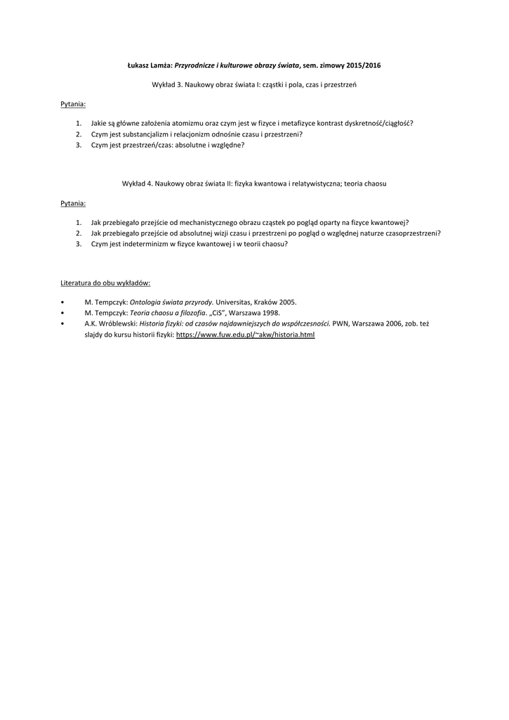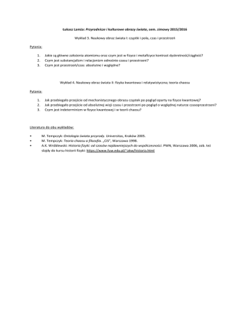 Łukasz Lamża: Przyrodnicze i kulturowe obrazy świata, sem. zimowy 2015/2016 Wykład 3. Naukowy obraz świata I: cząstki i pola, czas i przestrzeo Pytania: 1. 2. 3. Jakie są główne założenia atomizmu oraz czym jest w fizyce i metafizyce kontrast dyskretnośd/ciągłośd? Czym jest substancjalizm i relacjonizm odnośnie czasu i przestrzeni? Czym jest przestrzeo/czas: absolutne i względne? Wykład 4. Naukowy obraz świata II: fizyka kwantowa i relatywistyczna; teoria chaosu Pytania: 1. 2. 3. Jak przebiegało przejście od mechanistycznego obrazu cząstek po pogląd oparty na fizyce kwantowej? Jak przebiegało przejście od absolutnej wizji czasu i przestrzeni po pogląd o względnej naturze czasoprzestrzeni? Czym jest indeterminizm w fizyce kwantowej i w teorii chaosu? Literatura do obu wykładów: • • • M. Tempczyk: Ontologia świata przyrody. Universitas, Kraków 2005. M. Tempczyk: Teoria chaosu a filozofia. „CiS”, Warszawa 1998. A.K. Wróblewski: Historia fizyki: od czasów najdawniejszych do współczesności. PWN, Warszawa 2006, zob. też slajdy do kursu historii fizyki: https://www.fuw.edu.pl/~akw/historia.html