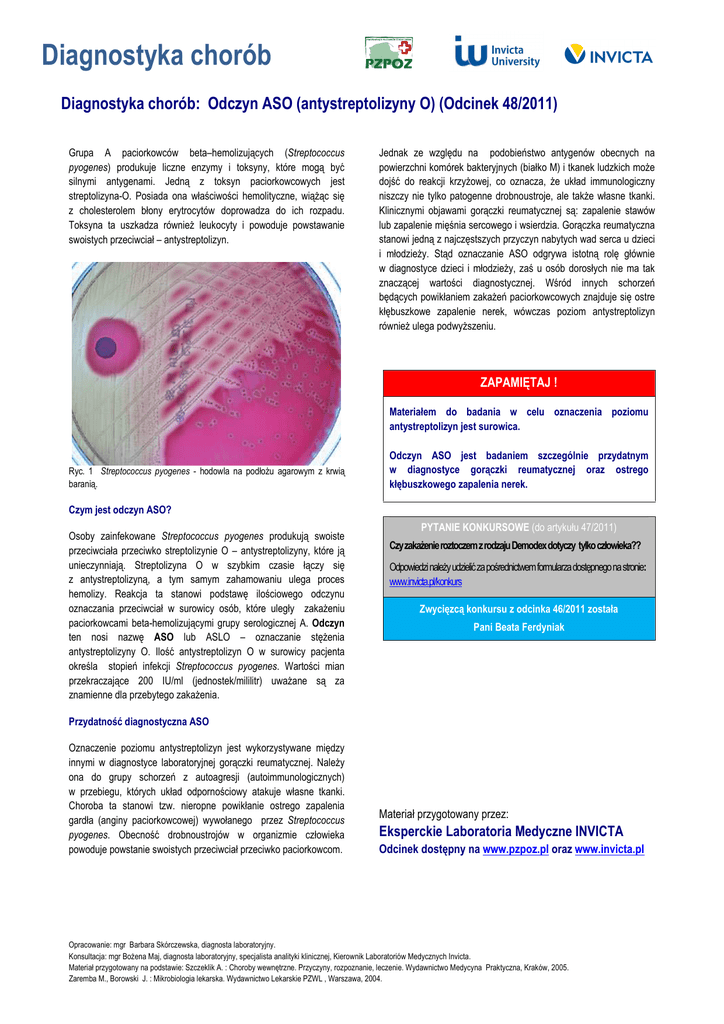Diagnostyka chorób Diagnostyka chorób: Odczyn ASO (antystreptolizyny O) (Odcinek 48/2011) Grupa A paciorkowców beta–hemolizujących (Streptococcus pyogenes) produkuje liczne enzymy i toksyny, które mogą być silnymi antygenami. Jedną z toksyn paciorkowcowych jest streptolizyna-O. Posiada ona właściwości hemolityczne, wiąŜąc się z cholesterolem błony erytrocytów doprowadza do ich rozpadu. Toksyna ta uszkadza równieŜ leukocyty i powoduje powstawanie swoistych przeciwciał – antystreptolizyn. Jednak ze względu na podobieństwo antygenów obecnych na powierzchni komórek bakteryjnych (białko M) i tkanek ludzkich moŜe dojść do reakcji krzyŜowej, co oznacza, Ŝe układ immunologiczny niszczy nie tylko patogenne drobnoustroje, ale takŜe własne tkanki. Klinicznymi objawami gorączki reumatycznej są: zapalenie stawów lub zapalenie mięśnia sercowego i wsierdzia. Gorączka reumatyczna stanowi jedną z najczęstszych przyczyn nabytych wad serca u dzieci i młodzieŜy. Stąd oznaczanie ASO odgrywa istotną rolę głównie w diagnostyce dzieci i młodzieŜy, zaś u osób dorosłych nie ma tak znaczącej wartości diagnostycznej. Wśród innych schorzeń będących powikłaniem zakaŜeń paciorkowcowych znajduje się ostre kłębuszkowe zapalenie nerek, wówczas poziom antystreptolizyn równieŜ ulega podwyŜszeniu. ZAPAMIĘTAJ ! Materiałem do badania w celu oznaczenia poziomu antystreptolizyn jest surowica. Ryc. 1 Streptococcus pyogenes - hodowla na podłoŜu agarowym z krwią baranią. Odczyn ASO jest badaniem szczególnie przydatnym w diagnostyce gorączki reumatycznej oraz ostrego kłębuszkowego zapalenia nerek. Czym jest odczyn ASO? Osoby zainfekowane Streptococcus pyogenes produkują swoiste przeciwciała przeciwko streptolizynie O – antystreptolizyny, które ją unieczynniają. Streptolizyna O w szybkim czasie łączy się z antystreptolizyną, a tym samym zahamowaniu ulega proces hemolizy. Reakcja ta stanowi podstawę ilościowego odczynu oznaczania przeciwciał w surowicy osób, które uległy zakaŜeniu paciorkowcami beta-hemolizującymi grupy serologicznej A. Odczyn ten nosi nazwę ASO lub ASLO – oznaczanie stęŜenia antystreptolizyny O. Ilość antystreptolizyn O w surowicy pacjenta określa stopień infekcji Streptococcus pyogenes. Wartości mian przekraczające 200 IU/ml (jednostek/mililitr) uwaŜane są za znamienne dla przebytego zakaŜenia. PYTANIE KONKURSOWE (do artykułu 47/2011) Czy zakaŜenie roztoczem z rodzaju Demodex dotyczy tylko człowieka?? Odpowiedzi naleŜy udzielić za pośrednictwem formularza dostępnego na stronie: www.invicta.pl/konkurs Zwycięzcą konkursu z odcinka 46/2011 została Pani Beata Ferdyniak Przydatność diagnostyczna ASO Oznaczenie poziomu antystreptolizyn jest wykorzystywane między innymi w diagnostyce laboratoryjnej gorączki reumatycznej. NaleŜy ona do grupy schorzeń z autoagresji (autoimmunologicznych) w przebiegu, których układ odpornościowy atakuje własne tkanki. Choroba ta stanowi tzw. nieropne powikłanie ostrego zapalenia gardła (anginy paciorkowcowej) wywołanego przez Streptococcus pyogenes. Obecność drobnoustrojów w organizmie człowieka powoduje powstanie swoistych przeciwciał przeciwko paciorkowcom. Materiał przygotowany przez: Eksperckie Laboratoria Medyczne INVICTA Odcinek dostępny na www.pzpoz.pl oraz www.invicta.pl Opracowanie: mgr Barbara Skórczewska, diagnosta laboratoryjny. Konsultacja: mgr BoŜena Maj, diagnosta laboratoryjny, specjalista analityki klinicznej, Kierownik Laboratoriów Medycznych Invicta. Materiał przygotowany na podstawie: Szczeklik A. : Choroby wewnętrzne. Przyczyny, rozpoznanie, leczenie. Wydawnictwo Medycyna Praktyczna, Kraków, 2005. Zaremba M., Borowski J. : Mikrobiologia lekarska. Wydawnictwo Lekarskie PZWL , Warszawa, 2004.