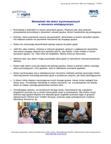 growing up with more than one language - Polish Wskazówki dla dzieci wychowywanych w otoczeniu wielojęzycznym • Rozmawiaj z dzieckiem w swoim ojczystym języku. Ważnym jest, aby podczas prowadzenia komunikacji z dzieckiem używać języka, którym swobodnie się posługujesz. • Dziecko, które poprawnie nauczy się gramatyki i słownictwa w swoim ojczystym języku, ma większe szanse na poprawne nauczenie się drugiego języka. • Dzieci nie odczuwają dezorientacji słysząc więcej niż jeden język. • Jeśli Wy, jako rodzice, mówicie w różnych językach, jednym z najlepszych sposobów nauczenia swojego dziecka tych języków jest to, aby każde z Was mówiło w swoim ojczystym języku, np. Tata mówi po angielsku, Mama mówi po francusku. • Istotnym jest, aby dzieci mogły przyswajać dany język w naturalnym otoczeniu/podczas zabawy. • Kiedy małe dzieci uczą się więcej niż jednego języka, nieraz w jednym zdaniu używają słów pochodzących z obu języków. Jest to całkowicie normalne zjawisko. • Dzieci wychowujące się w wielojęzycznym otoczeniu niekiedy później zaczynają mówić, niemniej jednak rozumieją pierwszy język w podobnym stopniu, jak dzieci jednojęzyczne. • U dzieci, które dopiero zaczynają się uczyć obcego języka, nieraz może nastąpić tzw. okres ciszy. Prowadząc interakcję w nowym otoczeniu, np. w przedszkolu lub szkole, dzieci te często używają gestykulacji zamiast słów. • Umożliwiając dziecku, od wczesnych lat jego życia, osłuchiwanie się z językiem angielskim pomoże mu w chwili rozpoczęcia nauki w przedszkolu. Nie trzeba uczyć dziecka tego języka! Będzie ono słyszało język angielski podczas zajęć w grupach zabawowych (Parent and Toddler Groups), podczas zajęć poświęconych czytaniu (Bookbug Sessions), itp. Informacje zaczerpnięte z artykułu Antonelli Sorace i Bob’a Ladd’a: „Raising Bilingual Children” (Wychowywanie dzieci dwujęzycznych) www.lets-talk.scot.nhs.uk