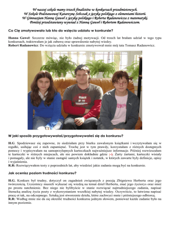W naszej szkole mamy trzech finalistów w konkursach przedmiotowych. W Szkole Podstawowej Katarzynę Sobczak z języka polskiego z elementami historii. W Gimnazjum Hannę Gaweł z języka polskiego i Roberta Radanowicza z matematyki. Poniżej przedstawiany wywiad z Hanną Gaweł i Robertem Radanowiczem. Co Cię zmotywowało lub kto do wzięcia udziału w konkursie? Hanna Gaweł: Szczerze mówiąc, nie było żadnej motywacji. Od trzech lat brałam udział w tego typu konkursach, traktowałam je jak zabawę oraz sprawdzenie nabytej wiedzy. Robert Radanowicz: Do wzięcia udziału w konkursie zmotywował mnie mój tata Tomasz Radanowicz. W jaki sposób przygotowywałaś/przygotowywałeś się do konkursu? H.G. Spodziewasz się zapewne, że siedziałam przy biurku zawalonym książkami i wczytywałam się w regułki, usiłując coś z nich zapamiętać. Trochę jest w tym prawdy, korzystałam z różnych dostępnych pomocy i wypisywałam na samoprzylepnych karteczkach najważniejsze informacje. Później rozwieszałam te karteczki w różnych miejscach, ale nie powiem dokładnie gdzie ;-). Żarty żartami, karteczki wisiały i pomagały, ale nie były w stanie zastąpić samych książek i notatek, w których zawarte były definicje, opisy i wyjaśnienia. R.R: Rozwiązywałem testy z poprzednich lat, aby wiedzieć jakie zadania mogą być na konkursie. Jak ocenisz poziom trudności konkursu? H.G. Konkurs był trudny, dotyczył on zagadnień związanych z poezją Zbigniewa Herberta oraz jego twórczością. Uczestnicy musieli wykazać się wiedzą na temat dzieł Herberta, znać jego życiorys oraz mieć po prostu natchnienie. Bez niego nie bylibyście w stanie rozwiązać najtrudniejszego zadania, napisać literacką analizę życia poety z wykorzystaniem wszelkiej nabytej wiedzy. Oczywiście, to łatwizna napisać pracę ot tak, na odczepnego. Sztuką jest stworzenie dzieła, które zachwyci mnie i późniejszego odbiorcę. R.R: Według mnie nie da się określić trudności konkursu jednym słowem, ponieważ każde zadanie było na innym poziomie. Ile czasu poświęciłaś/poświęciłeś na przygotowania do konkursu? H.G. Codziennie czytałam, pisałam i odsłuchiwałam przygotowanych materiałów tak około pięciu, sześciu godzin dziennie. Tak wyglądały przygotowania do etapu rejonowego. Etap wojewódzki to zupełnie inna szkoła jazdy. Podwoiłam czas pracy, więc zdarzało się, że zasypiałam z nosem w książce. R.R: Ogólny czas, który poświęciłem na przygotowania do konkursu to około półtora tygodnia. Co czułaś/czułeś gdy dowiedziałeś się, że zakwalifikowałaś/zakwalifikowałeś się finału? do H.G. Szok i zdziwienie. Siedziałam w pokoju i włączyłam komputer. Weszłam na stronę kuratorium, zamierzałam przejrzeć wyniki konkursu. Szukałam swojego nazwiska na liście, a gdy przy nazwisku zobaczyłam liczbę punktów, zamarłam. Zawsze było dużo i zawsze brakowało dwóch, trzech punktów – a tu udało się!!!!!!!! R.R: Gdy dostałem się do finału poczułem radość, ulgę ale także niepewność. Jaka jest recepta na odniesienie sukcesu w konkursie? H.G. Dobrze zaplanowana przerwa sześćdziesięciominutowa spędzona przy dobrej muzyce na rozluźnienie, tanich napojach energetycznych uzupełniających elektrolity, kadzidełkach palonych w pokoju na tony i w wygodnej poduszce do siedzenia na podłodze, no i oczywiście WYTRWAŁOŚĆ. Sami widzicie, jak mało potrzeba do pełni szczęścia i sukcesu. R.R: Myślę, że trening, powtarzanie i rozwiązywanie zadań to jedyna recepta na zwycięstwo. Jak zachęciłabyś/zachęciłbyś kolegów do wzięcia udziału w konkursie? H.G. Warto spróbować, ponieważ to sprawdzenie wiadomości i jeżeli uda się zając znaczące miejsca to zyskujemy dodatkowe punkty przy składaniu podania do szkoły. R.R: Moim zdaniem nie udałoby mi się ich zachęcić, ponieważ do tego potrzebna jest chęć i wiara w to, że się uda ale niestety mało osób to ma. Czego możemy Ci życzyć na przyszłość? H.G. Hm… A czego ja bym chciała? Wiem! Życzcie mi wytrwałości w spełnianiu marzeń, bo to jest taki motorek popędzający do działania. R.R: Na pewno, abym dobrze zdał test gimnazjalny i dostał się do szkoły, którą sobie wybrałem