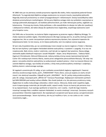 W 1860 roku po raz pierwszy została przyznana nagroda dla statku, który najszybciej pokonał Ocean Atlantycki. Tą nagrodą była błękitna wstęga zawieszona na szczycie masztu zwycięskiej jednostki. Nagrodę stworzyli przewoźnicy w celach propagandowych i reklamowych. Dzisiaj nazwalibyśmy takie działanie przemyślanym marketingiem. Od tej pory błękitna wstęga stała się symbolem zwycięstwa w wyścigu jednostek pływających, od statków pełnomorskich, po małe rekreacyjne jachty, żaglówki czy katamarany. Promują się miasta, kluby jachtowe, a dla zawodników to okazja nie tylko do rywalizacji i zdobywania trofeów, ale także okazja do spotkania braci żeglarskiej, wspólnego śpiewania szant przy kropelce rumu. Od 1949 roku w Szczecinie, na Jeziorze Dąbie rozgrywane są jesienne regaty o Błękitną Wstęgę. To chyba najstarsze polskie regaty. Charakterystyczne dla tego wyścigu jest to, że jachty startują razem i wygrywa ten, kto w czasie rzeczywistym pokona wyznaczony dystans, bez używania trapezów do balastowania łodzi. Co też znaczy, że im lżejsza jednostka, tym ma większe szanse wygranej. W tym roku 8 października, po raz sześddziesiąty trzeci stanęli na starcie żeglarze z Polski i z Niemiec. My też tam byliśmy i pod żaglem Helukabel dzielnie walczyliśmy z rywalami i z pogodą. A ta nas nie rozpieszczała. Było zimno, mokro i wietrznie, czyli tak jak na regatach byd powinno. Naszą załogę stanowiła piątka dzielnych mężczyzn: Leszek Wojtalik – skiper, Jerzy Wojnarowicz , Tadeusz Rytel , Zygmunt Chmielewski, Edmund Matuszczak. Jedyną żeoską stroną naszej reprezentacji był jacht Carter 30 o wdzięcznym imieniu Maria, zwana przez załogantów pieszczotliwie Marysią. Tak więc nas pięciu i ona jedna dzielnie walczyliśmy na wzburzonych wodach jeziora. I chod na maszcie Marysi nie zawisła błękitna wstęga, ręce bolały od szotów, a linię mety przekroczyliśmy zmoknięci i zziębnięci, byliśmy dumni z ukooczonego wyścigu. W regatach uczestniczyło 35 załóg, w tym czołówka szczecioskich żeglarzy regatowych. Faworyt , obrooca zeszłorocznego tytułu, jacht „TOMAHOWK” Piotra Zbroi, zaraz po wyjściu ze startu stracił maszt i nie ukooczył zawodów. Odpadł też jacht „SAVONKA”. Na 33. jachty metę przekroczyliśmy, jako 30. załoga. Zwyciężył jacht „BRYZA 33” Tomasza Piaseckiego. Najlepszym niemieckim jachtem był MIN DROOM pod wodzą Lothara Mielke. Nie chodzi jednak o to, kto pierwszy przekroczy metę. Żeglarstwo to walka maluczkiego człowieka z siłami natury. Odczucia, kiedy wiatr wypełnia żagle, szum trzepoczącego materiału jak skrzydła ważki, zapach wody i bryza na twarzy jak poranna rosa – te są najważniejsze. A po wyścigu spotkanie w tawernie, rum i szanty. A jeśli do tego możemy rozwinąd naszego foka z wielkim napisem Helukabel, to warto zmoknąd i zmarznąd. Zarażamy naszych pracowników i klientów żeglarstwem. Bo największym szczęściem jest łączyd pracę z przyjemnościami życia pozazawodowego. Sezon się kooczy, ale my już myślimy o tym, co nas czeka za rok. I znów rozwiniemy żagle….