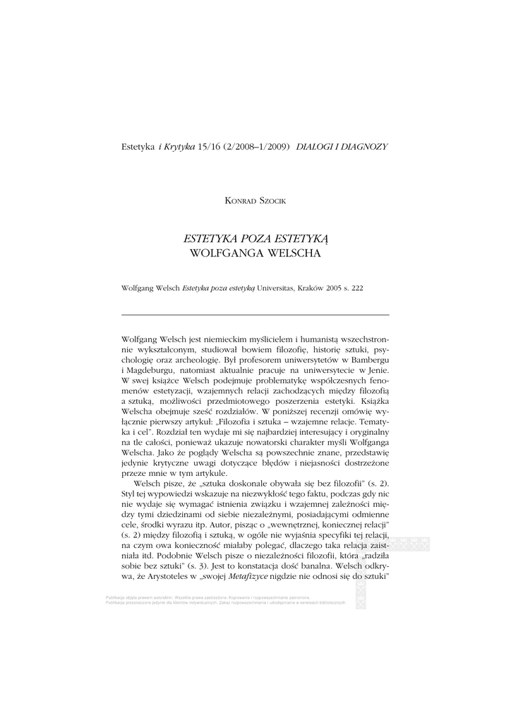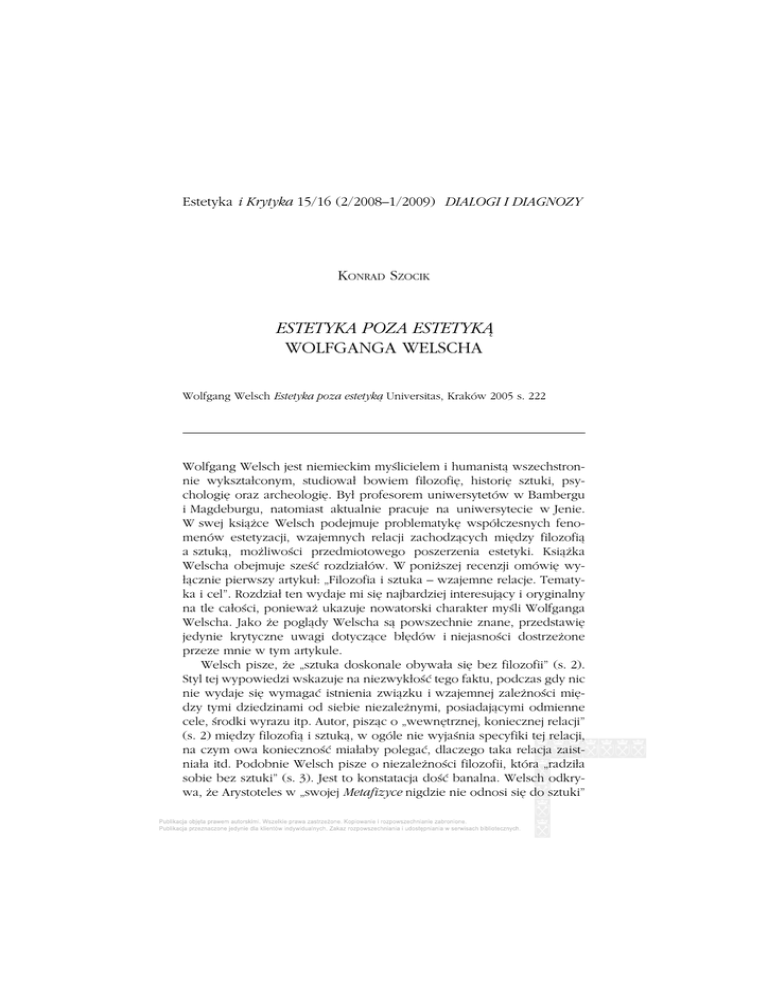 Estetyka i Krytyka 15/16 (2/2008–1/2009) DIALOGI I DIAGNOZY KONRAD SZOCIK ESTETYKA POZA ESTETYKĄ WOLFGANGA WELSCHA Wolfgang Welsch Estetyka poza estetyką Universitas, Kraków 2005 s. 222 Wolfgang Welsch jest niemieckim myślicielem i humanistą wszechstronnie wykształconym, studiował bowiem filozofię, historię sztuki, psychologię oraz archeologię. Był profesorem uniwersytetów w Bambergu i Magdeburgu, natomiast aktualnie pracuje na uniwersytecie w Jenie. W swej książce Welsch podejmuje problematykę współczesnych fenomenów estetyzacji, wzajemnych relacji zachodzących między filozofią a sztuką, możliwości przedmiotowego poszerzenia estetyki. Książka Welscha obejmuje sześć rozdziałów. W poniższej recenzji omówię wyłącznie pierwszy artykuł: „Filozofia i sztuka – wzajemne relacje. Tematyka i cel”. Rozdział ten wydaje mi się najbardziej interesujący i oryginalny na tle całości, ponieważ ukazuje nowatorski charakter myśli Wolfganga Welscha. Jako że poglądy Welscha są powszechnie znane, przedstawię jedynie krytyczne uwagi dotyczące błędów i niejasności dostrzeżone przeze mnie w tym artykule. Welsch pisze, że „sztuka doskonale obywała się bez filozofii” (s. 2). Styl tej wypowiedzi wskazuje na niezwykłość tego faktu, podczas gdy nic nie wydaje się wymagać istnienia związku i wzajemnej zależności między tymi dziedzinami od siebie niezależnymi, posiadającymi odmienne cele, środki wyrazu itp. Autor, pisząc o „wewnętrznej, koniecznej relacji” (s. 2) między filozofią i sztuką, w ogóle nie wyjaśnia specyfiki tej relacji, na czym owa konieczność miałaby polegać, dlaczego taka relacja zaistniała itd. Podobnie Welsch pisze o niezależności filozofii, która „radziła sobie bez sztuki” (s. 3). Jest to konstatacja dość banalna. Welsch odkrywa, że Arystoteles w „swojej Metafizyce nigdzie nie odnosi się do sztuki” Publ i kacj aobj ęt apr awem aut or ski mi .Wszel ki epr awazast r zeżone.Kopi owani eir ozpowszechni ani ezabr oni one. Publ i kacj apr zeznaczonej edyni edl akl i ent ów i ndywi dual nych.Zakazr ozpowszechni ani aiudost ępni ani aw ser wi sachbi bl i ot ecznych. 332 Konrad Szocik (s. 3). Autor traktuje to jako dowód na niezależność filozofii od sztuki. To prawda, ale zagadnieniu sztuki Arystoteles poświęca inne dzieła, na przykład Retorykę i Poetykę. Zdaniem Welscha, „sztuka w nowoczesnej epoce zaczęła nagle potrzebować estetyki” (s. 3). Czy rzeczywiście? Czy sztuka nie poradziłaby sobie bez teorii? Według Welscha, „sztuka utraciła uznanie kulturowe przez autonomizację (przestała bowiem spełniać funkcje moralne, religijne itp.) i stała się niezrozumiała” (s. 5). Oczywiście, rzeczywistość przedstawiana przez dzieła sztuki niemimetycznej, nierealistycznej, może być niezrozumiała dla odbiorcy. Ale wydaje się, że czynnik rozumienia dzieła, choć ważny, nie jest najistotniejszy w relacji z odbiorcą. Sztuka bowiem wywołuje inne przeżycia, niekoniecznie będąc przy tym zrozumiałą. Autor zauważa, że w epoce nowoczesnej sztuka zamknęła się w „złotej klatce, złotym getcie własnego świata” (s. 5). Z tym twierdzeniem również trudno się zgodzić, bowiem sztuka nigdy nie cieszyła się wielką, powszechną popularnością, ale zawsze stanowiła rozrywkę elitarną, praktykowaną przez nielicznych. Uważam, że współczesna sytuacja jest zupełnym przeciwieństwem tezy Welscha, jeśli za formę sztuki uznamy film, udostępniany w formie masowej przez telewizję, kino itp. – nigdy sztuka nie była bardziej popularna niż obecnie. Welsch za jedyny cel estetyki uznaje ukazanie znaczenia i roli sztuki dla kultury i społeczeństwa: „estetyka filozoficzna została wymyślona jako agencja reklamowa na usługach sztuki” (s. 6). Uważam, że celem filozofów była raczej refleksja nad fenomenem sztuki, analiza tego fenomenu jako wytworu ludzkiej aktywności itp., a nie jej popularyzacja. Takie rozumienie zadań estetyki pozwala Welschowi na sformułowanie następującego zarzutu pod adresem filozofii: „estetyka nie służyła sztuce, lecz filozofii” (s. 6). Jednak, jak zauważyłem powyżej, upowszechnianie sztuki nie należy do zadań filozofii sztuki. Autor krytykuje filozofię za to, że nie koncentruje się ona na pojedynczych dziełach. Uważam, że specyfiką refleksji filozoficznej jest właśnie obiektywizacja, uogólnianie i abstrahowanie, podczas gdy dokładna analiza jednostkowych przypadków jest domeną nauk szczegółowych, empirycznych, a zatem już nie filozofii. Przedmiotem filozofii jest ogólny sens i znaczenie sztuki, a nie rozpatrywanie poszczególnych dzieł. Welsch zauważa, że pewne dzieła mogą nie odpowiadać pojęciu sztuki wypracowanemu przez dany system filozoficzny – tę sytuacje nazywa „katastrofalnym następstwem” (s. 12). Jednak nie istnieje żadna wiążąca definicja sztuki, tym bardziej że na przestrzeni wieków powstało ich wiele, a ewentualna propozycja podana przez jakiś system filozoficzny nie jest przecież arbitralnym orzeczeniem. Publ i kacj aobj ęt apr awem aut or ski mi .Wszel ki epr awazast r zeżone.Kopi owani eir ozpowszechni ani ezabr oni one. Publ i kacj apr zeznaczonej edyni edl akl i ent ów i ndywi dual nych.Zakazr ozpowszechni ani aiudost ępni ani aw ser wi sachbi bl i ot ecznych. Estetyka poza estetyką Wolfganga Welscha 333 W swoim artykule Welsch popełnia błąd rzeczowy, przywołując Arthura C. Danto jako twórcę instytucjonalnej definicji sztuki. W rzeczywistości jej autorem jest George Dickie. Autor podkreśla, że wypracowane dotychczas określenia sztuki nie mają ogólnego, uniwersalnego charakteru. To prawda, chociaż pierwszy człon definicji, co do którego panowała zgoda – dzieło sztuki jako wytwór świadomej ludzkiej aktywności, wydaje się odpowiadać wszystkim dziełom, chociaż sztuka to nie jedyny świadomy produkt człowieka. Natomiast definicj