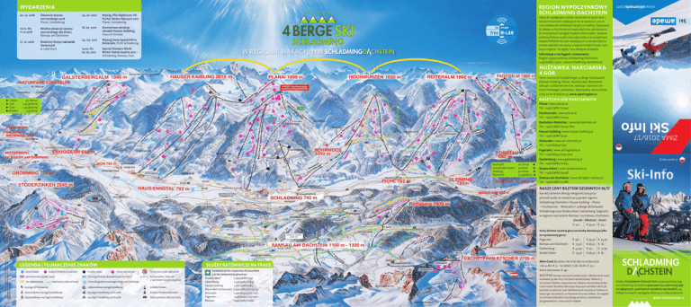 02. 12. 2016 Otwarcie sezonu narciarskiego 2016 Planai, Schladming 24. 01. 2017 Wyścig »The Nightrace« FIS Puchar Świata mężczyzn 2017 Planai, Schladming 10.12. bis 11.12.2016 Wielkie otwarcie sezonu narciarskiego dla dzieci, Ramsau am Dachstein 18. 02. 2017 Koncertowa atrakcja – ośrodek Hauser Kaibling, Haus im Ennstal 17. 12. 2016 Rodzinny festyn narciarski Steiermark w całej Styrii 24. 02. 2017 Wyścig Snow Speed Hill w Reiteralm, Pichl-Schladming 14.03. bis 25. 03. 2017 Special Olympics World Winter Games Austria 2017 – Schladming, Ramsau, Graz www.skiamade.com REGION WYPOCZYNKOWY SCHLADMING-DACHSTEIN WYDARZENIA należy do największych centrów narciarskich w Austrii wraz z lodowcem Dachstein znajdującym się na wysokosci 2.700 m 100% szlaków jest ośnieżanych od góry aż w dolinę. Zapraszamy do zabawy na 185 kilometrach wspaniałych tras, skorzystania z 76 nowoczesnych wyciągów linowych, które szybko i sprawnie przeniosą Państwa w góry oraz odpoczynku w 90 przyjemnych chatach! PORADA dla osób niejeżdżących na nartach: bilet na zimowe wędrówki jest ważny na wybrane kolejki liniowe i autobusy w regionie. Szczegóły i ceny dostępne na żądanie. W REGIONIE WAKACYJNYM Informacje o noclegach i zamawianie: Region wypoczynkowy Schladming-Dachstein: +43(0)3687/23310 | www.schladming-dachstein.at if t g sl Verbindungslift ge r tte slifte lif t e Has Reit era lm » Silv er J et« Rei tera lm I ift gsl n Übu I hn s t i li f Hauser Kaibling | www.hauser-kaibling.at Tel.: +43(0)3686/3030 g Übun eck n Übu Pl a n a i 3 e r hn r fa Muldenlifte 6 e r G a sselh öh e b a h n I I « Je t egg reu n p ’n J et »P hn lba rta e Ob H op Dachstein-Gletscher | www.derdachstein.at Tel.: +43(0)3687/22042-800 Sep if t Lär chk oge lba hn Planai II erl Re ite ral m er Fast enb erg 6er -Te ll a Forstaub Tau ern Se ilb a Mi n urz e o ch w hn H G i pf el b a ina g6 b l in Pl a n a i I ft enli bod ser o M P lan e st ai W Ro hrm o o sI Qu att ral p Kai ft s li oos Hochwurzen | www.planai.at Tel.: +43(0)3687/22042 Ro o hr m Radstadt 10 minut ¯ Autostrada Tauern 15 minut ¯ Salzburg 50 minut ¯ München 2,15 godziny ¯ I os ZIMA 2016/17 Fritz-Blitz itm Ski Info Hö fi-E xpr ess NASZYCH 9 GÓR NARCIARSKICH Planai | www.planai.at Tel.: +43(0)3687/22042 t Ga lst erb erg Vo Vo rder rde fa rfa ger ge II rI rlif el Teren narciarski Schladminger 4-Berge-Skischaukel (Hauser Kaibling, Planai, Hochwurzen, Reiteralm) oferuje 123 kilometrów tras nonstop i stanowi centrum zimowego szaleństwa. Zapraszamy od wczesnej zimy aż do Wielkanocy! www.sportregion.cc e Jäg nd e Go fa g bu ng ter K 8e Hin We I rzen hwu Hoc er ing el We itm oo sli ft hn H s au l ai b nd III alm iter Re e ba Ü I o r-G ahn mb lal l a t rgs Bu urzen II Hochw rb a h n ift ckl nne o S r w ies fi-E Hö ess xp r S ende II t Mi NOWOŚĆ: 8-osobowa kolejka krzesełkowa Burgstallalmbahn Märchen Tellerlift hn ha ter hn ba us 6 er ft mli gal b er Alm 40 Minut 1,45 godziny 1,45 godziny 3 godziny ter G al s Gip fel ba if t Ennslingalm-L ˘ Liezen ˘ Linz ˘ Graz ˘Wiedeń Gip fel bah nV ord erk ar HUŚTAWKA NARCIARSKA 4 GÓR Reiteralm | www.ski-reiteralm.at Tel.: +43(0)6454/7357 Fageralm | www.ski-fageralm.at Tel.: +43(0)6454/7357-900 Zima 2016/17 Galsterberg | www.galsterberg.at Tel.: +43(0)3685/22845 ZIMA 2016/17 Stoderzinken | www.stoderzinken.at Tel.: +43(0)3685/23248 Ramsau am Dachstein | www.skiregion-ramsau.at Tel.: +43(0)3687/21086 Ski Info NASZE CENY BILETÓW DZIENNYCH 16/17 rgb be tis Drachenlift I Übungslift Kalilift Karty dzienne na jedną górę narciarską obowiązują tylko ft Zau be rli lift berg Lärch Ri t Gip fe ll i f t ft isli R i tt Drachenlift II Roßf eldlif t ah n Karnety dzienne oferują nieograniczoną przyjemność jazdy na nartach po 9 górach regionu Schladming-Dachstein: Hauser Kaibling – Planai – Hochwurzen – Reiteralm (= 4-Berge-SkiSchaukel Schladming) oraz Stoderzinken, Galsterberg, Fageralm, w regionie narciarskim Ramsau i na lodowcu Dachstein. Dorośli Młodzież Dzieci € 50,– € 37,50 € 25,– Cudowny zimowy świat Kali na wymienionej górze. Adl Fageralm Ramsau am Dachstein Galsterberg Stoderzinken I Ad l I ift erl tI er li f tor saneczkowy trasa długodystansowego biegu narciarskiego wędrowny szlak zimowy Korzystanie z ZipLine z karnetem nie jest możliwe wyciąg do holowania czteroosobowy wyciąg krzesełkowy kolejka linowa dwuosobowy wyciąg krzesełkowy wyciąg krzesełkowy na 6 osób kolejka linowa kabinowa trzyoosobowy wyciąg krzesełkowy wyciąg krzesełkowy na 8 osób linia autobusu dla narciarzy Hunerkogellift Dachstein Südwandbahn Austriascharte er Carving Strecke, Boardercross Fun Park Locations on the respective ski mountain Can be contacted by phone on: Stoderzinken: +43(0)3686/2756 Galsterberg: +43(0)3685/22845 Hauser Kaibling: +43(0)3686/2183 Planai and Hochwurzen: +43(0)3687/22042-155 Reiteralm: +43(0)6454/7357-220 Fageralm: +43(0)6454/7357-900 Ramsau: +43(0)3687/21086 t t sc h permanentny szybki zjazd To nie jest szlak narciarski ll if te i n trasa narciarska tal ter s , trudne szlaki ris M it szlaki o średniej trudności Sky-Line rgk Schla dm i n g e r G l e łatwe szlaki SŁUŻBY RATOWNICZE NA TRASIE l ift LEGENDA | TŁUMACZENIE ZNAKÓW Kl a n g Foto: Leo Himsl, www.bildarchiv.leohimsl.com Zastrzega się możliwość pomyłki, zmiany cen i błędu drukarskiego. Be € 46,– € 35,50 € 42,50 € 35,50 € 35,50 € 26,50 € 32,– € 26,50 € 23,50 € 18,– € 21,50 € 18,– Mini-Card dla dzieci do 6 lat (do rocznika 2011) 1 do 4 dni: € 5.– na dzień | 5 do 18 dni: € 25.– Karta sezonowa: € 49.– WSYSTKIE karnety narciarskie (skipas wraz z biletami dziennymi) wydawane są jako Key Card (karta bezdotykowa). Wkład € 3.– otrzymacie Państwo z powrotem po oddaniu nieuszkodzonej Key Card w kasie. Wszelkie informacje dotyczące karnetów takich jak karnetów na pół dnia i kart wielodniowych otrzymacie Państwo w kasach gór narciarskic