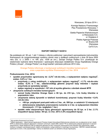 Warszawa, 25 lipca 2014 r. Komisja Nadzoru Finansowego Plac Powstańców Warszawy 1 Warszawa Giełda Papierów Wartościowych w Warszawie S.A. ul. Książęca 4 Polska Agencja Prasowa ul. Bracka 6/8 Warszawa CeTO S.A. RAPORT BIEŻĄCY 54/2014 Na podstawie art. 56 ust. 1 pkt 1 Ustawy o ofercie publicznej i warunkach wprowadzania instrumentów finansowych do zorganizowanego systemu obrotu oraz o spółkach publicznych z dnia 29 lipca 2005 roku (Dz. U. z 2005 r. nr 184, poz. 1539 ze zm.), Zarząd Orange Polska S.A. przekazuje do wiadomości wybrane dane finansowe i operacyjne dotyczące działalności Grupy Kapitałowej Orange Polska („Grupa”, „Orange Polska”) za drugi kwartał i pierwsze półrocze 2014 roku. Orange Polska informuje o kontynuacji solidnych trendów komercyjnych oraz o poprawie wyników finansowych w 2 kw. 2014 Podsumowanie 2 kw. 2014: spadek przychodów ograniczony do -2,2%1 rok-do-roku, z wyłączeniem wpływu regulacji2, wobec -5,0% w 1 kw. przychody z usług mobilnych, z wyłączeniem wpływu regulacji2, +1,7% rok-do-roku wobec -0,3% w 1 kw., odzwierciedlają głównie przyrost bazy klientów i wyższe przychody ze sprzedaży sprzętu wpływ regulacji w wysokości -107 mln zł wynika głównie z obniżek stawek MTR utrzymanie solidnych trendów komercyjnych: wzrost liczby klientów Orange Open o 66 tys. do 418 tys., 3,3x liczby klientów w poprzednim roku utrzymanie dobrej dynamiki w telefonii komórkowej: przyrost liczby klientów +3,4% rok-do-roku +99 tys. przyłączeń post-paid netto w 2 kw., ok. 500 tys. w ostatnich 12 miesiącach zbilansowana statystyka przenoszenia numerów w 2 kw. (z wyłączeniem klientów kluczowych: +11 tys. względem 1 kw.) spadek netto stacjonarnych łączy głosowych ograniczony do 52 tys. w 2 kw. (1,1% wszystkich łączy) wobec -95 tys. w 2 kw. 2013 (1,9% wszystkich łączy) 1 Wg wyników finansowych pro forma Wpływ regulacyjny – wpływ decyzji regulacyjnych Prezesa Urzędu Komunikacji Elektronicznej odnośnie cen za połączenia (w tym: stawki MTR za zakańczanie połączeń głosowych w sieciach ruchomych, stawki SMS, stawki FTR za zakańczanie połączeń głosowych w sieciach stacjonarnych, stawki detaliczne F2M za połączenia głosowe do sieci ruchomych wykonywane przez klientów sieci stacjonarnej, opłaty hurtowe w usługach szerokopasmowych, stawki za korzystanie z usług mobilnych w roamingu) na przychody i EBITDA; metoda kalkulacji oparta jest na ruchu z roku poprzedniego i różnicy na stawkach przed i po wdrożeniu decyzji regulacyjnej. 2 1 skorygowana3 EBITDA +5,1% rok-do-roku, marża EBITDA na poziomie 33,7% (+3,3 pp. rokdo-roku), dzięki poprawie dynamiki przychodów oraz ścisłej kontroli kosztów 78 mln zł oszczędności kosztowych osiągniętych w 2 kw., o 19 mln zł więcej niż w 1 kw. organiczne przepływy pieniężne w 1 półroczu w wysokości 482 mln zł, +83 mln zł rok-doroku; potwierdzony cel całoroczny w zakresie organicznych przepływów pieniężnych Kluczowe wskaźniki (w mln zł), MSSF przychody Grupy 2 kw. 2014 2 kw. 2013 Zmiana 1 poł. 2014 1 poł. 2013 Zmiana 3 084 z wyłączeniem wpływu regulacji 3 261 1 2 3 1 040 990 3 33,7% 30,4% zysk netto 94 76 organiczne przepływy pieniężne 325 189 skorygowana EBITDA skorygowana EBITDA (jako % przychodów) 1 -5,4% 1 -2,2% 1 +5,1% 1 6 079 1 1 -6,7% 1 -3,6% 1 1 -2,2% 1 1 +1,5 pp 6 513 1 991 2 036 32,8% 31,3% +23,7% 365 157 +132% +72,0% 482 399 +20,8% +3,3 pp 1 1 Odnosząc się do wyników Grupy w 2 kw. 2014 roku, Bruno Duthoit, Prezes Zarządu, stwierdził: „W 2 kw. utrzymaliśmy w większości obszarów dobre wyniki komercyjne, osiągając jednocześnie solidne wyniki w zakresie przychodów, rentowności i przepływów pieniężnych. Oferta konwergentna Open nadal dobrze się sprzedaje, liczba klientów komórkowych w segmencie post-paid w dalszym ciągu rosła, a przy tym ograniczyliśmy utratę stacjonarnych łączy głosowych do zaledwie 1,1%. Aby zwiększyć dostępność smartfonów wprowadziliśmy możliwość ich zakupu na raty, co znacząco polepszyło dynamikę przychodów i rentowność. Jednak presja cenowa, zwłaszcza na rynku biznesowym, wpłynęła negatywnie na ARPU z usług mobilnych. Wyniki segmentu szerokopasmowego również pozostają niezadowalające. Program ścisłej optymalizacji kosztów ponownie przyniósł dobre wyniki, przyczyniając się pozytywnie do osiągniętych w tym kwartale wyników finansowych. W maju, krajowy regulator wystąpił z propozycją deregulacji rynku szerokopasmowego, która – jeżeli przebiegnie pomyślnie – może otworzyć przed nami nowe możliwości. W 2 kw. przyspieszyliśmy działania operacyjne: pokrycie siecią 3G zwiększyło się do 97% mieszkańców Polski, a pokrycie siecią 4G przekroczyło 50%. Nie przewidujemy, żeby konkurencja na rynku miała osłabnąć, lecz uważamy, że dysponujemy właściwymi narzędziami, by skutecznie jej sprostać. Spodziewamy się także, że oferty wprowadzone w 2 kw. zyskają na dynamice.” 3 Wg wyników finansowych pro forma, skorygowanych o zysk ze sprzedaży Wirtualnej Polski (191 mln zł) w 1 kw. 2014, wpływ niektórych roszczeń i sporów sądowych (-44 mln zł) w 2 kw. 2013 oraz koszty restrukturyzacji (-18 mln zł) w 1 kw. 2013 2 Wyniki finansowe spadek przychodów ograniczony do zaledwie -2,2% rok-do-roku, z wyłączeniem wpływu regulacji Skonsolidowane przychody w 2 kw. wyniosły 3 084 mln zł i w ujęciu rocznym zmniejszyły się o 5,4%. Spadek odzwierciedla utratę przychodów (107 mln zł) w wyniku decyzji regulacyjnych, głównie obniżki stawek MTR4. Z wyłączeniem wpływu regulacji, spadek przychodów został ograniczony do 70 mln zł, tj. 2,2% rok-do-roku, wobec 159 mln zł (5%) w poprzednim kwartale. Na poprawę wyników złożyły się przede wszystkim dwa czynniki. Po pierwsze, przychody z usług mobilnych, z wyłączeniem wpływu regulacji, wzrosły o 1,7% w ujęciu rocznym, do czego przyczyniło się wprowadzenie ratalnej sp