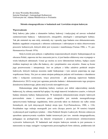 dr Anna Weronika Brzezińska Instytut Etnologii i Antropologii Kulturowej Uniwersytet im. Adama Mickiewicza w Poznaniu Metoda etnogeograficzna w badaniach nad Łowickim strojem ludowym Wprowadzenie Strój ludowy jako jeden z elementów kultury ludowej i tradycyjnej od zawsze wzbudzał zainteresowanie badaczy – ludoznawców, etnografów, etnologów i antropologów kultury. Tak jak zmieniał się sam strój, zmieniały się i sposoby jego badania oraz dokumentowania. Badanie zagadnień związanych z ubiorem codziennym i odświętnym to także obserwowanie procesów kulturowych, których ubiór jest wyrazem i manifestacją (Turnau 1986, s. 75; por. Hermanowicz-Nowak 1976). Strój Łowicki jest jednym z najbardziej rozpoznawalnych strojów funkcjonujących na obszarze Polski, zapewne nie bez znaczenia jest to, iż jest bardzo efektowny oraz występuje w wielu lokalnych odmianach. Uznać go można za żywe laboratorium kultury, będące często źródłem inspiracji nie tylko dla badaczy, ale i projektantów oraz artystów. Znane są liczne jego przetworzenia i interpretacje. Jest on jednym z kilku zaledwie polskich strojów ludowych, których tradycja noszenia nadal funkcjonuje i tym samym pojawiają się jego współczesne formy. Nie jest on zatem strojem pełniącym jedynie roli kostiumu o charakterze tylko i wyłącznie scenicznym, wręcz przeciwnie – jak pokazują najnowsze badania (Bartosiewicz 2015) wciąż jest ogromna potrzeba badania i dokumentowania tego przejawu dziedzictwa kulturowego, jakim strój Łowicki niewątpliwie jest. Dokumentując jakąś dziedzinę kultury ważnym jest dobór odpowiedniej metody badawczej, by zebrany materiał był spójny i by mógł stanowić świadectwo czasów, w których badane elementy kultury funkcjonowały. W kontekście dokumentowania strojów ludowych powszechnie znana i stosowana przez etnografów jest metoda monograficznego opracowywania badanego zagadnienia, która pozwala także na śledzenie nie tylko zmian formalnych, ale tych dotyczących funkcji stroju (por. Fryś-Pietraszkowa, 1988, s. 134). Przykładem tego rodzaju monografii jest seria (licząca prawie już 50 tomów) książek wydawanych pod wspólnym tytułem – Atlas Polskich Strojów Ludowych. Równie ciekawym sposobem opracowywania wyników badań terenowych jest tzw. metoda etnogeograficzna, polegająca na posługiwaniu się danymi związanymi z przestrzennym zróżnicowaniem wytworów kulturowych. W badaniach nad strojem ludowym metoda ta jest pomocna w nanoszeniu na mapy zasięgów występowania poszczególnych form odzieży, poddawania ich 1 analizie oraz tworzeniu na jej podstawie dalszych typologii. Materiały z obszaru Polski (w tym także zagadnienia dot. odzieży ludowej) zebrane zostały pod postacią Polskiego Atlasu Etnograficznego. Atlas Polskich Strojów Ludowych W roku 1949 z inicjatywy Józefa Gajka Polskie Towarzystwo Ludoznawcze powołało serię wydawniczą Atlas Polskich Strojów Ludowych. Założeniem tej serii było od samych jej początków (i kontynuowane jest do dzisiaj) monograficzne opracowywanie poszczególnych typów strojów w układzie regionalnym, występujących w granicach Polski. Jak wskazywała Krystyna Hermanowicz-Nowak: „Poszczególne zeszyty, poza rolą naukowego dokumentu, miały równocześnie za zadanie pomagać w reaktywowaniu stroju regionalnego” (1977). Zatem monografie miały nie tylko pokazywać stan badań nad danym strojem, ale i być pewnego rodzaju poradnikiem dla zespołów ludowych i folklorystycznych, dla animatorów i członków społeczności lokalnych zainteresowanych podtrzymywaniem (lub odtwarzaniem) tradycji związanych z funkcjonowaniem na ich obszarze strojów ludowych. Z tego też powodu dużą uwagę przywiązywano zawsze do materiału ilustracyjnego dobranego w taki sposób, by pokazywał różne typy i odmiany poszczególnych części odzieży codziennej, odświętnej i obrzędowej. Dodatkowo w zeszytach pojawiały się wykroje opisywanych elementów ubioru. Kolejno ukazujące się zeszyty z serii uporządkowane zostały wg. podziałów regionalnych, wyróżniając sześć głównych: (1) Pomorze, (2) Wielkopolska, (3) Śląsk, (4) Mazowsze i Sieradzkie, (5) Małopolska oraz (6) Wielkopolska i Małopolska. Jednym z istotnych kryteriów, którymi mieli kierować się autorzy było to, by opisywane regionalne odmiany poszczególnych strojów zaprezentowano pod kątem jego zasięgu oraz ogólnego opisu, uwzględniając najbardziej charakterystyczne i typowe jego elementy (Gajek, 1954, s. 798-799). W roku 1953 ukazał się zeszyt nr 7 zatytułowany „Strój Łowicki”, którego autorką została Jadwiga Świątkowska. Nakład książki liczącej 65 stron, zilustrowanej w znacznej czarno-białymi fotografiami oraz zawierającym barwne tablice wyniósł… 6 200 egzemplarzy. Wydawnictwo to jest obecnie osiągalne jedynie na rynku antykwarycznym, czynione są starania by mogło się ukazać w Bibliotece Cyfrowej PIA. Prawie 50 lat później ukazał się kolejny zeszyt dotyczący stroju Łowickiego, przygotowany przez etnografkę związaną z Muzeum w Łowiczu – Magdalenę Bartosiewicz. Publikacja jej autorstwa – „Strój ludowy po 1953 roku”1 jako 42 zeszyt w serii Atlas Polskich Strojów Ludowych. To wydawnictwo bez 1 Książka została wydana w ramach projektu „Projekt ATLAS POLSKICH STROJÓW LUDOWYCH: kontynuacja prac wydawniczych, przeprowadzenie badań terenowych i kwerend źródłowych oraz cyfryzacja 2 precedensu – to jedyny strój (jak dotąd), któremu poświęcono dwa opracowania w ramach jednej i tej samej serii wydawniczej. Redakcja APSL podjęła decyzję o przygotowaniu książki, która pokazywałaby dalszy (po 1953 roku) rozwój stroju księżackiego. Ważnym atutem jest to, iż zostały przeprowadzone dodatkowe badania terenowe2, które pozwoliły autorce na uzupełnienie zebranej bogatej dokumentacji. Jedną z form prezentacji całości materiału badawczego było opracowanie map