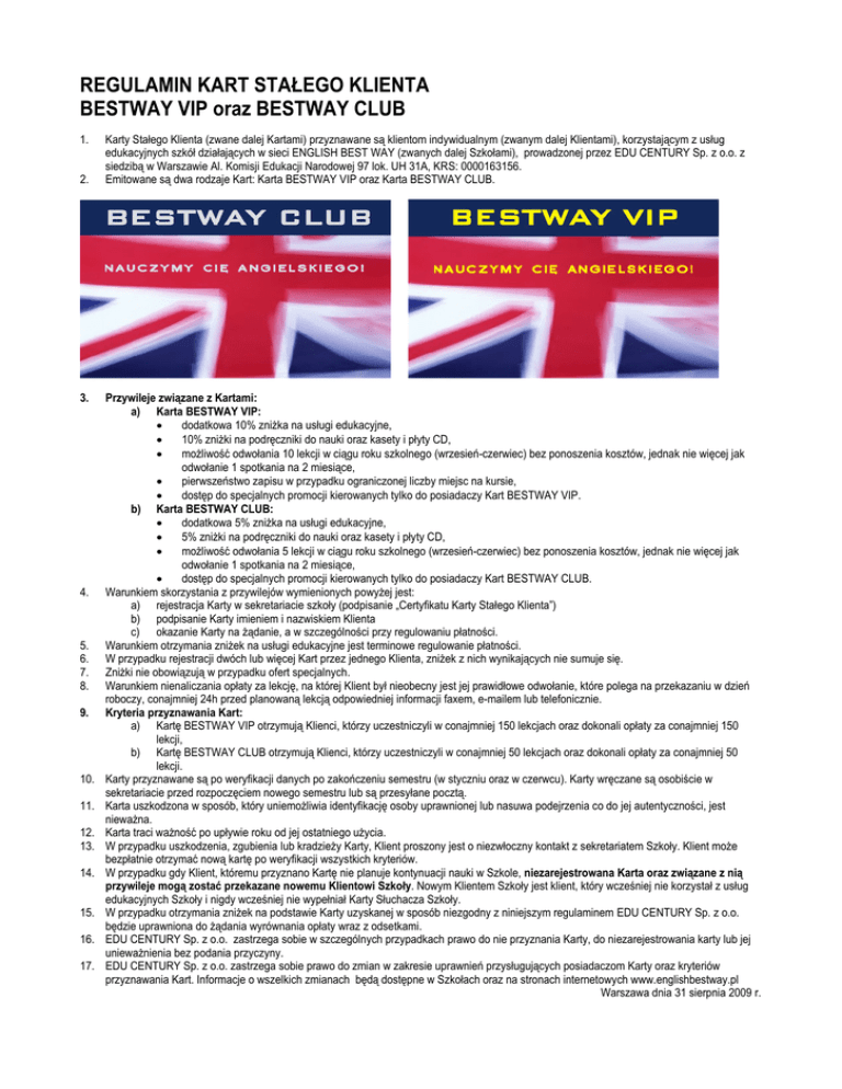 REGULAMIN KART STAŁEGO KLIENTA BESTWAY VIP oraz BESTWAY CLUB 1. 2. 3. 4. 5. 6. 7. 8. 9. 10. 11. 12. 13. 14. 15. 16. 17. Karty Stałego Klienta (zwane dalej Kartami) przyznawane są klientom indywidualnym (zwanym dalej Klientami), korzystającym z usług edukacyjnych szkół działających w sieci ENGLISH BEST WAY (zwanych dalej Szkołami), prowadzonej przez EDU CENTURY Sp. z o.o. z siedzibą w Warszawie Al. Komisji Edukacji Narodowej 97 lok. UH 31A, KRS: 0000163156. Emitowane są dwa rodzaje Kart: Karta BESTWAY VIP oraz Karta BESTWAY CLUB. Przywileje związane z Kartami: a) Karta BESTWAY VIP: • dodatkowa 10% zniŜka na usługi edukacyjne, • 10% zniŜki na podręczniki do nauki oraz kasety i płyty CD, • moŜliwość odwołania 10 lekcji w ciągu roku szkolnego (wrzesień-czerwiec) bez ponoszenia kosztów, jednak nie więcej jak odwołanie 1 spotkania na 2 miesiące, • pierwszeństwo zapisu w przypadku ograniczonej liczby miejsc na kursie, • dostęp do specjalnych promocji kierowanych tylko do posiadaczy Kart BESTWAY VIP. b) Karta BESTWAY CLUB: • dodatkowa 5% zniŜka na usługi edukacyjne, • 5% zniŜki na podręczniki do nauki oraz kasety i płyty CD, • moŜliwość odwołania 5 lekcji w ciągu roku szkolnego (wrzesień-czerwiec) bez ponoszenia kosztów, jednak nie więcej jak odwołanie 1 spotkania na 2 miesiące, • dostęp do specjalnych promocji kierowanych tylko do posiadaczy Kart BESTWAY CLUB. Warunkiem skorzystania z przywilejów wymienionych powyŜej jest: a) rejestracja Karty w sekretariacie szkoły (podpisanie „Certyfikatu Karty Stałego Klienta”) b) podpisanie Karty imieniem i nazwiskiem Klienta c) okazanie Karty na Ŝądanie, a w szczególności przy regulowaniu płatności. Warunkiem otrzymania zniŜek na usługi edukacyjne jest terminowe regulowanie płatności. W przypadku rejestracji dwóch lub więcej Kart przez jednego Klienta, zniŜek z nich wynikających nie sumuje się. ZniŜki nie obowiązują w przypadku ofert specjalnych. Warunkiem nienaliczania opłaty za lekcję, na której Klient był nieobecny jest jej prawidłowe odwołanie, które polega na przekazaniu w dzień roboczy, conajmniej 24h przed planowaną lekcją odpowiedniej informacji faxem, e-mailem lub telefonicznie. Kryteria przyznawania Kart: a) Kartę BESTWAY VIP otrzymują Klienci, którzy uczestniczyli w conajmniej 150 lekcjach oraz dokonali opłaty za conajmniej 150 lekcji, b) Kartę BESTWAY CLUB otrzymują Klienci, którzy uczestniczyli w conajmniej 50 lekcjach oraz dokonali opłaty za conajmniej 50 lekcji. Karty przyznawane są po weryfikacji danych po zakończeniu semestru (w styczniu oraz w czerwcu). Karty wręczane są osobiście w sekretariacie przed rozpoczęciem nowego semestru lub są przesyłane pocztą. Karta uszkodzona w sposób, który uniemoŜliwia identyfikację osoby uprawnionej lub nasuwa podejrzenia co do jej autentyczności, jest niewaŜna. Karta traci waŜność po upływie roku od jej ostatniego uŜycia. W przypadku uszkodzenia, zgubienia lub kradzieŜy Karty, Klient proszony jest o niezwłoczny kontakt z sekretariatem Szkoły. Klient moŜe bezpłatnie otrzymać nową kartę po weryfikacji wszystkich kryteriów. W przypadku gdy Klient, któremu przyznano Kartę nie planuje kontynuacji nauki w Szkole, niezarejestrowana Karta oraz związane z nią przywileje mogą zostać przekazane nowemu Klientowi Szkoły. Nowym Klientem Szkoły jest klient, który wcześniej nie korzystał z usług edukacyjnych Szkoły i nigdy wcześniej nie wypełniał Karty Słuchacza Szkoły. W przypadku otrzymania zniŜek na podstawie Karty uzyskanej w sposób niezgodny z niniejszym regulaminem EDU CENTURY Sp. z o.o. będzie uprawniona do Ŝądania wyrównania opłaty wraz z odsetkami. EDU CENTURY Sp. z o.o. zastrzega sobie w szczególnych przypadkach prawo do nie przyznania Karty, do niezarejestrowania karty lub jej uniewaŜnienia bez podania przyczyny. EDU CENTURY Sp. z o.o. zastrzega sobie prawo do zmian w zakresie uprawnień przysługujących posiadaczom Karty oraz kryteriów przyznawania Kart. Informacje o wszelkich zmianach będą dostępne w Szkołach oraz na stronach internetowych www.englishbestway.pl Warszawa dnia 31 sierpnia 2009 r.