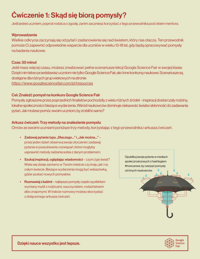 Ćwiczenie 1: Skąd się biorą pomysły? Jeśli jesteś uczniem, poproś rodzica o zgodę, zanim zaczniesz korzystać z tego przewodnika pod okiem mentora. Wprowadzenie Wielkie odkrycia zaczynają się od pytań i zastanowienia się nad światem, który nas otacza. Ten przewodnik pomoże Ci zapewnić odpowiednie wsparcie dla uczniów w wieku 13-18 lat, gdy będą opracowywać pomysły na badania naukowe. Czas: 30 minut Jeśli masz więcej czasu, możesz zrealizować pełne scenariusze lekcji Google Science Fair w swojej klasie. Dzięki nim łatwo przedstawisz uczniom nie tylko Google Science Fair, ale i inne konkursy naukowe. Scenariusze są dostępne dla różnych grup wiekowych na stronie https://www.googlesciencefair.com/pl/resources Cel: Znaleźć pomysł na konkurs Google Science Fair Pomysły zgłoszone przez poprzednich finalistów pochodziły z wielu różnych źródeł – inspiracji dostarczały rodziny, lokalne społeczności i bieżące wydarzenia. Wśród naukowców dominuje ciekawość świata i skłonność do zadawania pytań. Jak możesz pomóc swoim uczniom, by zrobili to samo? Arkusz ćwiczeń: Trzy metody na znalezienie pomysłu Omów ze swoimi uczniami poniższe trzy metody, korzystając z tego przewodnika i arkusza ćwiczeń. • Zadawaj pytania typu „Dlaczego...” i „Jak można...” – przez jeden dzień obserwuj swoje otoczenie i zadawaj pytania w poszukiwaniu rozwiązań, które mogłyby usprawnić metody radzenia sobie z danym problemem. • Szukaj inspiracji, oglądając wiadomości – czym żyje świat? Wiele się dzieje zarówno w Twoim mieście czy kraju, jak i na całym świecie. Bieżące wydarzenia mogą być wskazówką, gdzie szukać nowych pomysłów. • Rozmawiaj z ludźmi – najlepsze pomysły często są efektem wymiany myśli z rodzicami, nauczycielem, rodzeństwem albo znajomymi. W trakcie rozmowy możesz skorzystać z dołączonego arkusza ćwiczeń. Dzięki nauce wszystko jest lepsze. Opublikuj swoje pytanie w mediach społecznościowych z hashtagiem #howcanwe, by czerpać pomysły od innych naukowców. Arkusz ćwiczeń: Struktura ułatwiająca znalezienie pomysłu To technika poszukiwania pomysłów, która polega na zachęceniu uczniów do poważnego zastanowienia się nad tym, co interesuje ich najbardziej, a co – najmniej. To świetny sposób na zwiększenie zaangażowania w projekt. Uczniom będzie dużo łatwiej utrzymać zainteresowanie projektami i motywację, jeśli będą realizować swoje pasje. Dodatkowe pytania, które należy zadać, gdy uczniowie ukończą pracę nad arkuszem ułatwiającym znalezienie pomysłu: • Dlaczego właśnie ta dziedzina znajduje się na górze/dole? • Czy jest jakiś zawód z tym związany? • Jakie urządzenia w Twoim domu z tego korzystają? • Jaki pomysł mógłby łączyć Twoje trzy najważniejsze zainteresowania naukowe? Na przykład Mihir, jeden ze zwycięzców edycji 2014, stworzył drona, który wymagał połączenia umiejętności programowania z dużą wiedzą z dziedziny mechaniki i fizyki. Co dalej? Gdy uczniowie mają już pytania, muszą przekuć je w projekty, które należy traktować jako metodę na znalezienie odpowiedzi. Pomoże im w tym następny przewodnik, ale mogą też skorzystać z Generatora ulepszania, czyli narzędzia ułatwiającego znalezienie inspiracji przed rozpoczęciem pracy. Pozwala ono uczniom znaleźć tematy do zgłębienia oraz powiązania między tym, co kochają, tym, w czym są dobrzy, oraz tym, co chcieliby ulepszyć. Wskazówka od uczestnika poprzedniej edycji „Stale zachęcaj swoich uczniów do Skąd wzięły się pomysły na projekty prezentowane w poprzednich konkursach? Finaliści i zwycięzcy wcześniejszych edycji konkursu, których liczba przekracza 80 osób, pochodzą z różnych zakątków świata (z ponad 100 krajów), a ich projekty dotyczyły różnych obszarów nauki i techniki. Zobacz, co ich zaciekawiło: https://www.googlesciencefair. com/pl/competition/previous-years poznawania bieżących problemów naukowych i nie bój się, że nie zrozumieją oni wszystkich aspektów zastosowania danej technologii. Pozwól im realizować pasje i w pełni korzystać z potencjału swojej młodości, kreatywności i wyobraźni, gdy będą szukać nowych sposobów rozwiązania najbardziej palących problemów”. – Andrew Bramante, Connecticut, USA Mentor Olivii Hallisey, laureatki nagrody głównej Google Science Fair 2015 Dzięki nauce wszystko jest lepsze.