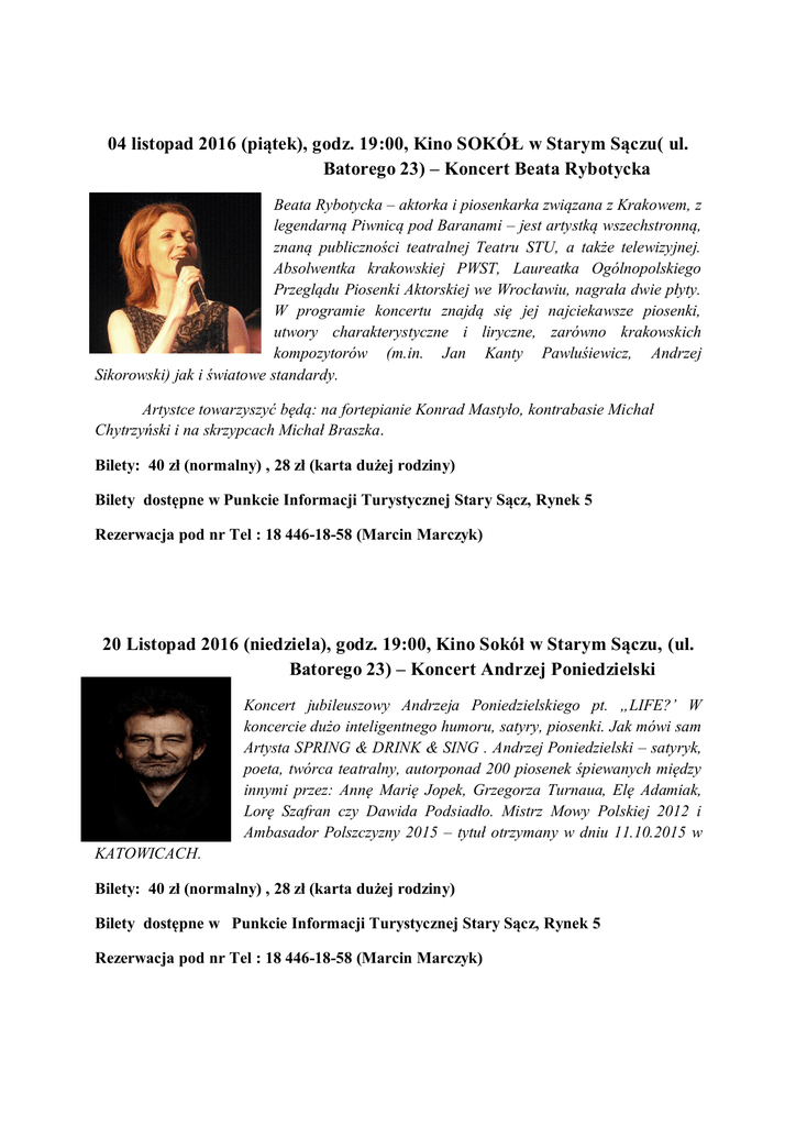 04 listopad 2016 (piątek), godz. 19:00, Kino SOKÓŁ w Starym Sączu( ul. Batorego 23) – Koncert Beata Rybotycka Beata Rybotycka – aktorka i piosenkarka związana z Krakowem, z legendarną Piwnicą pod Baranami – jest artystką wszechstronną, znaną publiczności teatralnej Teatru STU, a także telewizyjnej. Absolwentka krakowskiej PWST, Laureatka Ogólnopolskiego Przeglądu Piosenki Aktorskiej we Wrocławiu, nagrała dwie płyty. W programie koncertu znajdą się jej najciekawsze piosenki, utwory charakterystyczne i liryczne, zarówno krakowskich kompozytorów (m.in. Jan Kanty Pawluśiewicz, Andrzej Sikorowski) jak i światowe standardy. Artystce towarzyszyć będą: na fortepianie Konrad Mastyło, kontrabasie Michał Chytrzyński i na skrzypcach Michał Braszka. Bilety: 40 zł (normalny) , 28 zł (karta dużej rodziny) Bilety dostępne w Punkcie Informacji Turystycznej Stary Sącz, Rynek 5 Rezerwacja pod nr Tel : 18 446-18-58 (Marcin Marczyk) 20 Listopad 2016 (niedziela), godz. 19:00, Kino Sokół w Starym Sączu, (ul. Batorego 23) – Koncert Andrzej Poniedzielski Koncert jubileuszowy Andrzeja Poniedzielskiego pt. „LIFE?’ W koncercie dużo inteligentnego humoru, satyry, piosenki. Jak mówi sam Artysta SPRING & DRINK & SING . Andrzej Poniedzielski – satyryk, poeta, twórca teatralny, autorponad 200 piosenek śpiewanych między innymi przez: Annę Marię Jopek, Grzegorza Turnaua, Elę Adamiak, Lorę Szafran czy Dawida Podsiadło. Mistrz Mowy Polskiej 2012 i Ambasador Polszczyzny 2015 – tytuł otrzymany w dniu 11.10.2015 w KATOWICACH. Bilety: 40 zł (normalny) , 28 zł (karta dużej rodziny) Bilety dostępne w Punkcie Informacji Turystycznej Stary Sącz, Rynek 5 Rezerwacja pod nr Tel : 18 446-18-58 (Marcin Marczyk) 26 Listopad 2016 (sobota), godz. 19:00, Kino Sokół w Starym Sączu (ul. Batorego 23) – Koncert Ania Dąbrowska Jak śpiewa w jednej z nowych piosenek – nic nie musi. To raczej my musieliśmy czekać na nowy materiał Ani Dąbrowskiej, tym razem wyjątkowo długo. Artystka poświęciła się bowiem życiu rodzinnemu, ale też postanowiła przemeblować swoje zaplecze artystyczne: zmieniła management, skład zespołu, producenta i wreszcie na nowo wymyśliła swoją muzykę, pozostawiając na szczęście te elementy, które zawsze były nieodzownymi elementami jej stylu: pastelowe ciepło głosu, szlachetne melodie i szczyptę melancholii w tle. Bilety : 55 zł (normalny) , 38 zł (karta dużej rodziny) Bilety dostępne w Punkcie Informacji Turystycznej w Starym Sączu, Rynek 5 Rezerwacja pod nr Tel : 18 446-18-58 (Marcin Marczyk) 02 grudzień 2016 (piątek), godz. 19:00, Kino Sokół w Starym Sączu (ul. Batorego 23) – Koncert Sarsa SARSA – kompozytorka, autorka tekstów, gra na instrumentach klawiszowych i ukulele. Laureatka licznych konkursów na twórczość własną. Fluktua, TakloopNie, SarsaParilla, Emma Nuci Organic..to tylko niektóre z jej projektów muzycznych zakorzenionych w szeroko pojętej muzyce alternatywnej. Współtworzyła wiele projektów eksperymentując z muzyką od jazzu, poezji śpiewanej po alternatywnego rocka i muzykę elektroniczną. Jej charakterystyczny wokal stylistycznie stawiany był obok głosu Dolores O’Riordan z The Cranberries, Florence Welch z Florence And The Machine, Sia, CocoRosie. Bilety : 55 zł (normalny) , 38 zł (karta dużej rodziny) Bilety dostępne w Punkcie Informacji Turystycznej w Starym Sączu, Rynek 5 Rezerwacja pod nr Tel : 18 446-18-58 (Marcin Marczyk) 30 grudzień 2016 (piątek), godz. 19:00, Kino Sokół w Starym Sączu (ul. Batorego 23) – Piwnica pod Baranami Słowem, które najlepiej opisuje tradycyjny Piwniczny Koncert Świąteczny jest „magia”. Zimowy i magiczny tytuł „Dla Miasta i Świata” otula słuchacza niezwykłą tajemnicą. Muzyka od pierwszych nut wprowadza w eteryczny i niepowtarzalny świat tworzony przez Artystów „Piwnicy pod Baranami”, a kolejne utwory odkrywają 60-letnią historię krakowskiej legendy. Wyjątkowość tegorocznego świątecznego koncertu potęguje fakt, iż „Piwnica pod Baranami” rozpoczęła huczne obchody jubileuszu 60-lecia swojego istnienia, co pozwala spodziewać się premier i niespodzianek.Kraków, mgła, śnieg, kolędnicy, grzane galicyjskie wino korzenne to obrazy, które zimową porą towarzyszą Świątecznym Koncertom „Piwnicy Pod Baranami”. Spektakle legendarnej Piwnicy gromadzą od wielu lat tysiące widzów pragnących poczuć nastrój krakowskiej cyganerii i zatopić się w magiczny świat sztuki. Bilety : 55 zł (normalny) , 38 zł (karta dużej rodziny) Bilety dostępne w Punkcie Informacji Turystycznej w Starym Sączu, Rynek 5 Rezerwacja pod nr Tel : 18 446-18-58 (Marcin Marczyk)