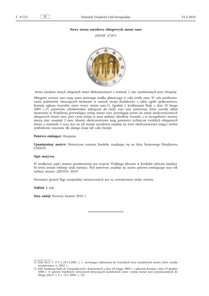 C 47/22 PL Dziennik Urzędowy Unii Europejskiej Nowa strona narodowa obiegowych monet euro (2010/C 47/07) Strona narodowa nowych obiegowych monet okolicznościowych o nominale 2 euro wyemitowanych przez Hiszpanię Obiegowe monety euro mają status prawnego środka płatniczego w całej strefie euro. W celu poinformo wania podmiotów obracających monetami w ramach swojej działalności, a także ogółu społeczeństwa, Komisja ogłasza wszystkie nowe wzory monet euro (1). Zgodnie z konkluzjami Rady z dnia 10 lutego 2009 r. (2), państwom członkowskim należącym do strefy euro oraz państwom, które zawarły układ monetarny ze Wspólnotą przewidujący emisję monet euro, przysługuje prawo do emisji okolicznościowych obiegowych monet euro, przy czym emisja ta musi spełniać określone warunki, a w szczególności monety muszą mieć nominał 2 euro. Monety okolicznościowe mają parametry techniczne zwykłych obiegowych monet o nominale 2 euro, lecz na ich stronie narodowej znajduje się wzór okolicznościowy mający istotne symboliczne znaczenie dla danego kraju lub całej Europy. Państwo emitujące: Hiszpania Upamiętniany motyw: Historyczne centrum Kordoby znajdujące się na liście Światowego Dziedzictwa UNESCO Opis motywu: W środkowej części monety przedstawione jest wnętrze Wielkiego Meczetu w Kordobie (obecnie katedry). Po lewej stronie widnieje znak mennicy. Pod motywem znajduje się nazwa państwa emitującego oraz rok wybicia monety „ESPAÑA 2010”. Dwanaście gwiazd flagi europejskiej umieszczonych jest na zewnętrznym otoku monety. Nakład: 8 mln Data emisji: Pierwszy kwartał 2010 r. (1) Zob. Dz.U. C 373 z 28.12.2001, s. 1, zawierający odniesienie do wszystkich stron narodowych monet, które zostały wyemitowane w 2002 r. (2) Zob. konkluzje Rady ds. Gospodarczych i Finansowych z dnia 10 lutego 2009 r. i zalecenie Komisji z dnia 19 grudnia 2008 r. w sprawie wspólnych wytycznych dotyczących narodowych stron i emisji monet euro przeznaczonych do obiegu (Dz.U. L 9 z 14.1.2009, s. 52). 25.2.2010