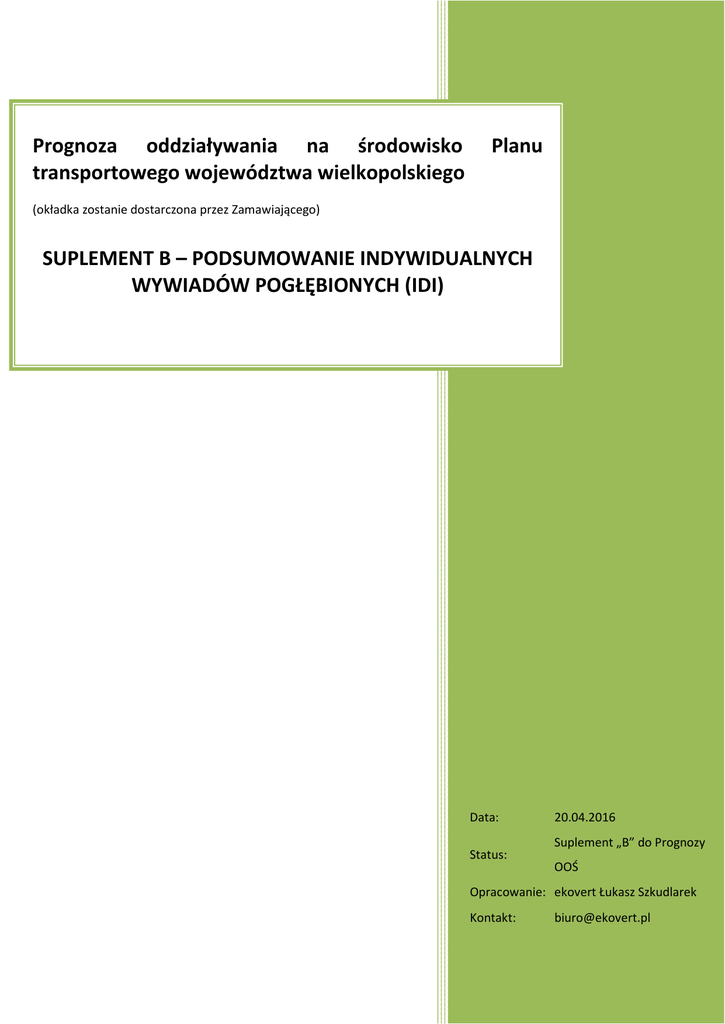 Prognoza oddziaływania na środowisko transportowego województwa wielkopolskiego Planu (okładka zostanie dostarczona przez Zamawiającego) SUPLEMENT B – PODSUMOWANIE INDYWIDUALNYCH WYWIADÓW POGŁĘBIONYCH (IDI) Data: 20.04.2016 Suplement „B” do Prognozy Status: OOŚ Opracowanie: ekovert Łukasz Szkudlarek Kontakt: [email protected] Podsumowanie indywidualnych wywiadów pogłębionych (IDI) oraz zogniskowanych wywiadów grupowych Celem przeprowadzenia wywiadów było pozyskanie wszechstronnej eksperckiej wiedzy umożliwiającej odpowiedź na pytanie na ile analizowany dokument odpowiada faktycznym potrzebom w zakresie rozwoju transportu, a w następnej kolejności sformułowanie definicji rekomendowanych standardów projektowych, których zastosowanie pozwoliłoby zmniejszyć negatywne oddziaływanie infrastruktury transportowej na środowisko i ludzi. Wywiady przeprowadzono z przedstawicielami jednostek i instytucji odpowiedzialnych za szeroko rozumiany rozwój sieci transportowej oraz ochronę środowiska. Do badania w uzgodnieniu z Zamawiającym wybrano: • • • • • • • • • • • • • • Wielkopolskie Biuro Planowania Przestrzennego, Departament Infrastruktury UMWW, Wielkopolski Zarząd Dróg Wojewódzkich, Departament Polityki Regionalnej UMWW, Departament Programów Rozwoju Obszarów Wiejskich UMWW, Departament Rolnictwa i Rozwoju Wsi UMWW, Departament Środowiska UMWW, Zespół Parków Krajobrazowych Województwa Wielkopolskiego, Departament Transportu UMWW, Departament Wdrażania Programu Regionalnego UMWW, Wojewódzki Fundusz Ochrony Środowiska i Gospodarki Wodnej w Poznaniu, PKP Polskie Linie Kolejowe S.A, Zakład Linii Kolejowych w Poznaniu, PKP Polskie Linie Kolejowe S.A, Centrum Realizacji Inwestycji – Region Zachodni, Generalna Dyrekcja Dróg Krajowych i Autostrad. W przeprowadzanych wywiadach pogłębionych stosowano sformalizowaną strukturę pytań, jednak w zależności od jednostki dostosowywano je specyfiki problematyki, którą się ona zajmuje. Pośród wskazanych instytucji w tworzeniu dokumentu na różnych etapach brały udział Wielkopolskie Biuro Planowania Przestrzennego, Departament Polityki Regionalnej UMWW, , Wielkopolski Zarząd Dróg Wojewódzkich. Pozostałe podmioty nie miały z nim bezpośredniej styczności na etapie tworzenia, w większości miały wiedzę o jego istnieniu i ogólne pojęcie o zawartości. Na pytanie czy dokument odpowiada faktycznym potrzebom w zakresie rozwoju transportu w większości odpowiadano że obejmuje on jedynie część potrzeb, ponieważ dotyczy wsparcia infrastruktury drogowej i kolejowej na poziomie możliwym do realizacji ze środków WRPO 2014+. Najczęściej wskazywano, że najistotniejszym problemem jest zły stan infrastruktury i brak obwodnic miejscowości utrudniający tranzyt i na te potrzeby program odpowiada. Duży nacisk położono również na kryteria premiujące spójność z projektami zrealizowanymi w poprzedniej perspektywie. Kolejne elementy wywiadu skupiły się już na wiedzy ekspertów w zakresie identyfikacji oddziaływań projektów związanych z rozwojem i modernizacją infrastruktury transportowej oraz ich minimalizacji. Praktycznie wszyscy rozmówcy jako najistotniejsze oddziaływania związane z eksploatacją sieci transportowej wskazywali generowany do środowiska hałas oraz odprowadzane z powierzchni szlaków transportowych wody. Z etapem realizacji wiązali dodatkowo generowanie odpadów, zajęcie/utwardzenie terenu. Respondenci wskazywali własne doświadczenia w tym zakresie skupiając się jednak przede wszystkim na działaniach mających na celu minimalizację wskazywanych oddziaływań. W zakresie ograniczania emisji hałasu najwięcej doświadczeń miały: Departament Środowiska UMWW, Wielkopolski Zarząd Dróg Wojewódzkich, PKP Polskie Linie Kolejowe S.A, Zakład Linii Kolejowych i Generalna Dyrekcja Dróg Krajowych i Autostrad, Departament Infrastruktury UMWW. Ich przedstawiciele wskazywali szeroki wachlarz działań, tak organizacyjnych jak i technicznych, możliwych do zastosowania w przypadku zakładanych inwestycji. Pośród działań organizacyjnych wskazywano możliwości sterowania strukturą ruchu, np. przez redukcję ilości pojazdów ciężkich na wybranych odcinkach dróg czy tworzenie stref uspokojonego ruchu lub sterowanie jego prędkością, poprzez egzekwowanie dopuszczalnych limitów prędkości lub budowę infrastruktury spowalniającej ruch. W zakresie typowych rozwiązań technicznych najczęściej pojawiały się działania remontowe eliminujące koleiny, ubytki, źle osadzone studzienki oraz generalne remonty nawierzchni. Natomiast w przypadku niewystarczalności powyższych wskazywano stosowanie „cichych” nawierzchni, ekrany akustyczne lub wały ziemne oraz tworzenie pasów zwartej zieleni ochronnej. Wskazywano też działania w zakresie właściwego kształtowania przestrzeni w otoczeniu źródeł hałasu, np. przez odpowiednie zapisy w planach miejscowych wymuszające np. odsunięcie nowej zabudowy, czy stosowanie materiałów o wskazanych parametrach akustycznych w celu zabezpieczenia budynków przed hałasem. Osobno dyskutowanym zagadnieniem były wskazywane jako jedno ze stosowanych w ostateczności (gdy brak jest możliwości dotrzymania standardów za pomocą innych środków) również obszary ograniczonego użytkowania. W przypadku linii kolejowych poza adaptacją powyższym metod wymieniano możliwości szlifowania i smarowania szyn środkami, które pozwalają zredukować hałas przejeżdżających pociągów. Jeśli chodzi o ograniczanie oddziaływań na wody, podobnie jak w przypadku hałasu najistotniejsze uwagi wskazali przedstawiciele wymienionych już podmiotów. Wymieniano przede wszystkim rozwiązania projektowe, np. zabezpieczenie rowów odwadniających w postaci geowłókniny filtracyjnej, przegrody w rowach umożliwiające opóźnienie dopływu, zbiorniki retencyjne i retencyjno – infiltracyjne lu