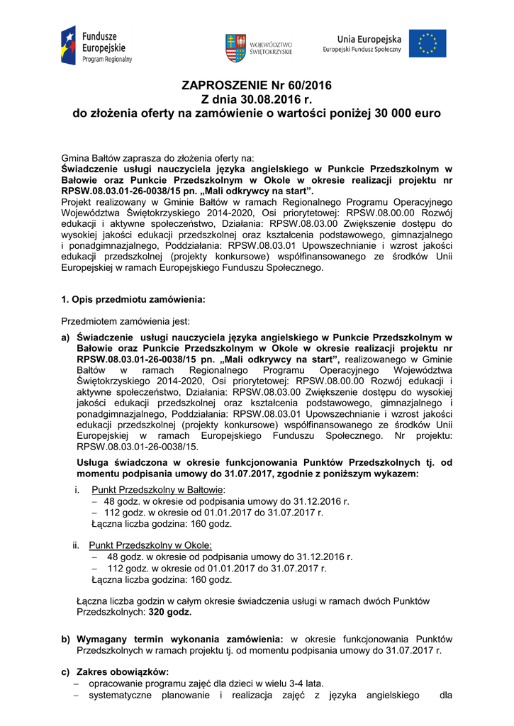 ZAPROSZENIE Nr 60/2016 Z dnia 30.08.2016 r. do złożenia oferty na zamówienie o wartości poniżej 30 000 euro Gmina Bałtów zaprasza do złożenia oferty na: Świadczenie usługi nauczyciela języka angielskiego w Punkcie Przedszkolnym w Bałowie oraz Punkcie Przedszkolnym w Okole w okresie realizacji projektu nr RPSW.08.03.01-26-0038/15 pn. „Mali odkrywcy na start”. Projekt realizowany w Gminie Bałtów w ramach Regionalnego Programu Operacyjnego Województwa Świętokrzyskiego 2014-2020, Osi priorytetowej: RPSW.08.00.00 Rozwój edukacji i aktywne społeczeństwo, Działania: RPSW.08.03.00 Zwiększenie dostępu do wysokiej jakości edukacji przedszkolnej oraz kształcenia podstawowego, gimnazjalnego i ponadgimnazjalnego, Poddziałania: RPSW.08.03.01 Upowszechnianie i wzrost jakości edukacji przedszkolnej (projekty konkursowe) współfinansowanego ze środków Unii Europejskiej w ramach Europejskiego Funduszu Społecznego. 1. Opis przedmiotu zamówienia: Przedmiotem zamówienia jest: a) Świadczenie usługi nauczyciela języka angielskiego w Punkcie Przedszkolnym w Bałowie oraz Punkcie Przedszkolnym w Okole w okresie realizacji projektu nr RPSW.08.03.01-26-0038/15 pn. „Mali odkrywcy na start”, realizowanego w Gminie Bałtów w ramach Regionalnego Programu Operacyjnego Województwa Świętokrzyskiego 2014-2020, Osi priorytetowej: RPSW.08.00.00 Rozwój edukacji i aktywne społeczeństwo, Działania: RPSW.08.03.00 Zwiększenie dostępu do wysokiej jakości edukacji przedszkolnej oraz kształcenia podstawowego, gimnazjalnego i ponadgimnazjalnego, Poddziałania: RPSW.08.03.01 Upowszechnianie i wzrost jakości edukacji przedszkolnej (projekty konkursowe) współfinansowanego ze środków Unii Europejskiej w ramach Europejskiego Funduszu Społecznego. Nr projektu: RPSW.08.03.01-26-0038/15. Usługa świadczona w okresie funkcjonowania Punktów Przedszkolnych tj. od momentu podpisania umowy do 31.07.2017, zgodnie z poniższym wykazem: i. Punkt Przedszkolny w Bałtowie: 48 godz. w okresie od podpisania umowy do 31.12.2016 r. 112 godz. w okresie od 01.01.2017 do 31.07.2017 r. Łączna liczba godzina: 160 godz. ii. Punkt Przedszkolny w Okole: 48 godz. w okresie od podpisania umowy do 31.12.2016 r. 112 godz. w okresie od 01.01.2017 do 31.07.2017 r. Łączna liczba godzina: 160 godz. Łączna liczba godzin w całym okresie świadczenia usługi w ramach dwóch Punktów Przedszkolnych: 320 godz. b) Wymagany termin wykonania zamówienia: w okresie funkcjonowania Punktów Przedszkolnych w ramach projektu tj. od momentu podpisania umowy do 31.07.2017 r. c) Zakres obowiązków: opracowanie programu zajęć dla dzieci w wielu 3-4 lata. systematyczne planowanie i realizacja zajęć z języka angielskiego dla przedszkolaków. wybór materiałów dydaktycznych dla danej grupy wiekowej. organizowanie warsztatu pracy, przygotowywanie pomocy do pracy. dokonywanie ewaluacji pracy dydaktycznej. prowadzenie obserwacji rozwoju dzieci w zakresie kompetencji językowych – języka angielskiego. Informowanie rodziców o postępach w nauce dzieci. prowadzenie dokumentacji przebiegu zajęć zgodnie ze zleceniami Kierownika projektu oraz pozostałej dokumentacji pedagogicznej. ścisła współpraca z nauczycielami i kadrą zarządzającą projektu. przestrzeganie i realizacja poleceń kadry zarządzającej projektem. d) Wymiar czasu pracy: i. Punkt Przedszkolny w Bałtowie: 48 godz. w okresie od podpisania umowy do 31.12.2016 r. 112 godz. w okresie od 01.01.2017 do 31.07.2017 r. Łączna liczba godzina: 160 godz. ii. Punkt Przedszkolny w Okole: 48 godz. w okresie od podpisania umowy do 31.12.2016 r. 112 godz. w okresie od 01.01.2017 do 31.07.2017 r. Łączna liczba godzina: 160 godz. Łączna liczba godzin w całym okresie świadczenia usługi w ramach dwóch Punktów Przedszkolnych: 320 godz. e) Miejsce wykonywania pracy: i. Gmina Bałtów – Punkt Przedszkolny w Bałtowie, 27-423 Bałtów, Bałtów 32 ii. Gmina Bałtów – Punkt Przedszkolny w Okole, 27-423 Bałtów, Okół 82 f) Rodzaj umowy: umowa zlecenie g) Wspólny Słownik Zamówienia: 80110000-8 – usługi szkolnictwa przedszkolnego 80000000-4 – usługi edukacyjne i szkoleniowe 2. O udzielenie niniejszego zamówienia mogą ubiegać się wykonawcy, którzy spełniają warunki, dotyczące: a. Posiadania uprawnień do wykonywania określonej działalności lub czynności, jeżeli przepisy prawa nakładają obowiązek ich posiadania. Działalność prowadzona na potrzeby wykonania przedmiotu zamówienia nie wymaga posiadania specjalnych uprawnień. Zamawiający dokona oceny spełniania warunków udziału w postępowaniu w tym zakresie na podstawie oświadczenia o spełnianiu warunków udziału w postępowaniu. b. Posiadania wiedzy i doświadczenia. W zakresie spełniania tego warunku wymagane jest wykazanie przez Wykonawcę posiadania: Wykształcenie wymagane dla nauczycieli języka angielskiego zgodne z Rozporządzeniem Ministra Edukacji Narodowej z dnia 15 marca 2009 r. w sprawie szczegółowych kwalifikacji wymaganych od nauczycieli oraz określenia szkół i wypadków, w których można zatrudnić nauczycieli niemających wyższego wykształcenia lub ukończonego zakładu kształcenia nauczycieli – ocena na podstawie kwestionariusza osobowego (Załącznik nr 4) oraz kserokopii odpowiedniego/odpowiednich dyplomu/dyplomów. Min. 6-miesięczne doświadczenie w pracy z dziećmi jako nauczyciel języka angielskiego - ocena na podstawie świadectw pracy, zaświadczeń bądź innych dokumentów potwierdzających staż pracy; Aktualne zaświadczenie lekarskie o stanie zdrowia pozwalającym na zatrudnienie na stanowisku nauczyciela języka angielskiego w punkcie przedszkolnym lub oświadczenie o braku przeciwwskazań zdrowotnych (Załącznik nr 7) Oświadczenie o przedłożeniu aktualnej książeczki zdrowia/ lekarskiego do celów sanitarno-epidemiologicznych (Załącznik nr 5) Oświadczenie o niekaralności (Załącznik nr 6) orzeczenia Wszystkie doku