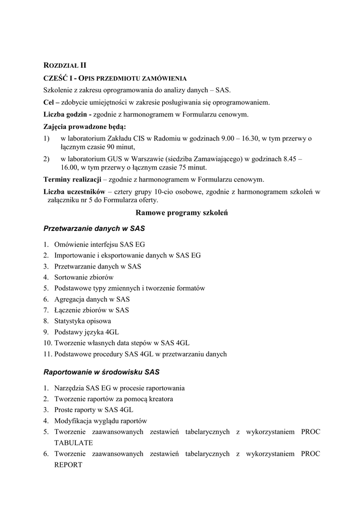 ROZDZIAŁ II CZEŚĆ I - OPIS PRZEDMIOTU ZAMÓWIENIA Szkolenie z zakresu oprogramowania do analizy danych – SAS. Cel – zdobycie umiejętności w zakresie posługiwania się oprogramowaniem. Liczba godzin - zgodnie z harmonogramem w Formularzu cenowym. Zajęcia prowadzone będą: 1) w laboratorium Zakładu CIS w Radomiu w godzinach 9.00 – 16.30, w tym przerwy o łącznym czasie 90 minut, 2) w laboratorium GUS w Warszawie (siedziba Zamawiającego) w godzinach 8.45 – 16.00, w tym przerwy o łącznym czasie 75 minut. Terminy realizacji – zgodnie z harmonogramem w Formularzu cenowym. Liczba uczestników – cztery grupy 10-cio osobowe, zgodnie z harmonogramem szkoleń w załączniku nr 5 do Formularza oferty. Ramowe programy szkoleń Przetwarzanie danych w SAS 1. 2. 3. 4. 5. 6. 7. 8. Omówienie interfejsu SAS EG Importowanie i eksportowanie danych w SAS EG Przetwarzanie danych w SAS Sortowanie zbiorów Podstawowe typy zmiennych i tworzenie formatów Agregacja danych w SAS Łączenie zbiorów w SAS Statystyka opisowa 9. Podstawy języka 4GL 10. Tworzenie własnych data stepów w SAS 4GL 11. Podstawowe procedury SAS 4GL w przetwarzaniu danych Raportowanie w środowisku SAS 1. Narzędzia SAS EG w procesie raportowania 2. Tworzenie raportów za pomocą kreatora 3. Proste raporty w SAS 4GL 4. Modyfikacja wyglądu raportów 5. Tworzenie zaawansowanych zestawień tabelarycznych z wykorzystaniem PROC TABULATE 6. Tworzenie zaawansowanych zestawień tabelarycznych z wykorzystaniem PROC REPORT 7. Raportowanie graficzne z użyciem SAS/GRAPH 8. Modyfikacja wyglądy wykresów 9. Formaty publikacji wyników 10. Definiowanie własnych styli oraz szablonów raportów 11. Tworzenie interaktywnych wykresów 12. Składanie raportu za pomocą procedury GREPLAY --------------------------------------------------------------------------------------------CZEŚĆ II - OPIS PRZEDMIOTU ZAMÓWIENIA Szkolenie w zakresie narzędzia Enterprise Architect. Cel – zdobycie umiejętności w zakresie posługiwania się oprogramowaniem. Liczba godzin - 24 godziny lekcyjne – 3 dni. Forma zajęć - wykłady i ćwiczenia. Zajęcia prowadzone będą w sali szkoleniowej Zakładu CIS w Radomiu przy ul. Planty 39/45, w godzinach 9.00 – 16.30, w tym przerwy o łącznym czasie 90 minut, Termin realizacji – 18.11.2015 – 20.11.2015 lub 25.11.2015 – 27.11.2015 Wykonawca dokona wyboru jednego z ww. terminów w Formularzu oferty. Liczba uczestników – jedna grupa 13. Osobowa. Ramowy program szkolenia 1. Wprowadzenie do EA, 2. Perspektywy modele i diagramy, 3. Tworzenie diagramów UML, 4. Dokumentowanie projektu, 5. Praca zespołowa, 6. Zarządzanie modelem, 7. Zaawansowane modelowanie, 8. Zarządzanie projektem. ------------------------------------------------------------------------------------------------CZEŚĆ III - OPIS PRZEDMIOTU ZAMÓWIENIA Szkolenie z zakresu tworzenia polityk, regulaminów, procedur, instrukcji oraz innych dokumentów w obszarze bezpieczeństwa IT i bezpieczeństwa informacji. Cel: Nauka prawidłowego tworzenia dokumentów formalnych. Liczba godzin: 16 godzin lekcyjnych - 2 dni. Forma zajęć - wykłady i ćwiczenia. Zajęcia prowadzone będą w sali szkoleniowej Głównego Urzędu Statystycznego w Warszawie, al. Niepodległości 208, w godzinach 8.45 – 16.00, w tym przerwy o łącznym czasie 75 minut. Termin realizacji – do 10.12.2015 r. Szczegółowy termin realizacji szkolenia ustalony zostanie po podpisaniu umowy. Liczba uczestników – jedna grupa 20. Osobowa. Każdy z uczestników szkolenia otrzyma materiały szkoleniowe zawierające m.in. wzory procedur i regulaminów bezpieczeństwa. Ramowy program szkolenia 1. Rola dokumentów formalnych w organizacji 2. Podstawy prawne tworzenia dokumentów formalnych 3. Rodzaje dokumentów formalnych 4. Podstawowe zasady i odpowiedzialności przy tworzeniu dokumentów formalnych 5. Dobre praktyki i standardy tworzenia dokumentów formalnych a. w obszarze IT/ICT, b. w obszarze bezpieczeństwa informacji, c. w obszarze biznesu 6. Rekomendowane/zalecane struktury i szablony dokumentów oraz dostępne źródła takich dokumentów 7. Wymagana i zalecana dokumentacja oraz przykłady prawidłowo tworzonych dokumentów 8. Zestaw (plan) dokumentów dla obszaru IT/ICT, 9. Zestaw dokumentów dla obszaru bezpieczeństwa informacji, 10. Zestaw dokumentów dla obszaru biznesu 11. Najczęściej popełniane błędy przy tworzeniu dokumentacji