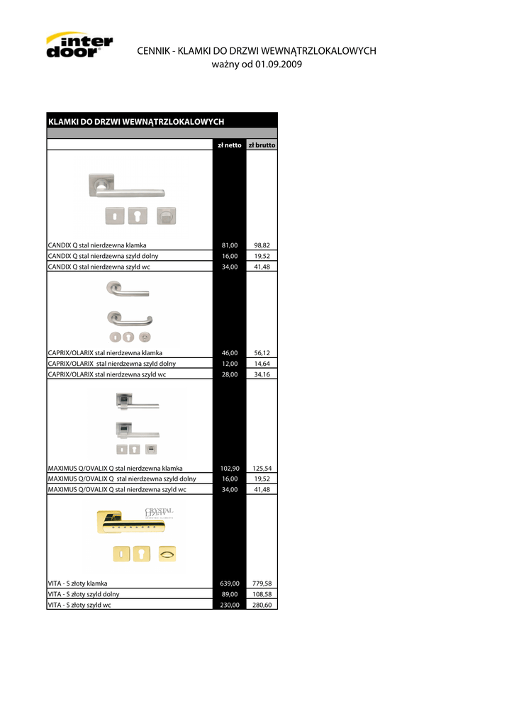 CENNIK - KLAMKI DO DRZWI WEWNĄTRZLOKALOWYCH ważny od 01.09.2009 KLAMKI DO DRZWI WEWNĄTRZLOKALOWYCH zł netto zł brutto CANDIX Q stal nierdzewna klamka 81,00 98,82 CANDIX Q stal nierdzewna szyld dolny 16,00 19,52 CANDIX Q stal nierdzewna szyld wc 34,00 41,48 CAPRIX/OLARIX stal nierdzewna klamka 46,00 56,12 CAPRIX/OLARIX stal nierdzewna szyld dolny 12,00 14,64 CAPRIX/OLARIX stal nierdzewna szyld wc 28,00 34,16 MAXIMUS Q/OVALIX Q stal nierdzewna klamka 102,90 125,54 MAXIMUS Q/OVALIX Q stal nierdzewna szyld dolny 16,00 19,52 MAXIMUS Q/OVALIX Q stal nierdzewna szyld wc 34,00 41,48 VITA - S złoty klamka 639,00 779,58 VITA - S złoty szyld dolny 89,00 108,58 VITA - S złoty szyld wc 230,00 280,60 CENNIK - KLAMKI DO DRZWI WEWNĄTRZLOKALOWYCH ważny od 01.09.2009 VITA - S chrom klamka 695,00 847,90 VITA - S chrom szyld dolny 99,00 120,78 VITA - S chrom szyld wc 239,00 291,58 VITA - S nikiel-satyna klamka 703,00 857,66 VITA - S nikiel-satyna szyld dolny 99,00 120,78 VITA - S nikiel-satyna szyld wc 249,00 303,78 DUO stal nierdzewna klamka 354,00 431,88 DUO stal nierdzewna szyld dolny 39,00 47,58 DUO stal nierdzewna szyld wc 139,00 169,58 Gałka QUATTRO stal nierdzewna 120,00 146,40 Gałka QUATTRO stal nierdzewna szyld dolny 16,00 19,52 Gałka QUATTRO stal nierdzewna szyld wc 34,00 41,48 Gałka PŁASKA stal nierdzewna Gałka PŁASKA stal nierdzewna szyld dolny 85,90 12,00 104,80 14,64 Gałka PŁASKA stal nierdzewna szyld wc 28,00 34,16 CENNIK - KLAMKI DO DRZWI WEWNĄTRZLOKALOWYCH ważny od 01.09.2009 CANDIX 72 stal nierdzewna klamka 55,00 67,10 LAVINIA chrom/nikiel/chrom/złoty klamka 159,59 194,70 LAVINIA chrom/nikiel/chrom/złoty szyld dolny 34,41 41,98 LAVINIA chrom/nikiel/chrom/złoty szyld wc 68,73 83,85 PRIMA/IMAGE stal nierdzewna klamka 67,84 82,76 PRIMA/IMAGE stal nierdzewna szyld dolny 13,44 16,40 PRIMA/IMAGE stal nierdzewna szyld wc 42,50 51,85 100,30 122,37 23,80 29,04 52,70 64,29 VICTORIA klamla 184,62 225,24 VICTORIA szyld dolny 21,54 26,28 VICTORIA szyld wc 47,69 58,18 NERIS nikiel satynowany klamka* / IMAGE Q stal nierdzewna klamla NERIS nikiel satynowany szyld dolny / IMAGE Q stal nierdzewna szyld dolny NERIS nikiel satynowany szyld wc/ IMAGE Q stal nierdzewna szyld wc CENNIK - KLAMKI DO DRZWI WEWNĄTRZLOKALOWYCH ważny od 01.09.2009 SCORPIUS klamla 161,54 197,08 SCORPIUS szyld dolny 19,21 23,44 SCORPIUS szyld wc 38,59 47,08 klamla 0 szyld dolny szyld wc ASTORIA klamla 166,16 202,72 ASTORIA szyld dolny 37,92 46,26 ASTORIA szyld wc 81,64 99,60