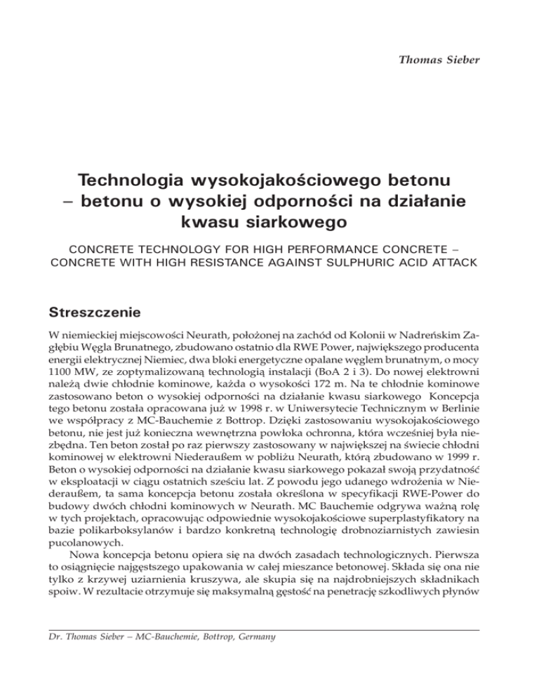 Thomas Sieber Technologia wysokojakościowego betonu – betonu o wysokiej odporności na działanie kwasu siarkowego Concrete Technology for high performance concrete – concrete with high resistance against sulphuric acid attack Streszczenie W niemieckiej miejscowości Neurath, położonej na zachód od Kolonii w Nadreńskim Zagłębiu Węgla Brunatnego, zbudowano ostatnio dla RWE Power, największego producenta energii elektrycznej Niemiec, dwa bloki energetyczne opalane węglem brunatnym, o mocy 1100 MW, ze zoptymalizowaną technologią instalacji (BoA 2 i 3). Do nowej elektrowni należą dwie chłodnie kominowe, każda o wysokości 172 m. Na te chłodnie kominowe zastosowano beton o wysokiej odporności na działanie kwasu siarkowego Koncepcja tego betonu została opracowana już w 1998 r. w Uniwersytecie Technicznym w Berlinie we współpracy z MC-Bauchemie z Bottrop. Dzięki zastosowaniu wysokojakościowego betonu, nie jest już konieczna wewnętrzna powłoka ochronna, która wcześniej była niezbędna. Ten beton został po raz pierwszy zastosowany w największej na świecie chłodni kominowej w elektrowni Niederaußem w pobliżu Neurath, którą zbudowano w 1999 r. Beton o wysokiej odporności na działanie kwasu siarkowego pokazał swoją przydatność w eksploatacji w ciągu ostatnich sześciu lat. Z powodu jego udanego wdrożenia w Niederaußem, ta sama koncepcja betonu została określona w specyfikacji RWE-Power do budowy dwóch chłodni kominowych w Neurath. MC Bauchemie odgrywa ważną rolę w tych projektach, opracowując odpowiednie wysokojakościowe superplastyfikatory na bazie polikarboksylanów i bardzo konkretną technologię drobnoziarnistych zawiesin pucolanowych. Nowa koncepcja betonu opiera się na dwóch zasadach technologicznych. Pierwsza to osiągnięcie najgęstszego upakowania w całej mieszance betonowej. Składa się ona nie tylko z krzywej uziarnienia kruszywa, ale skupia się na najdrobniejszych składnikach spoiw. W rezultacie otrzymuje się maksymalną gęstość na penetrację szkodliwych płynów Dr. Thomas Sieber – MC-Bauchemie, Bottrop, Germany i gazów. Drugim celem jest osiągnięcie maksymalnej odporności chemicznej na działanie kwasu, której można oczekiwać na podstawie składu osnowy spoiwa. Abstract In Neurath, Germany, west of Cologne, in the Rhenish Lignite Mining Area, two new lignite-fired 1100 MW- power station blocks with optimized plant engineering (BoA 2 und 3) were recently built for RWE Power, Germany’s biggest power producer. Part of the new power plant are two cooling towers, each 172 meters tall. For these cooling towers, a high performance concrete with high resistance against sulphuric acid attack was used. The concrete concept has already been developed in 1998 at the Technical University of Berlin in cooperation with MC-Bauchemie, Bottrop. By using high performance concrete, the formerly essential inner protective coating is no longer necessary. This concrete was first used for the worlds’ largest cooling tower in the power plant of Niederaußem in the close vicinity of Neurath, which was built in 1999. The concrete with high resistance against sulphuric acid attack has proved its suitability in operation during the past six years. Due to this successful implementation in Niederaußem, the same concrete concept was specified by RWE-Power for the construction of the two cooling towers in Neurath. MC Bauchemie is playing an important role in these projects by developing suitable high performance polycarboxylate-based superplasticizers and a very specific puzzolanic fine suspensions technology. The new concrete concept is based on two technological principles. The first is to achieve the densest packing of the total concrete mix. It comprises not only the aggregate grading curve but focusses into the finest components of the binder materials. A maximum density against the penetration of detrimental liquids and gases is the result. The second goal is to achieve a maximum chemical resistance against the attack expected by the composition of the binder matrix.