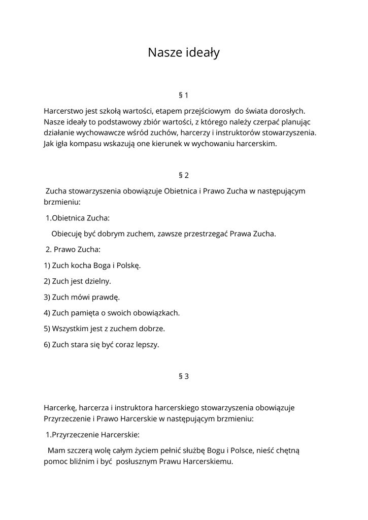 Nasze ideały §1 Harcerstwo jest szkołą wartości, etapem przejściowym do świata dorosłych. Nasze ideały to podstawowy zbiór wartości, z którego należy czerpać planując działanie wychowawcze wśród zuchów, harcerzy i instruktorów stowarzyszenia. Jak igła kompasu wskazują one kierunek w wychowaniu harcerskim. §2 Zucha stowarzyszenia obowiązuje Obietnica i Prawo Zucha w następującym brzmieniu: 1.Obietnica Zucha: Obiecuję być dobrym zuchem, zawsze przestrzegać Prawa Zucha. 2. Prawo Zucha: 1) Zuch kocha Boga i Polskę. 2) Zuch jest dzielny. 3) Zuch mówi prawdę. 4) Zuch pamięta o swoich obowiązkach. 5) Wszystkim jest z zuchem dobrze. 6) Zuch stara się być coraz lepszy. §3 Harcerkę, harcerza i instruktora harcerskiego stowarzyszenia obowiązuje Przyrzeczenie i Prawo Harcerskie w następującym brzmieniu: 1.Przyrzeczenie Harcerskie: Mam szczerą wolę całym życiem pełnić służbę Bogu i Polsce, nieść chętną pomoc bliźnim i być posłusznym Prawu Harcerskiemu. 2. Prawo Harcerskie: 1) Harcerz służy Bogu i Polsce i sumiennie spełnia swoje obowiązki. 2) Na słowie harcerza polegaj jak na Zawiszy. 3) Harcerz jest pożyteczny i niesie pomoc bliźnim. 4) Harcerz w każdym widzi bliźniego, a za brata uważa każdego innego harcerza. 5) Harcerz postępuje po rycersku. 6) Harcerz miłuje przyrodę i stara się ją poznać. 7) Harcerz jest posłusznym rodzicom i wszystkim swoim przełożonym. 8) Harcerz jest zawsze pogodny. 9) Harcerz jest oszczędny i ofiarny. 10) Harcerz jest czysty w mowie myśli i uczynkach, nie pali tytoniu, nie pije napojów alkoholowych. §4 Instruktorkę i instruktora harcerskiego stowarzyszenia obowiązuje Zobowiązanie i Kodeks Instruktorski w następującym brzmieniu: 1.Zobowiązanie Instruktorskie: Przyjmuję obowiązki instruktora harcerskiego Boguszowickiego Stowarzyszenia Społeczno-Kullturalnego „Ślady”. Jestem świadom odpowiedzialności harcerskiego wychowawcy i opiekuna. Dbać będę o dobre imię całego ruchu harcerskiego. Powierzonych mojej opiece wychowanków oraz ich rodziców nie zawiodę. Będę pracował nad sobą, pogłębiał swoją wiedzę i umiejętności, aby móc przekazać je młodszym. Wychowam swego następcę. Powierzonej przez przełożonych służby nie opuszczę samowolnie. 2. Kodeks Instruktora: 1) Bądź dobry łagodnością i uśmiechem. Boga noś w sercu, na mundurze krzyż Chrystusa, nie konkwistadora. 2) Pojmuj właściwie Prawo Harcerskie wraz ze wszystkimi niuansami i pozornymi sprzecznościami. W razie wątpliwości pomagaj sobie Dekalogiem. 3) Bądź otwarty na odmienne poglądy, obyczaje, postawy. Nie tolerancyjny, bo to słowo w ostatnich latach zaczęło oznaczać entuzjastyczną zgodę na wszelkie zło. 4) Bądź prawy. Niestety z kolei to słowo dziś nic nie znaczy. Więc masz być prawy, na dodatek rozumieć o co w tym chodzi. I to intuicyjnie albo z domu. 5) Chciej służyć, i to nie z łapanki ani dla poszukiwania osobistych profitów. W dodatku nie tylko w drużynie, lecz w całym życiu. 6) Bądź pewny swych racji bez doktrynerstwa. Znaj miejsce w szeregu, nieprzerwanie zadziwiaj się odkrywanymi wartościami, bądź wpatrzony w Mistrzów, lecz nie ślepo. 7) Bądź normalnie porządny. To znaczy w skali od łajdaka do świętego w górnej strefie stanów średnich. I tnij po ekstremach, bo z nimi nie sposób wytrzymać. 8) Bądź solidarny z Wychowankami. Czyli z podwładnymi i przełożonymi, bo w harcerstwie wychowanie działa na obie strony. Solidarny z woli, nie przymusu. 9) Z dnia na dzień bądź silniejszy, lepszy, mądrzejszy więc i pokorniejszy wobec ogromu swojej niewiedzy. 10) Bądź młodszy niż dziś. Nie tylko duchem, ale i wiekiem.