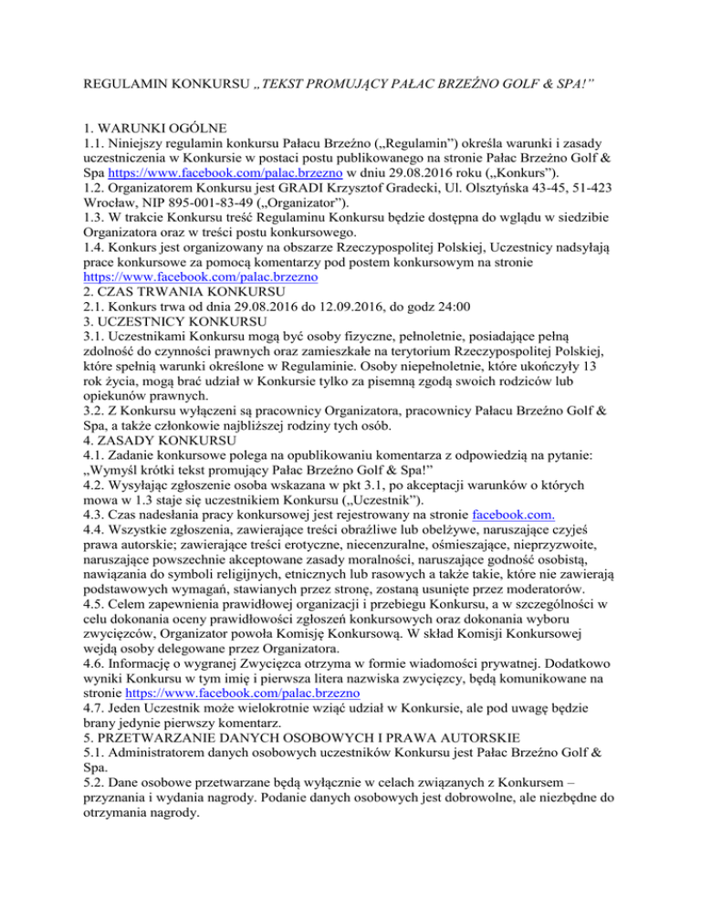 REGULAMIN KONKURSU „TEKST PROMUJĄCY PAŁAC BRZEŹNO GOLF & SPA!” 1. WARUNKI OGÓLNE 1.1. Niniejszy regulamin konkursu Pałacu Brzeźno („Regulamin”) określa warunki i zasady uczestniczenia w Konkursie w postaci postu publikowanego na stronie Pałac Brzeżno Golf & Spa https://www.facebook.com/palac.brzezno w dniu 29.08.2016 roku („Konkurs”). 1.2. Organizatorem Konkursu jest GRADI Krzysztof Gradecki, Ul. Olsztyńska 43-45, 51-423 Wrocław, NIP 895-001-83-49 („Organizator”). 1.3. W trakcie Konkursu treść Regulaminu Konkursu będzie dostępna do wglądu w siedzibie Organizatora oraz w treści postu konkursowego. 1.4. Konkurs jest organizowany na obszarze Rzeczypospolitej Polskiej, Uczestnicy nadsyłają prace konkursowe za pomocą komentarzy pod postem konkursowym na stronie https://www.facebook.com/palac.brzezno 2. CZAS TRWANIA KONKURSU 2.1. Konkurs trwa od dnia 29.08.2016 do 12.09.2016, do godz 24:00 3. UCZESTNICY KONKURSU 3.1. Uczestnikami Konkursu mogą być osoby fizyczne, pełnoletnie, posiadające pełną zdolność do czynności prawnych oraz zamieszkałe na terytorium Rzeczypospolitej Polskiej, które spełnią warunki określone w Regulaminie. Osoby niepełnoletnie, które ukończyły 13 rok życia, mogą brać udział w Konkursie tylko za pisemną zgodą swoich rodziców lub opiekunów prawnych. 3.2. Z Konkursu wyłączeni są pracownicy Organizatora, pracownicy Pałacu Brzeźno Golf & Spa, a także członkowie najbliższej rodziny tych osób. 4. ZASADY KONKURSU 4.1. Zadanie konkursowe polega na opublikowaniu komentarza z odpowiedzią na pytanie: „Wymyśl krótki tekst promujący Pałac Brzeźno Golf & Spa!” 4.2. Wysyłając zgłoszenie osoba wskazana w pkt 3.1, po akceptacji warunków o których mowa w 1.3 staje się uczestnikiem Konkursu („Uczestnik”). 4.3. Czas nadesłania pracy konkursowej jest rejestrowany na stronie facebook.com. 4.4. Wszystkie zgłoszenia, zawierające treści obraźliwe lub obelżywe, naruszające czyjeś prawa autorskie; zawierające treści erotyczne, niecenzuralne, ośmieszające, nieprzyzwoite, naruszające powszechnie akceptowane zasady moralności, naruszające godność osobistą, nawiązania do symboli religijnych, etnicznych lub rasowych a także takie, które nie zawierają podstawowych wymagań, stawianych przez stronę, zostaną usunięte przez moderatorów. 4.5. Celem zapewnienia prawidłowej organizacji i przebiegu Konkursu, a w szczególności w celu dokonania oceny prawidłowości zgłoszeń konkursowych oraz dokonania wyboru zwycięzców, Organizator powoła Komisję Konkursową. W skład Komisji Konkursowej wejdą osoby delegowane przez Organizatora. 4.6. Informację o wygranej Zwycięzca otrzyma w formie wiadomości prywatnej. Dodatkowo wyniki Konkursu w tym imię i pierwsza litera nazwiska zwycięzcy, będą komunikowane na stronie https://www.facebook.com/palac.brzezno 4.7. Jeden Uczestnik może wielokrotnie wziąć udział w Konkursie, ale pod uwagę będzie brany jedynie pierwszy komentarz. 5. PRZETWARZANIE DANYCH OSOBOWYCH I PRAWA AUTORSKIE 5.1. Administratorem danych osobowych uczestników Konkursu jest Pałac Brzeźno Golf & Spa. 5.2. Dane osobowe przetwarzane będą wyłącznie w celach związanych z Konkursem – przyznania i wydania nagrody. Podanie danych osobowych jest dobrowolne, ale niezbędne do otrzymania nagrody. 5.3. Uczestnicy maja prawo wglądu w swoje dane, prawo ich poprawiania oraz żądania usunięcia. 5.4. Akceptując Regulamin Uczestnik Konkursu wyraża zgodę na opublikowanie przysłanego zgłoszenia na stronie https://www.facebook.com/palac.brzezno. Uczestnik zamieszczający zgłoszenie publikuje je na własne ryzyko i we własnym imieniu, i ponosi odpowiedzialność za ewentualne naruszenie praw osób trzecich wynikające z zamieszczenia zgłoszenia na https://www.facebook.com/palac.brzezno, w szczególności praw autorskich. 6. NAGRODY 6.1. Nagrodami w konkursie jest voucher pobytowy w Pałacu Brzeźno Golf & Spa w ilości 1 sztuki. Każdemu Laureatowi przysługuje jedna Nagroda. Nagrody nie podlegają wymianie na inne nagrody lub ekwiwalent pieniężny. 7. WYDAWANIE NAGRÓD 7.1. Nagrody zostaną wysłane za pośrednictwem kuriera na adres podany przez uczestnika w wiadomości prywatnej nadesłanej na stronie https://www.facebook.com/palac.brzezno, w ciągu 14 dni od podania adresu lub w formie elektronicznej na podany przez Uczestnika adres e-mail. 7.2. Laureaci tracą prawo do nagrody i staje się ona własnością Organizatora w następujących sytuacjach: a) w przypadku odmowy przyjęcia lub nieodebrania nagrody przez laureata, b) w przypadku nieotrzymania przez Organizatora adresu wysyłki nagrody w ciągu 14 dni od daty ogłoszenia wyników. 7.3. Każdemu Uczestnikowi przysługuje prawo wniesienia reklamacji związanej z Konkursem – począwszy od daty rozpoczęcia Konkursu do 14 dni od daty zakończenia Konkursu. Decyduje data stempla pocztowego. Reklamacje, które wpłyną do Organizatora po ww. terminie nie będą rozpatrywane. Reklamacje należy zgłaszać wyłącznie w formie pisemnej listem poleconym, na adres Organizatora z dopiskiem „Reklamacja do konkursu na wallu Pałacu Brzeźno Golf & Spa”. Reklamacja powinna zawierać: imię, nazwisko, adres Uczestnika, przyczynę reklamacji wraz z jej uzasadnieniem oraz podpis. 7.4. Reklamacje będą rozpatrywane przez Organizatora w terminie 7 dni roboczych od daty ich otrzymania. O decyzji Organizatora Uczestnik zostanie powiadomiony listem poleconym wysłanym na adres podany w reklamacji niezwłocznie po jej rozpatrzeniu (decyduje data stempla pocztowego). 7.5. Prawo złożenia reklamacji przysługuje jedynie Uczestnikom Konkursu. 7.6. Decyzja Organizatora w przedmiocie reklamacji jest ostateczna. 8. INNE POSTANOWIENIA 8.1. Organizator informuje, że Konkurs nie jest w żadnym zakresie sponsorowany, wspierany, administrowany, ani stowarzyszony z portalem www.facebook.com. Facebook jest znakiem towarowym zastrzeżonym p