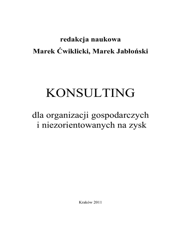 redakcja naukowa Marek Ćwiklicki, Marek Jabłoński KONSULTING dla organizacji gospodarczych i niezorientowanych na zysk Kraków 2011 Redakcja naukowa: Marek Ćwiklicki, Marek Jabłoński Recenzenci: Prof. UEK dr hab. Janusz Czekaj dr Marek Szarucki dr Katarzyna Tarnawska Projekt okładki: Jarosław Szczurek © Copyright by Katedra Metod Organizacji i Zarządzania Uniwersytetu Ekonomicznego w Krakowie, Kraków 2011 ISBN 978-83-62511-01-3 Wydawnictwo: Fundacja Uniwersytetu Ekonomicznego w Krakowie ul. Rakowicka 27 31-510 Kraków Druk: Drukarnia Eikon Plus ul. Wybickiego 46 31-302 Kraków www.eikon.net.pl Spis treści PRZEDMOWA ......................................................................................................... 9 CZĘŚĆ I OBSZARY KONSULTINGU POLSCE Olga-Anna Orynycz ZNACZENIE USŁUG KONSULTINGOWYCH DLA INDYWIDUALNYCH PRODUCENTÓW BIOPALIW CIEKŁYCH...................................................... 12 1. Wstęp .............................................................................................................. 12 2. Tendencje rozwoju rynku biopaliw ciekłych w Polsce na tle UE ................... 13 3. Wspomaganie wiedzy w procesach produkcji biopaliw ................................. 17 4. Wpływ analizy strategicznej rynku biopaliw ciekłych w Polsce na skuteczny konsulting ...................................................................................................... 19 5. Zakończenie .................................................................................................... 22 Literatura ............................................................................................................. 23 Agnieszka Rydz WYBRANE ZAGADNIENIA ZWIĄZANE Z USŁUGAMI KONSULTINGOWO-DORADCZYMI W SEKTORZE AGROBIZNESU W POLSCE .................................................................................................................. 26 1. Wstęp .............................................................................................................. 26 2. Kluczowe pojęcia i istota usług konsultingowo-doradczych w agrobiznesie.. 27 3. Organizacje konsultingowo-doradcze działające w sektorze agrobiznesu w Polsce ............................................................................................................ 30 4. Formy i metody doradztwa w agrobiznesie .................................................... 33 5. Doradztwo a przedsiębiorczość jednostek sektora agrobiznesu ...................... 36 6. Zakończenie .................................................................................................... 38 Literatura ............................................................................................................. 39 Alicja Winnicka-Wejs, Anna Klich ROZWÓJ HR SHARED SERVICE CENTERS W POLSCE ........................... 42 1. Wstęp .............................................................................................................. 42 2. Z centrum kosztów do centrum usług ............................................................. 43 3. HR SSC a BPO – zdefiniowanie pojęć ........................................................... 44 4. Uwarunkowania rozwoju HR SSC w Polsce .................................................. 45 5. Rodzaje usług świadczonych w HR SSC ........................................................ 46 6. Gospodarowanie kapitałem ludzkim w HR SSC ............................................ 47 7. Ryzyko personalne w HR SSC ....................................................................... 48 8. Przykłady z praktyki HR SSC ......................................................................... 49 9. Plusy i minusy rozwiązania typu HR SSC ...................................................... 51 10. Zakończenie .................................................................................................. 51 Literatura ............................................................................................................. 52 Alicja Winnicka-Wejs* Anna Klich** ROZWÓJ HR SHARED SERVICE CENTERS W POLSCE Streszczenie W opracowaniu scharakteryzowano Centra Usług Wspólnych (SSC - Shared Service Centers) realizujące procesy z zakresu HCM (human capital management), zwracając uwagę na ich rozwój w Polsce oraz kształtowanie się nowego modelu biznesowego, który zakłada przekształcanie tradycyjnie działających działów personalnych z centrów kosztów na centra usług. W opracowaniu wymieniono dominujące typy centrów usług (BPO, SSC, R&D), wskazując różnicę pomiędzy centrum usług wspólnych a centrum outsourcingowym. Ponadto w opracowaniu przedstawiono uwarunkowania rozwoju HR SSC w naszym kraju, jak również plusy i minusy takiego rozwiązania. Określono rodzaje usług świadczonych w ramach procesów HCM, przekazywanym centrom usług wspólnych oraz opisano gospodarowanie kapitałem ludzkim uwzględniające ryzyko personalne. Zaprezentowano także wyniki wywiadów pogłębionych z pracownikami HR SSC, a także przykłady z praktyki gospodarczej. 1. Wstęp W okresie spowolnienia gospodarczego i ciągłego redukowania kosztów, wiele organizacji (zwłaszcza międzynarodowych korporacji) decyduje się na scentralizowanie obsługi personalnej w jednym miejscu, tworząc m.in. HR SSC (HR Shared Service Centers). Obserwuje się rozwój tego typu jednostek w Polsce – stąd zainteresowanie tą, jak się wydaje, mało jeszcze rozeznaną problematyką badawczą. Celem opracowania jest scharakteryzowanie Centrów Usług Wspólnych (Shared Service Centers) realizujących procesy HR (human resources) i przedstawienie ich w perspektywie nowego modelu biznesu. Na potrzeby niniejszego opracowania postawiono następujące problemy badawcze: − P 1: Jaka jest różnica pomiędzy HR SSC (centrum usług wspólnych) a BPO/HRO (centrum outsourcingowe)? − P 2: Jakie są uwarunkowania rozwoju HR Shared Service Centers w Polsce oraz jakiego rodzaju plu