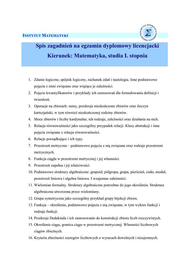 INSTYTUT MATEMATYKI Spis zagadnień na egzamin dyplomowy licencjacki Kierunek: Matematyka, studia I. stopnia 1. Zdanie logiczne, spójnik logiczny, rachunek zdań i tautologia. Inne podstawowe pojęcia z nimi związane oraz wiążące je zależności. 2. Pojęcie kwantyfikatorów i przykłady ich zastosowań dla formułowania definicji i twierdzeń. 3. Operacje na zbiorach: sumy, przekroje nieskończone zbiorów oraz iloczyn kartezjański, w tym również nieskończonej rodziny zbiorów. 4. Moce zbiorów i liczby kardynalne; ich rodzaje, zależności oraz działania na nich. 5. Relacja równoważności jako szczególny przypadek relacji. Klasy abstrakcji i inne pojęcia związane z relacja równoważności. 6. Relacje porządkujące i ich typy. 7. Przestrzeń metryczna – podstawowe pojęcia z nią związane oraz rodzaje przestrzeni metrycznych. 8. Funkcja ciągła w przestrzeni metrycznej i jej własności. 9. Przestrzeń zupełna i jej właściwości. 10. Podstawowe struktury algebraiczne: grupoid, półgrupa, grupa, pierścień, ciało, moduł, przestrzeń liniowa i algebra liniowa. I wzajemne zależności. 11. Wielomian formalny. Struktury algebraiczne potrzebne do jego określenia. Struktura algebraiczna utworzona przez wielomiany. 12. Grupa symetryczna jako szczególny przykład grupy bijekcji zbioru. 13. Funkcja – określenie, podstawowe pojęcia z nią związane, w tym wykres funkcji i rodzaje funkcji. 14. Przekroje Dedekinda i ich zastosowanie do konstrukcji zbioru liczb rzeczywistych. 15. Określenie ciągu, granica ciągu w przestrzeni metrycznej. Własności liczbowych ciągów zbieżnych. 16. Kryteria zbieżności szeregów liczbowych o wyrazach dowolnych i nieujemnych. 17. Definicja Cauchy’ego i Heinego granicy funkcji. Podstawowe twierdzenia o granicach funkcji. 18. Zastosowanie twierdzenia Bolzano-Weierstrassa w dowodach własności funkcji ciągłych. 19. Twierdzenia o wartości średniej dla rachunku różniczkowego i przykłady ich zastosowań. 20. Reguła de l’Hospitala i jej zastosowania do obliczania granic wyrażeń nieoznaczonych. 21. Rozwijanie funkcji w szeregi potęgowe. Metody obliczania promienia zbieżności szeregu potęgowego. 22. Zastosowanie geometryczne całek oznaczonych. 23. Twierdzenia o wartości średniej dla rachunku całkowego. 24. Ekstremum funkcji dwóch zmiennych . Warunek konieczny i wystarczający istnienia ekstremum funkcji dwóch zmiennych. 25. Znajdowanie ekstremów funkcji uwikłanej. 26. Zastosowanie geometryczne całek podwójnych i potrójnych. 27. Określenie, własności i zastosowania całek krzywoliniowych skierowanych i nieskierowanych. 28. Określenie całki niewłaściwej. Bezwzględna i warunkowa zbieżność całek niewłaściwych. Kryterium całkowe zbieżności szeregów. 29. Własności ciągów w przestrzeniach metrycznych. 30. Aksjomaty oddzielania i związki między nimi w przestrzeniach topologicznych. 31. Wyróżnione zbiory w przestrzeniach metrycznych: zbiory otwarte, domknięte, brzegowe, gęste – ich określenia i wzajemne związki. 32. Twierdzenie Banacha o punkcie stałym i jego zastosowania. 33. Twierdzenie Baire’a i jego zastosowania. 34. Przestrzeń liniowa nad dowolnym ciałem (w szczególności nad R): wektory liniowo zależne i wektory liniowo niezależne, wymiar i baza przestrzeni liniowej. 35. Rząd macierzy (definicja, warunki równoważne) i twierdzenie Kroneckera-Capellego. 36. Iloczyn skalarny, wektorowy i iloczyn mieszany wektorów w przestrzeni Rn – definicje, własności, sposoby obliczania i zastosowania. 37. Równania płaszczyzny i prostej w przestrzeni. 38. Postać algebraiczna, trygonometryczna i wykładnicza liczby zespolonej oraz ich związki z działaniami w liczbach zespolonych. 39. Określoność formy kwadratowej i kryterium Sylvestera. 40. Krzywe stożkowe – definicje, równania oraz ich przedstawienia graficzne. 41. Powierzchnie 2 stopnia – definicje, równania oraz ich przedstawienia graficzne. 42. Przekształcenie liniowe. Macierz przekształcenia. Wartości i wektory własne macierzy, diagonalizacja macierzy. 43. Wielomiany – określenie, podstawowe pojęcia. Zagadnienie interpolacji wielomianowej. 44. Zastosowanie funkcji tworzących ciągu do rozwiązywania równań rekurencyjnych. 45. Definicja drzewa. Twierdzenie o liczbie drzew oznaczonych na n wierzchołkach. 46. Cykl Eulera i Hamiltona w grafie. Warunki ich istnienia. 47. Metody rozwiązywania równań różniczkowych I rzędu. 48. Metody rozwiązywania równań różniczkowych II rzędu. 49. Metody rozwiązywania równań różniczkowych wyższych rzędów i układów równań o stałych współczynnikach. 50. Klasyczna, geometryczna i aksjomatyczna definicja prawdopodobieństwa. 51. Podstawowe pojęcia związane z przestrzenią probabilistyczną. 52. Zjawisko Rungego w interpolacji wielomianowej. 53. Określenie całki oznaczonej. Metoda całkowania numerycznego. 54. Wybrane metody przybliżonego rozwiązywania równań nieliniowych z jedną niewiadomą. 55. Wzór Taylora i jego właściwości. Zagadnienie różniczkowania numerycznego przy zastosowaniu wzoru Taylora. 56. Równanie różniczkowe zwyczajne I rzędu, warunek początkowy. Wybrane numeryczne metody rozwiązywania zagadnień początkowych dla równań różniczkowych zwyczajnych I rzędu. 57. Definicja wyznacznika i jego właściwości. Metody rozwiązywania układów algebraicznych równań liniowych, obliczania wyznacznika i odwracania macierzy stosując wybrany rozkład LU. 58. Sposoby reprezentacji liczb w pamięci komputera. 59. Definicja grafu. Algorytmy wędrówki po grafie. 60. Sposób zapamiętywania informacji o grafie w pamięci komputera. 61. Podać definicję zmiennej losowej i jej charakterystyki. 62. Schemat Bernoulliego i rozkłady z nim związane. 63. Definicja, własności i zastosowanie rozkładu normalnego. 64. Rozkłady prawdopodobieństwa i ich własności. 65. Procedura weryfikacji hipotezy statystycznej.