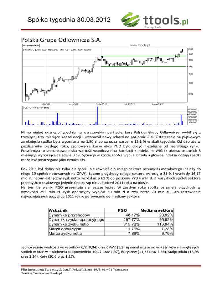 Spółka tygodnia 30.03.2012 Polska Grupa Odlewnicza S.A. Mimo niebyt udanego tygodnia na warszawskim parkiecie, kurs Polskiej Grupy Odlewniczej wybił się z trwającej trzy miesiące konsolidacji i ustanowił nowy rekord na poziomie 2 zł. Ostatecznie na piątkowym zamknięciu spółka była wyceniana na 1,90 zł co oznacza wzrost o 13,1 % w skali tygodnia. Od debiutu w październiku zeszłego roku, zachowanie kursu akcji PGO było dosyć niezależne od szerokiego rynku. Potwierdza to stosunkowo niska wartość współczynnika korelacji z indeksem WIG (z okresu ostatnich 3 miesięcy) wynosząca zaledwie 0,13. Sytuacja w której spółka wybija szczyty a główne indeksy notują spadki może być postrzegana jako oznaka siły. Rok 2011 był dobry nie tylko dla spółki, ale również dla całego sektora przemysłu metalowego (należy do niego 19 spółek notowanych na GPW). Łączne przychody całego sektora wzrosły o 23 % i wyniosły 16,17 mld zł, natomiast łączny zysk netto wzrósł aż o 61 % do poziomu 778,4 mln zł. Z wszystkich spółek sektora przemysłu metalowego jedynie Centrozap nie zakończył 2011 roku na plusie. Na tym tle wyniki PGO prezentują się jeszcze lepiej. W zeszłym roku spółka osiągnęła przychody w wysokości 255 mln zł, zysk operacyjny wyniósł 30 mln zł a zysk netto 20 mln zł. Oto zestawienie najważniejszych pozycji za 2011 rok w porównaniu do mediany sektora: Wskaźnik Dynamika przychodów Dynamika zysku operacyjnego Dynamika zysku netto Marża operacyjna Marża zysku netto PGO Mediana sektora 48,17% 23,92% 297,77% 96,82% 315,72% 116,94% 11,76% 7,28% 7,86% 6,79% Jednocześnie wielkości wskaźników C/Z (8,84) oraz C/WK (1,2) są nadal niższe od wskaźników największych spółek w branży – Alchemia (odpowiednio 10,47 oraz 1,97), Boryszew (11,22 oraz 2,36), Stalprodukt (13,95 oraz 1,14), Kęty (10,6 oraz 1,17). PBA Investment Sp. z o.o., ul. Gen.T. Pełczyńskiego 19/3, 01-471 Warszawa Trading Tools www.ttools.pl Spółka tygodnia 30.03.2012 PBA Investment Sp. z o.o. Ul. Gen. T. Pełczyńskiego 19/3 01-471 Warszawa Departament analiz: Arkadiusz Rolnik [email protected] +48 533 042 500 Piotr Pajka [email protected] +48 533 047 500 Marek Pasierbski [email protected] +48 533 041 500 Informacje, komentarze i opinie zawarte w niniejszym materiale odzwierciedlają wiedzę i poglądy autora i są konsekwencją subiektywnej interpretacji informacji i danych użytych do sporządzenia niniejszego materiału. Opracowanie zostało sporządzone z zachowaniem staranności i rzetelności, na podstawie informacji i źródeł uznanych przez jego autora za wiarygodne. Jednakże ani autor, ani PBA Investment Sp. z o.o. nie gwarantują ich kompletności i wiarygodności. Materiał ten jest udostępniany wyłącznie w celach informacyjnych i nie jest rekomendacją w rozumieniu rozporządzenia Ministra Finansów z dnia 19 października 2005 r. w sprawie informacji stanowiących rekomendacje dotyczące instrumentów finansowych, ich emitentów lub wystawców i nie stanowią porady inwestycyjnej, rekomendacji lub oferty zakupu lub sprzedaży instrumentów finansowych. Informacje, komentarze i opinie zawarte w niniejszym materiale nie są również analizą inwestycyjną lub analizą finansową, których mowa w ustawie z dnia 29 lipca 2005 r. o obrocie instrumentami finansowymi. Autor niniejszego opracowania ani PBA Investment Sp. z o.o. nie ponoszą odpowiedzialności za decyzje inwestycyjne podjęte na podstawie informacji, komentarzy i opinii wyrażonych w niniejszym opracowaniu oraz za ich skutki. Powielanie bądź publikowanie w jakiejkolwiek formie niniejszego opracowania, lub jego części, oraz zwartych w nim zaleceń, oraz wykorzystywanie materiału do własnych opracowań celem publikacji, bez pisemnej zgody PBA Investment Sp. z o.o. jest zabronione. Niniejsze opracowanie stanowi publikację handlową i jest prawnie chronione zgodnie z Ustawą z 4 lutego 1994 r. o prawie autorskim i prawach pokrewnych (Dz. U. 1994 nr 24 poz. 83 z późn. zm.). PBA Investment Sp. z o.o., ul. Gen.T. Pełczyńskiego 19/3, 01-471 Warszawa Trading Tools www.ttools.pl