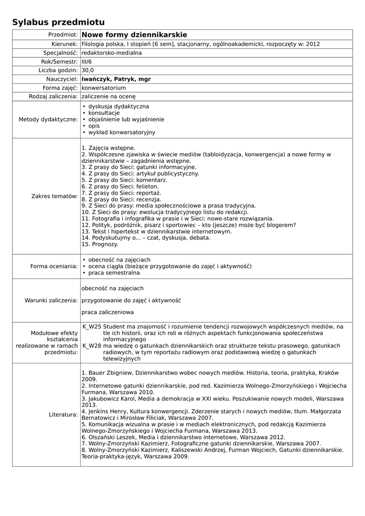 Sylabus przedmiotu Przedmiot: Nowe formy dziennikarskie Kierunek: Filologia polska, I stopień [6 sem], stacjonarny, ogólnoakademicki, rozpoczęty w: 2012 Specjalność: redaktorsko-medialna Rok/Semestr: III/6 Liczba godzin: 30,0 Nauczyciel: Iwańczyk, Patryk, mgr Forma zajęć: konwersatorium Rodzaj zaliczenia: zaliczenie na ocenę • • Metody dydaktyczne: • • • dyskusja dydaktyczna konsultacje objaśnienie lub wyjaśnienie opis wykład konwersatoryjny 1. Zajęcia wstępne. 2. Współczesne zjawiska w świecie mediów (tabloidyzacja, konwergencja) a nowe formy w dziennikarstwie – zagadnienia wstępne. 3. Z prasy do Sieci: gatunki informacyjne. 4. Z prasy do Sieci: artykuł publicystyczny. 5. Z prasy do Sieci: komentarz. 6. Z prasy do Sieci: felieton. 7. Z prasy do Sieci: reportaż. Zakres tematów: 8. Z prasy do Sieci: recenzja. 9. Z Sieci do prasy: media społecznościowe a prasa tradycyjna. 10. Z Sieci do prasy: ewolucja tradycyjnego listu do redakcji. 11. Fotografia i infografika w prasie i w Sieci: nowe-stare rozwiązania. 12. Polityk, podróżnik, pisarz i sportowiec – kto (jeszcze) może być blogerem? 13. Tekst i hipertekst w dziennikarstwie internetowym. 14. Podyskutujmy o... – czat, dyskusja, debata. 15. Prognozy. • obecność na zajęciach Forma oceniania: • ocena ciągła (bieżące przygotowanie do zajęć i aktywność) • praca semestralna obecność na zajęciach Warunki zaliczenia: przygotowanie do zajęć i aktywność praca zaliczeniowa K_W25 Student ma znajomość i rozumienie tendencji rozwojowych współczesnych mediów, na tle ich historii, oraz ich roli w różnych aspektach funkcjonowania społeczeństwa Modułowe efekty informacyjnego kształcenia realizowane w ramach K_W28 ma wiedzę o gatunkach dziennikarskich oraz strukturze tekstu prasowego, gatunkach radiowych, w tym reportażu radiowym oraz podstawową wiedzę o gatunkach przedmiotu: telewizyjnych 1. Bauer Zbigniew, Dziennikarstwo wobec nowych mediów. Historia, teoria, praktyka, Kraków 2009. 2. Internetowe gatunki dziennikarskie, pod red. Kazimierza Wolnego-Zmorzyńskiego i Wojciecha Furmana, Warszawa 2010. 3. Jakubowicz Karol, Media a demokracja w XXI wieku. Poszukiwanie nowych modeli, Warszawa 2013. 4. Jenkins Henry, Kultura konwergencji. Zderzenie starych i nowych mediów, tłum. Małgorzata Literatura: Bernatowicz i Mirosław Filiciak, Warszawa 2007. 5. Komunikacja wizualna w prasie i w mediach elektronicznych, pod redakcją Kazimierza Wolnego-Zmorzyńskiego i Wojciecha Furmana, Warszawa 2013. 6. Olszański Leszek, Media i dziennikarstwo internetowe, Warszawa 2012. 7. Wolny-Zmorzyński Kazimierz, Fotograficzne gatunki dziennikarskie, Warszawa 2007. 8. Wolny-Zmorzyński Kazimierz, Kaliszewski Andrzej, Furman Wojciech, Gatunki dziennikarskie. Teoria-praktyka-język, Warszawa 2009.