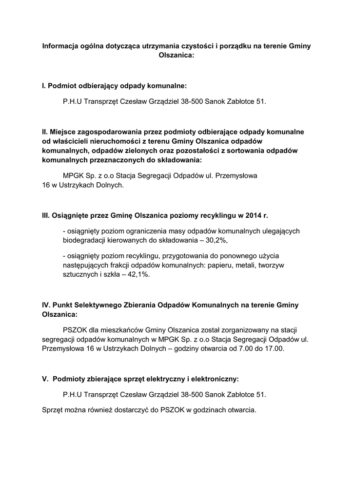Informacja ogólna dotycząca utrzymania czystości i porządku na terenie Gminy Olszanica: I. Podmiot odbierający odpady komunalne: P.H.U Transprzęt Czesław Grządziel 38-500 Sanok Zabłotce 51. II. Miejsce zagospodarowania przez podmioty odbierające odpady komunalne od właścicieli nieruchomości z terenu Gminy Olszanica odpadów komunalnych, odpadów zielonych oraz pozostałości z sortowania odpadów komunalnych przeznaczonych do składowania: MPGK Sp. z o.o Stacja Segregacji Odpadów ul. Przemysłowa 16 w Ustrzykach Dolnych. III. Osiągnięte przez Gminę Olszanica poziomy recyklingu w 2014 r. - osiągnięty poziom ograniczenia masy odpadów komunalnych ulegających biodegradacji kierowanych do składowania – 30,2%, - osiągnięty poziom recyklingu, przygotowania do ponownego użycia następujących frakcji odpadów komunalnych: papieru, metali, tworzyw sztucznych i szkła – 42,1%. IV. Punkt Selektywnego Zbierania Odpadów Komunalnych na terenie Gminy Olszanica: PSZOK dla mieszkańców Gminy Olszanica został zorganizowany na stacji segregacji odpadów komunalnych w MPGK Sp. z o.o Stacja Segregacji Odpadów ul. Przemysłowa 16 w Ustrzykach Dolnych – godziny otwarcia od 7.00 do 17.00. V. Podmioty zbierające sprzęt elektryczny i elektroniczny: P.H.U Transprzęt Czesław Grządziel 38-500 Sanok Zabłotce 51. Sprzęt można również dostarczyć do PSZOK w godzinach otwarcia.