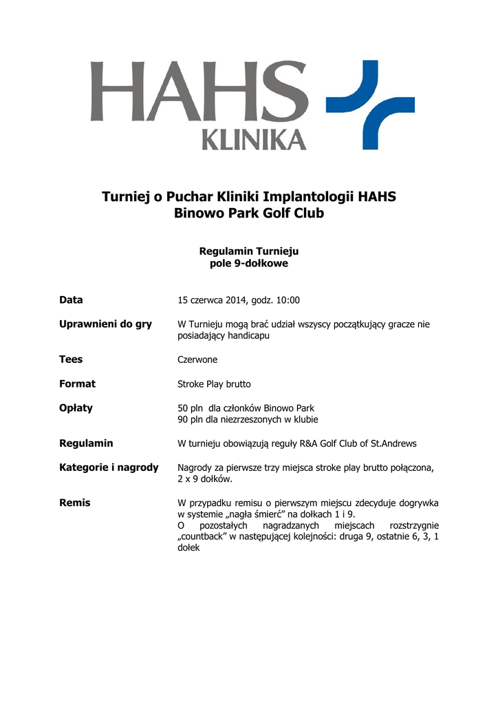 Turniej o Puchar Kliniki Implantologii HAHS Binowo Park Golf Club Regulamin Turnieju pole 9-dołkowe Data 15 czerwca 2014, godz. 10:00 Uprawnieni do gry W Turnieju mogą brać udział wszyscy początkujący gracze nie posiadający handicapu Tees Czerwone Format Stroke Play brutto Opłaty 50 pln dla członków Binowo Park 90 pln dla niezrzeszonych w klubie Regulamin W turnieju obowiązują reguły R&A Golf Club of St.Andrews Kategorie i nagrody Nagrody za pierwsze trzy miejsca stroke play brutto połączona, 2 x 9 dołków. Remis W przypadku remisu o pierwszym miejscu zdecyduje dogrywka w systemie „nagła śmierć” na dołkach 1 i 9. O pozostałych nagradzanych miejscach rozstrzygnie „countback” w następującej kolejności: druga 9, ostatnie 6, 3, 1 dołek Wykorzystywanie wizerunku przez organizatora i sponsorów turnieju. Każdy uczestnik turnieju ma obowiązek akceptacji zapisów poniższego oświadczenia: Wyrażam zgodę na nieograniczone czasowo i terytorialnie wykorzystanie mojego wizerunku, utrwalonego na fotografiach oraz w treści materiałów audiowizualnych wykonanych podczas Turnieju o Puchar Kliniki Implantologii HAHS (konkursu/eventu/etc). Za wyjątkiem sytuacji opisanych poniżej nieodpłatne zezwolenie (upoważnienie), o którym mowa powyżej odnosi się do wielokrotnego (nieograniczonego ilościowo, czasowo i terytorialnie) korzystania z mojego wizerunku w celach wydawniczych, handlowych, reklamowych, marketingowych, na opakowaniach produktów, w dowolny sposób i w dowolnych mediach (w tym w jedno- i wielokrotnych publikacjach, ilustracjach, prasie, książkach, ulotkach, reklamach, innych materiałach drukowanych, w telewizji, Internecie i innych), zestawiania wizerunku z innymi wizerunkami oraz z komentarzem, modyfikowania wizerunku oraz łączenia wizerunku z fotografiami, materiałami audiowizualnymi, tekstem lub grafiką. Zezwolenie obejmuje swym zakresem ponadto prawo do wykorzystania utworów zawierających mój wizerunek w nieograniczonym zakresie, a w szczególności, w zakresie: a) utrwalania i/lub zwielokrotniania jakąkolwiek techniką, w tym m.in. drukiem, na kliszy fotograficznej, na taśmie magnetycznej, na dyskietce oraz innych nośnikach, cyfrowo, b) wprowadzania do obrotu, c) wprowadzania do pamięci komputera oraz do sieci komputerowej i/lub multimedialnej, d) publicznego udostępniania w taki sposób, aby każdy mógł mieć dostęp do utworów w miejscu i w czasie przez siebie wybranym (m.in. udostępniania w Internecie), e) publicznego wykonania i/lub publicznego odtwarzania, f) wystawiania, g) wyświetlania, h) użyczania i/lub najmu, i) nadawania za pomocą wizji i/lub fonii przewodowej oraz bezprzewodowej przez stację naziemną oraz nadawania za pośrednictwem satelity, j) równoczesnego i integralnego nadawania (reemitowania), k) rozpowszechniania w sieciach telefonii komórkowej, w tym poprzez streaming w telefonach komórkowych, l) modyfikowania, w szczególności poprzez zmianę kolorów, rozmiaru, wycinanie fragmentów, zniekształcanie dodawanie tekstu, obrazu, dźwięku. Mój wizerunek wraz z imieniem i nazwiskiem nie mogą zostać wykorzystane w sposób ośmieszający, niegodny, skandalizujący, kompromitujący lub zniesławiający, a także w celu propagowania przemocy, nienawiści, dyskryminacji, pornografii lub narkotyków. Oświadczam , że zrzekam się prawa do weryfikacji i/lub akceptacji materiałów zawierających mój wizerunek. Przyjmuję do wiadomości, iż prawa autorskie do utworów zawierających mój wizerunek posiada Binowo Park. Oświadczam jednocześnie, iż zrzekam się wszelkich potencjalnych roszczeń przysługujących mi lub mogących mi przysługiwać z tego tytułu.