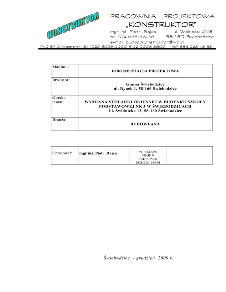 PRACOWNIA PROJEKTOWA „KONSTRUKTOR” mgr inŜ. Piotr Rajca ul. Wolności 41/8 tel. 074 665-96-96 58-160 Świebodzice e-mail: [email protected] PKO BP O/Wałbrzych 84 1020 5095 0000 5102 0008 8609 NIP 886-228-48-38 Stadium: DOKUMENTACJA PROJEKTOWA Inwestor: Gmina Świebodzice ul. Rynek 1, 58-160 Świebodzice Obiekttemat: WYMIANA STOLARKI OKIENNEJ W BUDYNKU SZKOŁY PODSTAWOWEJ NR 3 W ŚWIEBODZICACH Ul. Świdnicka 13, 58-160 Świebodzice Branża: BUDOWLANA Opracował: mgr inż. Piotr Rajca 691/01/DUW NBGP.V 7342/3/75/98 DOŚ/BO/1648/01 Świebodzice - grudzień 2009 r. ZAWARTOŚĆ OPRACOWANIA 1. 2. 3. 4. Wytyczne – wymiana stolarki okiennej, Zestawienie stolarki okiennej, Kosztorys przedmiarowy Specyfikacje techniczna wykonania i odbioru robót budowlanych – wymagania ogólne – ST 00.00, 5. Specyfikacje techniczna wykonania i odbioru robót budowlanych – wymiana stolarki okiennej – ST 01.01, WYTYCZNE – WYMIANA STOLARKI OKIENNEJ w budynku Szkoły Podstawowej nr 3 w Świebodzicach ZAKRES PRAC DO WYKONANIA: − Wymiana stolarki okiennej drewniane skrzynkowej na stolarkę PCV (przed wymianą naleŜy bezwzględnie sprawdzić wymiary okien z natury), − Obróbka ościeŜy okiennych wewnętrznych (szer. ościeŜa po wymianie 40cm), − Malowanie ościeŜy okiennych wewnętrznych w kolorze białym, − Uzupełnienie parapetów wewnętrznych zaprawą cementową (do grubości istniejących parapetów okiennych), − Wykonanie nowych parapetów wewnętrznych PCV poprzez nałoŜenie na istniejące parapety, − Wykonanie nowych parapetów zewnętrznych z blachy powlekanej w kolorze białym, WYTYCZNE DOTYCZĄCE STOLARKI OKIENNEJ: − Profil okienny min. 5-komorowy − Szyba zespolona U max = 1,1 W/m2K − W sali gimnastycznej szyba zespolona P4 U max = 1,1 W/m2K − Maksymalny współczynnik przenikania ciepła U = 1,3 W/m2K − Kolor nowej stolarki okiennej – biały, − Podział okien do uzgodnienia z uŜytkownikiem – ilość okien lewych i prawych − Szprosy okien – wewnątrz szyby zespolonej 18mm – kolor biały, − Okucia w kolorze białym. − W sali gimnastycznej otwieranie okien z poziomu podłogi WYTYCZNE DOTYCZĄCE PARAPETÓW WEWNĘTRZNYCH: − Parapety komorowy PCV, − Kolor parapetu – biały, gładki, − Parapet wewnętrzny powinien wystawać min. 4cm poza istniejące parapety. − Parapet zewnętrzny powinien wystawać min. 5cm poza istniejące parapety.