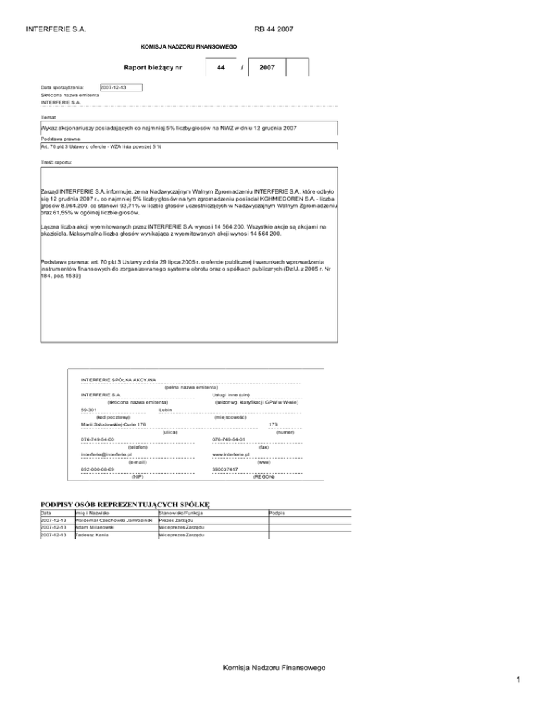 INTERFERIE S.A. RB 44 2007 KOMISJA NADZORU FINANSOWEGO Raport bieŜący nr 44 / 2007 2007-12-13 Data sporządzenia: Skróc ona nazwa emitenta INT ERFERIE S.A. Temat Wykaz akcjonariuszy posiadających co najmniej 5% liczby głosów na NWZ w dniu 12 grudnia 2007 Podstawa prawna Art. 70 pkt 3 Ustawy o oferc ie - WZA lista powyŜej 5 % Treść raportu: Zarząd INTERFERIE S.A. informuje, Ŝe na Nadzwyczajnym Walnym Zgromadzeniu INTERFERIE S.A., które odbyło się 12 grudnia 2007 r., co najmniej 5% liczby głosów na tym zgromadzeniu posiadał KGHM ECOREN S.A. - liczba głosów 8.964.200, co stanowi 93,71% w liczbie głosów uczestniczących w Nadzwyczajnym Walnym Zgromadzeniu oraz 61,55% w ogólnej liczbie głosów. Łączna liczba akcji wyemitowanych przez INTERFERIE S.A. wynosi 14 564 200. Wszystkie akcje są akcjami na okaziciela. Maksymalna liczba głosów wynikająca z wyemitowanych akcji wynosi 14 564 200. Podstawa prawna: art. 70 pkt 3 Ustawy z dnia 29 lipca 2005 r. o ofercie publicznej i warunkach wprowadzania instrumentów finansowych do zorganizowanego systemu obrotu oraz o spółkach publicznych (Dz.U. z 2005 r. Nr 184, poz. 1539) INT ERFERIE SPÓŁKA AKCYJNA (pełna nazwa emitenta) INT ERFERIE S.A. Usługi inne (uin) (skróc ona nazwa emitenta) 59-301 (sektor wg. klasyfikac ji GPW w W-wie) Lubin (kod poc ztowy) (miejsc owość ) Marii Skłodowskiej-Curie 176 176 (ulic a) 076-749-54-00 (numer) 076-749-54-01 (telefon) (fax) [email protected] www.interferie.pl (e-mail) (www) 692-000-08-69 390037417 (NIP) (REGON) PODPISY OSÓB REPREZENTUJĄCYCH SPÓŁKĘ Data Imię i Nazwisko Stanowisko/Funkc ja 2007-12-13 Waldemar Czec howski Jamroziński Prezes Zarządu 2007-12-13 Adam Milanowski Wic eprezes Zarządu 2007-12-13 Tadeusz Kania Wic eprezes Zarządu Podpis Komisja Nadzoru Finansowego 1