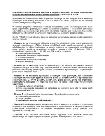 Powiatowe Centrum Pomocy Rodzinie w GiŜycku informuje, Ŝe został uruchomiony Program Wyrównywania RóŜnic Między Regionami – realizacja w 2012r. Warmińsko-Mazurski Oddział PFRON ponadto informuje, Ŝe ww. program został zmieniony uchwałą nr 2/2012 Rady Nadzorczej z dnia 28 marca 2012 roku (załącznik do nn. uchwały zawiera tekst jednolity programu). W ramach programu Państwowy Fundusz Rehabilitacji Osób Niepełnosprawnych moŜe (poza algorytmem) przekazywać środki realizatorom programu – jednostkom samorządu wojewódzkiego i powiatowego, przy czym największe wsparcie jest kierowane do powiatów leŜących w podregionach o najniŜszym stopniu rozwoju społeczno-gospodarczego. Środki PFRON wykorzystywane będą na działania wyrównujące róŜnice między regionami, w tym w ramach: - Obszaru A na wyposaŜenie obiektów słuŜących rehabilitacji osób niepełnosprawnych w sprzęt rehabilitacyjny. „Obiekt słuŜący rehabilitacji osób niepełnosprawnych w sprzęt rehabilitacyjny” to obiekt budowlany, w którym udzielane są świadczenia rehabilitacyjne przez podmiot leczniczy prowadzony zgodnie z ustawą z dnia 15 kwietnia 2011 r. o działalności leczniczej (Dz. U. Nr 112, poz.654, z późn. zm.) przez: a) organizację pozarządową , b) jednostkę samorządu terytorialnego, c) uczelnię medyczną, d) jednostkę administracji rządowej, e) instytut badawczy. - Obszaru B na likwidację barier architektonicznych w zakresie umoŜliwienia osobom niepełnosprawnym poruszania się i komunikowania w zakładzie opieki zdrowotnej bądź placówce edukacyjnej, realizujących zadania w obiektach wybudowanych i uŜytkowanych przed dniem 1 stycznia 1995 r. - Obszaru C na tworzenie spółdzielni socjalnych osób prawnych, tzn. spółdzielni socjalnych utworzonych zgodnie z ustawą z dnia 27 kwietnia 2006 r. o spółdzielniach socjalnych (Dz. U. Nr 94, poz.651, z późn. zm.) przez powiat, gminę lub organizację pozarządową działającą co najmniej dwa lata na rzecz osób niepełnosprawnych wspólnie z: a) innym powiatem lub gminą, b) inną organizacją pozarządową działającą co najmniej dwa lata na rzecz osób niepełnosprawnych. - Obszaru D na likwidację barier transportowych. Beneficjentami programu są: a) organizacje pozarządowe, b) gminy i powiaty, c) spółdzielnie socjalne osób prawnych. - Obszaru E na dofinansowanie wymaganego wkładu własnego w projektach dotyczących aktywizacji i/lub integracji osób niepełnosprawnych, realizowanych w ramach Programów Operacyjnych finansowanych ze środków europejskich przez gminy, powiaty oraz organizacje pozarządowe. - Obszaru F na tworzenie warsztatów terapii zajęciowej przez jednostki samorządu terytorialnego lub organizacje pozarządowe, gdzie na terenie powiatu brak jest wtz. - Obszaru G skierowanego do powiatów, które mogą wystąpić poza algorytmem o dodatkowe środki na finansowanie zadań ustawowych dotyczących rehabilitacji zawodowej osób niepełnosprawnych. Zarząd PFRON uchwałą nr 89/2012 z dnia 19 czerwca 2012 r. przyjął do realizacji „Kierunki działań oraz warunki brzegowe obowiązujące realizatorów programu w 2012 roku”. W roku bieŜącym decyzją Zarządu Funduszu realizowany będzie obszar A, B, C, D, E i G programu. Realizatorami programu są jednostki samorządu terytorialnego: 1) samorządy wojewódzkie – w obszarze A, 2) samorządy powiatowe - w obszarach B, C, D, E, i G. Wysokość dofinansowania ze środków PFRON przeznaczonych na realizację kaŜdego projektu na terenie powiatów woj. warmińsko – mazurskiego (Załącznik nr 2 do uchwały nr 89/2012 Zarządu PFRON z dnia 19 czerwca 2012 r.) w ramach programu: - w obszarze A, B, C, D nie moŜe przekroczyć 60% kosztów realizacji projektu, w obszarze E - wartość wymaganego wkładu własnego lecz nie więcej niŜ 25% całkowitych kosztów realizacji projektu wskazanych w umowie zawartej w ramach Programu Operacyjnego. - W obszarze G – 50% wartości środków algorytmu planowanych w danym roku przez powiat na realizację zadań z zakresu rehabilitacji zawodowej. Wskaźniki kosztów realizacji projektu, wyznaczające maksymalną wysokość dofinansowania ze środków PFRON w obszarze A, B, C, D i E znajdują się w Załączniku nr 1 do uchwały nr 89/2012 Zarządu PFRON z dnia 19 czerwca 2012 r. Zgodnie z uchwałą nr 90/2012 Zarządu PFRON z 19 czerwca 2012 r., wystąpienia jednostek samorządu terytorialnego wraz z opisami projektów, oraz wnioski o dofinansowanie projektów własnych samorządu składane są w Oddziale PFRON w terminie do dnia 31 lipca 2012 r. Tekst aktualnej wersji programu, zgodnie z uchwałą nr 2/2012 Rady Nadzorczej PFRON z dnia 28 marca 2012 r., procedur realizacji programu oraz kierunki działań i warunki brzegowe obowiązujące realizatorów programu w 2012 r., przyjętych uchwałą nr 88/2012, 89/2012 oraz 90/2012 Zarządu PFRON z dnia 19 czerwca 2012 roku, umieszczone są na stronie internetowej PFRON – www.pfron.org.pl Realizatorem programu w powiecie giŜyckim jest Powiatowe Centrum Pomocy Rodzinie w GiŜycku z siedzibą przy ul. Smętka 5, tel. 87 4291089 lub 874291820. Informacje i wnioski o dofinansowania w ramach w/w programu moŜna pobrać w pok. 5 i 6 lub ze strony www.pcpr-gizycko.lo.pl Wnioski naleŜy składać w siedzibie PCPR w GiŜycku w pok. 5 i 6 do dnia 25.07.2012r. W przypadku zmiany terminów określonych przez PFRON zostaniecie poinformowani – komunikaty na stronie internetowej www.pcpr-gizycko.lo.pl Państwo