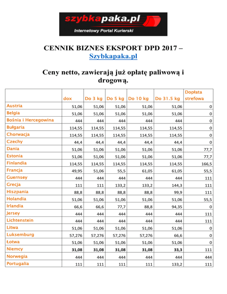 CENNIK BIZNES EKSPORT DPD 2017 – Szybkapaka.pl Ceny netto, zawierają już opłatę paliwową i drogową. Dopłata dox Do 3 kg Do 5 kg Do 10 kg Do 31.5 kg strefowa Austria 51,06 51,06 51,06 51,06 51,06 0 Belgia 51,06 51,06 51,06 51,06 51,06 0 444 444 444 444 444 0 Bułgaria 114,55 114,55 114,55 114,55 114,55 0 Chorwacja 114,55 114,55 114,55 114,55 114,55 0 44,4 44,4 44,4 44,4 44,4 0 Dania 51,06 51,06 51,06 51,06 51,06 77,7 Estonia 51,06 51,06 51,06 51,06 51,06 77,7 114,55 114,55 114,55 114,55 114,55 166,5 49,95 51,06 55,5 61,05 61,05 55,5 Guernsey 444 444 444 444 444 111 Grecja 111 111 133,2 133,2 144,3 111 Hiszpania 88,8 88,8 88,8 88,8 99,9 111 Holandia 51,06 51,06 51,06 51,06 51,06 55,5 Irlandia 66,6 66,6 77,7 88,8 94,35 0 Jersey 444 444 444 444 444 111 Lichtenstein 444 444 444 444 444 111 51,06 51,06 51,06 51,06 51,06 0 57,276 57,276 57,276 57,276 66,6 0 Łotwa 51,06 51,06 51,06 51,06 51,06 0 Niemcy 31,08 31,08 31,08 31,08 33,3 111 Norwegia 444 444 444 444 444 444 Portugalia 111 111 111 111 133,2 111 Bośnia i Hercegowina Czechy Finlandia Francja Litwa Luksemburg Rumunia 111 111 111 111 133,2 0 Serbia 444 444 444 444 444 0 Słowacja 49,95 49,95 49,95 49,95 61,05 0 Słowenia 66,6 66,6 66,6 66,6 66,6 0 Szwajcaria 333 333 333 333 333 444 Szwecja 66,6 66,6 66,6 66,6 77,7 0 49,95 49,95 49,95 66,6 66,6 0 61,05 61,05 63,27 63,27 63,27 66,6 Włochy 77,7 77,7 77,7 77,7 77,7 166,5 Wyspa Man 444 444 444 444 444 444 Węgry Wielka Brytania i Irlandia Północna