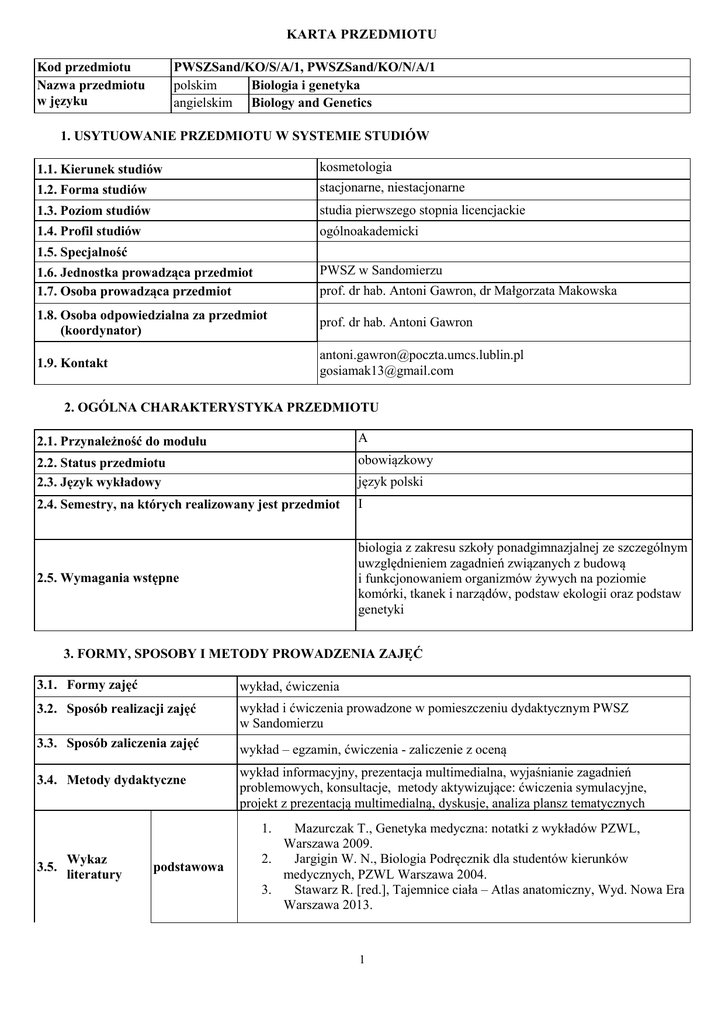 KARTA PRZEDMIOTU Kod przedmiotu Nazwa przedmiotu w języku PWSZSand/KO/S/A/1, PWSZSand/KO/N/A/1 polskim Biologia i genetyka angielskim Biology and Genetics 1. USYTUOWANIE PRZEDMIOTU W SYSTEMIE STUDIÓW 1.1. Kierunek studiów kosmetologia 1.2. Forma studiów stacjonarne, niestacjonarne 1.3. Poziom studiów studia pierwszego stopnia licencjackie 1.4. Profil studiów ogólnoakademicki 1.5. Specjalność 1.6. Jednostka prowadząca przedmiot 1.7. Osoba prowadząca przedmiot PWSZ w Sandomierzu prof. dr hab. Antoni Gawron, dr Małgorzata Makowska 1.8. Osoba odpowiedzialna za przedmiot (koordynator) prof. dr hab. Antoni Gawron 1.9. Kontakt [email protected] [email protected] 2. OGÓLNA CHARAKTERYSTYKA PRZEDMIOTU 2.1. Przynależność do modułu A 2.2. Status przedmiotu 2.3. Język wykładowy obowiązkowy 2.4. Semestry, na których realizowany jest przedmiot I 2.5. Wymagania wstępne biologia z zakresu szkoły ponadgimnazjalnej ze szczególnym uwzględnieniem zagadnień związanych z budową i funkcjonowaniem organizmów żywych na poziomie komórki, tkanek i narządów, podstaw ekologii oraz podstaw genetyki język polski 3. FORMY, SPOSOBY I METODY PROWADZENIA ZAJĘĆ 3.1. Formy zajęć wykład, ćwiczenia 3.2. Sposób realizacji zajęć wykład i ćwiczenia prowadzone w pomieszczeniu dydaktycznym PWSZ w Sandomierzu 3.3. Sposób zaliczenia zajęć wykład – egzamin, ćwiczenia - zaliczenie z oceną 3.4. Metody dydaktyczne wykład informacyjny, prezentacja multimedialna, wyjaśnianie zagadnień problemowych, konsultacje, metody aktywizujące: ćwiczenia symulacyjne, projekt z prezentacją multimedialną, dyskusje, analiza plansz tematycznych Mazurczak T., Genetyka medyczna: notatki z wykładów PZWL, Warszawa 2009. 2. Jargigin W. N., Biologia Podręcznik dla studentów kierunków medycznych, PZWL Warszawa 2004. 3. Stawarz R. [red.], Tajemnice ciała – Atlas anatomiczny, Wyd. Nowa Era Warszawa 2013. 1. 3.5. Wykaz literatury podstawowa 1 1. Passarge E., Genetyka Ilustrowany przewodnik. PZWL Warszawa 2004. uzupełniająca 2. Fletcher H. L., Hickey G.I., Winter P.C., Genetyka, Wyd. Nauk. PWN 3. Goździcka-Józefiak A., Bobowicz M.A,, Kędzia H., Genetyka molekularna i biochemia wybranych chorób u ludzi, Wyd. UAM Poznań 2001. 4. CELE, TREŚCI I EFEKTY KSZTAŁCENIA 4.1. Cele przedmiotu C.1. Przedmiot pozwala nabyć umiejętności i kompetencje dotyczące podstawowych zagadnień z biologii ogólnej i genetyki. C.2. Zaznajomienie z teoriami pochodzenia życia, składem i budową żywego organizmu oraz czynnościami życiowymi na poziomie komórek, tkanek i narządów. C.3. Zapoznanie z podstawami cytogentyki oraz podstaw genetyki klasycznej, populacyjnej i molekularnej. C.4. Przedstawienie mechanizmów ewolucyjnych, filogenezy i ontogenezy, zasad dziedziczenia, różnicowania komórek oraz podstawowych mechanizmów mutagenezy i nowotworzenia. 4.2. Treści programowe 1. Cechy żywych organizmów. Przejawy życia: metabolizm, rozmnażanie, reakcja na bodźce. Powstanie życia na Ziemi: ewolucja chemiczna, ewolucja prebiotyczna (hipotezy). Jedność organizacji molekularnej organizmów: makro- i mikropierwiastki, pierwiastki śladowe. Pierwiastki trujące. Budowa i funkcje związków organicznych: węglowodany, lipidy, białka, kwasy nukleinowe: DNA, RNA. 2. Podstawy genetyki. Chromatyna, chromosomy. Mitoza i mejoza. Prawa dziedziczenia Mendla, Morgana. Zmienność organizmów - mutacje i rekombinacje. Dziedziczenie jądrowe i plazmatyczne. Metody inżynierii genetycznej - organizmy modyfikowane genetycznie. Organizacja strukturalna i funkcjonalna genomów Prokariota i Eukariota. Genetyka człowieka. 3. Ewolucjonizm: teoria Darwina - Wallece'a. Ewolucjonizm syntetyczny - ewolucja genów. Tempo ewolucji. Pokrewieństwa organizmów; podstawy systematyki. Dwuimienne nazewnictwo biologiczne. 4. Cytofizjologia komórki. 5. Organizmy poziom życia: Komórkowa budowa organizmów. Organelle komórkowe i ich funkcje. Podobieństwa i różnice komórek bakteryjnych, roślinnych i zwierzęcych. Cykl komórkowy. Komórki macierzyste. Tkanki zwierzęce i ich funkcje. Mechanizm skurczu mięśnia, potencjał spoczynkowy i czynnościowy. Odporność immunologiczna. Homeostaza organizmu. Koordynująca rola układu nerwowego i hormonalnego. 6. Dziedziczenie –mechanizmy. 7. Determinacja płci. 8. Elementy ekologii. 9. Elementy parazytologii. 10. Wpływ środowiska na zmienność człowieka. 4.3. Efekty kształcenia Kod Student, który zaliczył przedmiot w zakresie WIEDZY: W01 Student rozumie podstawowe zjawiska i procesy oraz posiada podstawową wiedzę niezbędną dla kosmetologii w zakresie podstaw chemicznych, biologicznych, i biochemicznych. Odniesienie do efektów kształcenia dla kierunku dla obszaru K_W01 M1_W01 w zakresie UMIEJĘTNOŚCI: U01 Posiada umiejętność ustnej i pisemnej prezentacji własnych działań i sugestii. w zakresie KOMPETENCJI SPOŁECZNYCH: 2 K_U13 M1_U2 M1_U10 K01 Pracując w zespole – potrafi współdziałać i pracować w grupie; pełniąc w niej różnorodne role. K_K06 M1_K04 4.4. Metody weryfikacji efektów kształcenia Forma oceny Efekt Egzamin Egzamin Projekt kształcenia ustny pisemny W01 U01 K01 4.5. Efekt kształcenia W01 U01 K01 x x x x Kolokwia pisemne x Zadania do Referat Ćwiczenia Dyskusje wykonania Sprawozdanie aktywizujące x x x x x x x x x x x Kryteria jakościowe uzyskania oceny w danym zakresie efektów kształcenia ocena dostateczny/dostateczny plus dobry/ dobry plus bardzo dobry (3/ 3,5) (4/ 4,5) (5) Zna wybrane terminy Zna większość terminów Zna wszystkie wymagane terminy dotyczące zjawisk i procesów opisujących zjawiska i procesy opisujące zjawiska i procesy zachodzących w żywych zachodzące w żywych zachodzące w żywych organizmach organizmach oraz posiada organizmach oraz posiada oraz posiada poszerzoną wiedzę podstawową wiedzę niezbędną podstawową wiedzę niezbędną niezbędną dla kosmetologii dla kosmetologii w zakresie dla kosmetologii