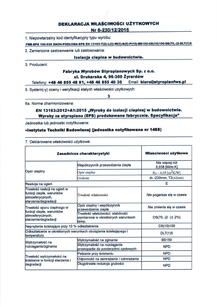 V eSciu,o6cl uiytko\lr€ okrsSlon€go powy2ej wyrobu 3q zgodne z zesta\ttBm deklerowenych