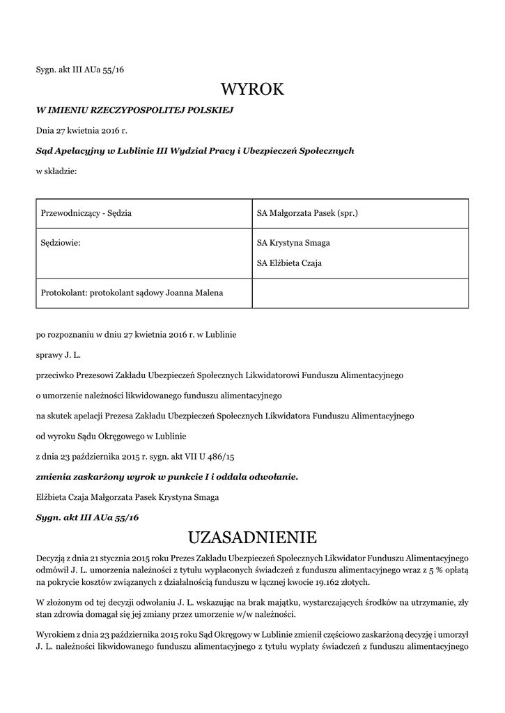 Sygn. akt III AUa 55/16 WYROK W IMIENIU RZECZYPOSPOLITEJ POLSKIEJ Dnia 27 kwietnia 2016 r. Sąd Apelacyjny w Lublinie III Wydział Pracy i Ubezpieczeń Społecznych w składzie: Przewodniczący - Sędzia SA Małgorzata Pasek (spr.) Sędziowie: SA Krystyna Smaga SA Elżbieta Czaja Protokolant: protokolant sądowy Joanna Malena po rozpoznaniu w dniu 27 kwietnia 2016 r. w Lublinie sprawy J. L. przeciwko Prezesowi Zakładu Ubezpieczeń Społecznych Likwidatorowi Funduszu Alimentacyjnego o umorzenie należności likwidowanego funduszu alimentacyjnego na skutek apelacji Prezesa Zakładu Ubezpieczeń Społecznych Likwidatora Funduszu Alimentacyjnego od wyroku Sądu Okręgowego w Lublinie z dnia 23 października 2015 r. sygn. akt VII U 486/15 zmienia zaskarżony wyrok w punkcie I i oddala odwołanie. Elżbieta Czaja Małgorzata Pasek Krystyna Smaga Sygn. akt III AUa 55/16 UZASADNIENIE Decyzją z dnia 21 stycznia 2015 roku Prezes Zakładu Ubezpieczeń Społecznych Likwidator Funduszu Alimentacyjnego odmówił J. L. umorzenia należności z tytułu wypłaconych świadczeń z funduszu alimentacyjnego wraz z 5 % opłatą na pokrycie kosztów związanych z działalnością funduszu w łącznej kwocie 19.162 złotych. W złożonym od tej decyzji odwołaniu J. L. wskazując na brak majątku, wystarczających środków na utrzymanie, zły stan zdrowia domagał się jej zmiany przez umorzenie w/w należności. Wyrokiem z dnia 23 października 2015 roku Sąd Okręgowy w Lublinie zmienił częściowo zaskarżoną decyzję i umorzył J. L. należności likwidowanego funduszu alimentacyjnego z tytułu wypłaty świadczeń z funduszu alimentacyjnego oraz 5 % opłaty na pokrycie kosztów związanych z działalnością funduszu w kwocie 5.000 złotych, w pozostałej części odwołanie oddalił. Sąd pierwszej instancji ustalił, że J. L. urodzony (...) ukończył szkołę rolniczą i przez cały okres aktywności zawodowej pracował w rolnictwie. Jest właścicielem gospodarstwa rolnego o pow. 2,3464 ha fizycznych, którego ostatnio, z uwagi na stan zdrowia nie uprawia. Wnioskodawca w 2013 roku korzystał z pomocy Ośrodka Pomocy(...)w K. w postaci jednorazowych specjalnych zasiłków celowych na zakup węgla w styczniu i listopadzie. Zadłużenie wnioskodawcy wobec Funduszu Alimentacyjnego wynosi 19.162 złotych. J. L. od dnia 15 sierpnia 2014 roku do dnia 26 sierpnia 2015 roku otrzymywał zasiłek chorobowy. Decyzją KRUS z dnia 22 września 2015 roku przyznano mu od dnia 27 sierpnia 2015 roku do dnia 31 sierpnia 2017 roku prawo do renty rolniczej z tytułu całkowitej niezdolności do pracy. Świadczenie jest wypłacane w wysokości 50 % i wynosi 566,49 złotych. Odwołujący posiadał zadłużenie z tytułu składek, które potrącono z renty. Na leki wydaje od 100 do 200 złotych miesięcznie. Wnioskodawca mieszka w budynku należącym do siostry, która ponosi koszty utrzymania nieruchomości, z uwagi na trudną sytuację brata. J. L. nie ma nikogo na utrzymaniu. Choruje przewlekle z powodu dolegliwości prawego biodra od 2013 roku. W związku z tym, że nie mógł pracować, posiadane gospodarstwo wydzierżawił sąsiadowi, który je obecnie uprawia i opłaca podatek gruntowy. Sąd Okręgowy ustalił stan faktyczny w oparciu o dowody z dokumentów znajdujące się w aktach ZUS i KRUS oraz zeznania odwołującego, które to dowody uznał za wiarygodne. Powołując treść przepisu art. 68 ust. 1 ustawy z dnia 28 listopada 2003 roku o świadczeniach rodzinnych (tekst jedn. Dz.U.2015.114 ze zm.) Sąd ocenił, że odwołanie wnioskodawcy jest częściowo zasadne. Sąd wskazał, że w szczególnie uzasadnionych przypadkach związanych z sytuacją zdrowotną lub rodzinną osoby, przeciwko której jest prowadzona egzekucja alimentów, likwidator może umorzyć należności likwidowanego funduszu z tytułu wypłaconych z funduszu świadczeń. Ustawodawca nie sprecyzował jak należy rozumieć owe szczególne uzasadnione przypadki jednakże wskazał, iż dotyczyć mają one sytuacji zdrowotnej lub rodzinnej osoby dłużnika. Przyjmuje się, że przez szczególnie uzasadnione okoliczności należy rozumieć chorobę dłużnika lub członków jego rodziny, nad którymi osoba zobowiązana do spłaty należności sprawuje bezpośrednią opiekę uniemożliwiającą pozyskanie dochodów niezbędnych do podjęcia spłaty zadłużenia, bezskuteczność egzekucji, ubóstwo zagrażające dalszej egzystencji dłużnika poprzez niezapewnienie minimum socjalnego w zakresie, który uniemożliwia spłatę zadłużenia w dłuższym okresie czasu, zdarzenia losowe, klęski żywiołowe. Sąd pierwszej instancji zwrócił uwagę, że w orzecznictwie i doktrynie podnosi się, że szczególnie uzasadnione przypadki, o których mowa w art. 68 ust. 1 w/w ustawy, to sytuacje wyjątkowe, które powstały w wyniku wypadku losowego, a w każdym razie niezależnie od zobowiązanego, w ich następstwie jego sytuacja uległa takiemu pogorszeniu, że nie jest on w stanie na bieżąco spłacać swoich bieżących należności, a nadto nie ma perspektywy poprawy i zmiany tej sytuacji. Katalog okoliczności związanych z sytuacją zdrowotną lub rodzinną zobowiązanego wnioskodawcy nie został wprawdzie określony w przepisach, ale niewątpliwie można wskazać na: liczebność rodziny pozostającej na utrzymaniu zobowiązanego, brak majątku, z którego możliwe byłoby dochodzenie od osoby zobowiązanej zobowiązania pieniężnego, ustalenie, że w przypadku zwrotu osoba zobowiązana lub osoby pozostające na jej utrzymaniu zostałyby pozbawione niezbędnych środków utrzymania, wiek osoby zobowiązanej, zdarzenia losowe (choroba, kradzież, wypadek, pożar, powódź, inne klęski żywiołowe, itp.), powodujące szczególne trudności w sytuacji materialnej osoby zobowiązanej. W ocenie Sądu Okręgowego sytuacja zdrowotna wnioskodawcy uległa w 2013 roku zmianie, czego efektem jest stwierdzenie całkowitej niezdolności do pracy w gospodar