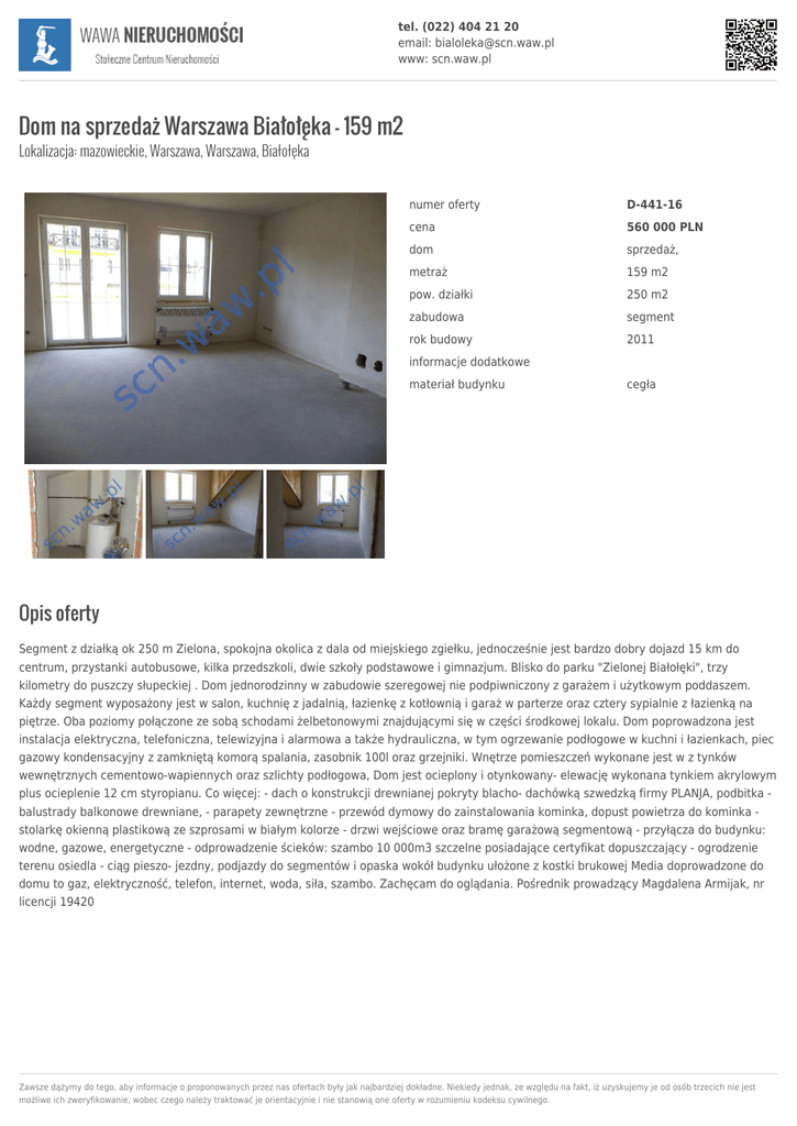 tel. (022) 404 21 20 email: [email protected] www: scn.waw.pl Dom na sprzedaż Warszawa Białołęka - 159 m2 Lokalizacja: mazowieckie, Warszawa, Warszawa, Białołęka numer oferty D-441-16 cena 560 000 PLN dom sprzedaż, metraż 159 m2 pow. działki 250 m2 zabudowa segment rok budowy 2011 informacje dodatkowe materiał budynku cegła Opis oferty Segment z działką ok 250 m Zielona, spokojna okolica z dala od miejskiego zgiełku, jednocześnie jest bardzo dobry dojazd 15 km do centrum, przystanki autobusowe, kilka przedszkoli, dwie szkoły podstawowe i gimnazjum. Blisko do parku "Zielonej Białołęki", trzy kilometry do puszczy słupeckiej . Dom jednorodzinny w zabudowie szeregowej nie podpiwniczony z garażem i użytkowym poddaszem. Każdy segment wyposażony jest w salon, kuchnię z jadalnią, łazienkę z kotłownią i garaż w parterze oraz cztery sypialnie z łazienką na piętrze. Oba poziomy połączone ze sobą schodami żelbetonowymi znajdującymi się w części środkowej lokalu. Dom poprowadzona jest instalacja elektryczna, telefoniczna, telewizyjna i alarmowa a także hydrauliczna, w tym ogrzewanie podłogowe w kuchni i łazienkach, piec gazowy kondensacyjny z zamkniętą komorą spalania, zasobnik 100l oraz grzejniki. Wnętrze pomieszczeń wykonane jest w z tynków wewnętrznych cementowo-wapiennych oraz szlichty podłogowa, Dom jest ocieplony i otynkowany- elewację wykonana tynkiem akrylowym plus ocieplenie 12 cm styropianu. Co więcej: - dach o konstrukcji drewnianej pokryty blacho- dachówką szwedzką firmy PLANJA, podbitka balustrady balkonowe drewniane, - parapety zewnętrzne - przewód dymowy do zainstalowania kominka, dopust powietrza do kominka stolarkę okienną plastikową ze szprosami w białym kolorze - drzwi wejściowe oraz bramę garażową segmentową - przyłącza do budynku: wodne, gazowe, energetyczne - odprowadzenie ścieków: szambo 10 000m3 szczelne posiadające certyfikat dopuszczający - ogrodzenie terenu osiedla - ciąg pieszo- jezdny, podjazdy do segmentów i opaska wokół budynku ułożone z kostki brukowej Media doprowadzone do domu to gaz, elektryczność, telefon, internet, woda, siła, szambo. Zachęcam do oglądania. Pośrednik prowadzący Magdalena Armijak, nr licencji 19420 Zawsze dążymy do tego, aby informacje o proponowanych przez nas ofertach były jak najbardziej dokładne. Niekiedy jednak, ze względu na fakt, iż uzyskujemy je od osób trzecich nie jest możliwe ich zweryfikowanie, wobec czego należy traktować je orientacyjnie i nie stanowią one oferty w rozumieniu kodeksu cywilnego. tel. (022) 404 21 20 email: [email protected] www: scn.waw.pl Lokalizacja Osoba kontaktowa Białołęka Nieruchomości województwo mazowieckie powiat Warszawa [email protected] miasto Warszawa dzielnica Białołęka Chętnie udzielę dodatkowych informacji związanych z tą ofertą. Zapraszam do kontaktu! tel. 725 56 56 00 Zawsze dążymy do tego, aby informacje o proponowanych przez nas ofertach były jak najbardziej dokładne. Niekiedy jednak, ze względu na fakt, iż uzyskujemy je od osób trzecich nie jest możliwe ich zweryfikowanie, wobec czego należy traktować je orientacyjnie i nie stanowią one oferty w rozumieniu kodeksu cywilnego.