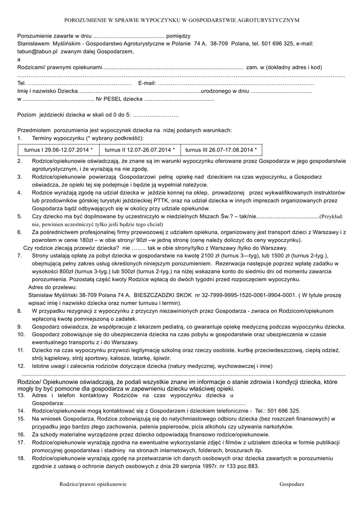 POROZUMIENIE W SPRAWIE WYPOCZYNKU W GOSPODARSTWIE AGROTURYSTYCZNYM ! Porozumienie zawarte w dniu ............................................ pomiędzy Stanisławem Myślińskim - Gospodarstwo Agroturystyczne w Polanie 74 A, 38-709 Polana, tel. 501 696 325, e-mail: [email protected] zwanym dalej Gospodarzem, a Rodzicami/ prawnymi opiekunami....................................................................................... zam. w (dokładny adres i kod) ………………………………………………………………………………………………………………………………………………………….. Tel. ……………………………………………..… E-mail: ………………………………………………………………………… Imię i nazwisko Dziecka............................................................................urodzonego w dniu ...................................... w ............................................ Nr PESEL dziecka ........................................... ! ! Poziom jeździecki dziecka w skali od 0 do 5: ……………………. Przedmiotem porozumienia jest wypoczynek dziecka na niżej podanych warunkach: 1. Terminy wypoczynku (* wybrany podkreślić): turnus I 29.06-12.07.2014 * turnus II 12.07-26.07.2014 * turnus III 26.07-17.08.2014 * 2. Rodzice/opiekunowie oświadczają, że znane są im warunki wypoczynku oferowane przez Gospodarza w jego gospodarstwie agroturystycznym, i że wyrażają na nie zgodę. 3. Rodzice/opiekunowie powierzają Gospodarzowi pełną opiekę nad dzieckiem na czas wypoczynku, a Gospodarz oświadcza, że opieki tej się podejmuje i będzie ją wypełniał należycie. 4. Rodzice wyrażają zgodę na udział dziecka w jeździe konnej na oklep, prowadzonej przez wykwalifikowanych instruktorów lub przodowników górskiej turystyki jeździeckiej PTTK, oraz na udział dziecka w innych imprezach organizowanych przez Gospodarza bądź odbywających się w okolicy przy udziale opiekunów. 5. Czy dziecko ma być dopilnowane by uczestniczyło w niedzielnych Mszach Św.? – tak/nie.......................................(Przykład: nie, powinien uczestniczyć tylko jeśli będzie tego chciał) 6. Za pośrednictwem profesjonalnej firmy przewozowej z udziałem opiekuna, organizowany jest transport dzieci z Warszawy i z powrotem w cenie 180zł – w obie strony/ 90zł –w jedną stronę (cenę należy doliczyć do ceny wypoczynku). Czy rodzice zlecają przewóz dziecka? nie …….. tak w obie strony/tylko z Warszawy /tylko do Warszawy. 7. Strony ustalają opłatę za pobyt dziecka w gospodarstwie na kwotę 2100 zł (turnus 3—tyg), lub 1500 zł (turnus 2-tyg.), obejmującą pełny zakres usług określonych niniejszym porozumieniem. Rezerwacja następuje poprzez wpłatę zadatku w wysokości 800zł (turnus 3-tyg.) lub 500zł (turnus 2-tyg.) na niżej wskazane konto do siedmiu dni od momentu zawarcia porozumienia. Pozostałą część kwoty Rodzice wpłacą do dwóch tygodni przed rozpoczęciem wypoczynku. Adres do przelewu: Stanisław Myśliński 38-709 Polana 74 A, BIESZCZADZKI SKOK nr 32-7999-9995-1520-0061-9904-0001. ( W tytule proszę wpisać imię i nazwisko dziecka oraz numer turnusu i termin). 8. W przypadku rezygnacji z wypoczynku z przyczyn niezawinionych przez Gospodarza - zwraca on Rodzicom/opiekunom wpłaconą kwotę pomniejszoną o zadatek. 9. Gospodarz oświadcza, że współpracuje z lekarzem pediatrą, co gwarantuje opiekę medyczną podczas wypoczynku dziecka. 10. Gospodarz zobowiązuje się do ubezpieczenia dziecka na czas pobytu w gospodarstwie oraz ubezpieczenia w czasie ewentualnego transportu z i do Warszawy. 11. Dziecko na czas wypoczynku przywozi legitymację szkolną oraz rzeczy osobiste, kurtkę przeciwdeszczową, ciepłą odzież, strój kąpielowy, strój sportowy, kalosze, latarkę, śpiwór. 12. Istotne uwagi i zalecenia rodziców dotyczące dziecka (natury medycznej, wychowawczej i inne) ........................................................................................................................................................................................................ Rodzice/ Opiekunowie oświadczają, że podali wszystkie znane im informacje o stanie zdrowia i kondycji dziecka, które mogły by być pomocne dla gospodarza w zapewnieniu dziecku właściwej opieki. 13. 14. 15. 16. 17. 18. ! Adres i telefon kontaktowy Rodziców na czas wypoczynku dziecka u Gospodarza:................................................................................................................ Rodzice/opiekunowie mogą kontaktować się z Gospodarzem i dzieckiem telefonicznie - Tel.: 501 696 325. Na wniosek Gospodarza, Rodzice zobowiązują się do natychmiastowego odbioru dziecka (bez roszczeń finansowych) w przypadku jego bardzo złego zachowania, palenia papierosów, picia alkoholu czy używania narkotyków. Za szkody materialne wyrządzone przez dziecko odpowiadają finansowo rodzice/opiekunowie. Rodzice/opiekunowie wyrażają zgodna na ewentualne wykorzystanie zdjęć i filmów z udziałem dziecka w formie publikacji promocyjnej gospodarstwa i stadniny na stronach internetowych, folderach, broszurach itp. Rodzice/opiekunowie wyrażają zgodę na przetwarzanie ich danych osobowych oraz dziecka zawartych w porozumieniu zgodnie z ustawą o ochronie danych osobowych z dnia 29 sierpnia 1997r. nr 133 poz.883. Rodzice/prawni opiekunowie ! ! ! ! ! ! ! Gospodarz